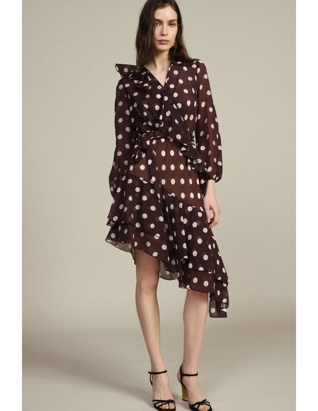 Deixa-te surpreender pelo efeito leve e arejado deste vestido curto de bolinhas, caracterizado por um corte evasê com bainha assimétrica. As mangas compridas franzidas e o cinto na cintura conferem uma silhueta feminina e vivaz. Perfeito para ocasiões especiais e para dar um toque animado ao teu dia.