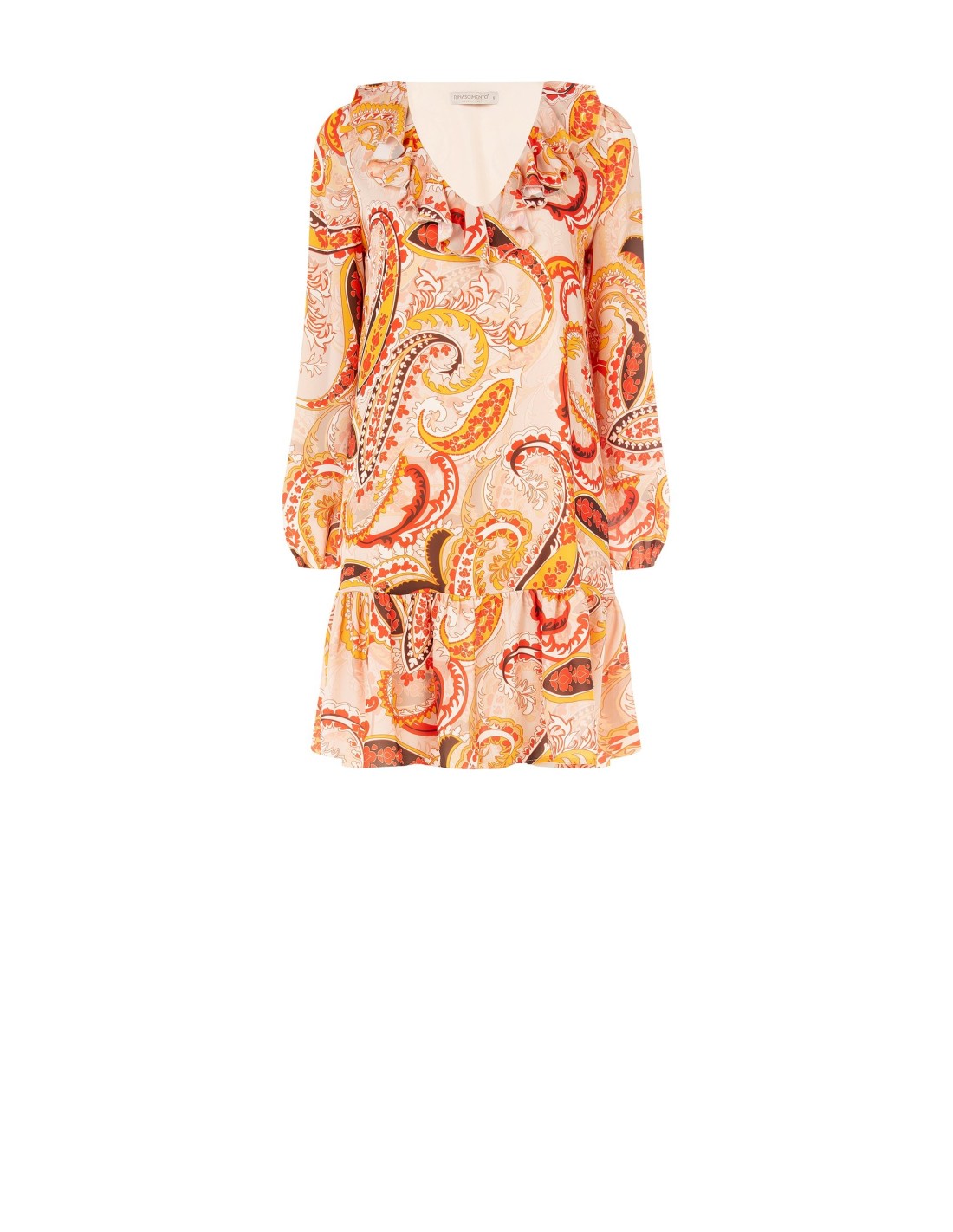 Vestido curto com corte trapézio, decote em V e folhos Rinascimento