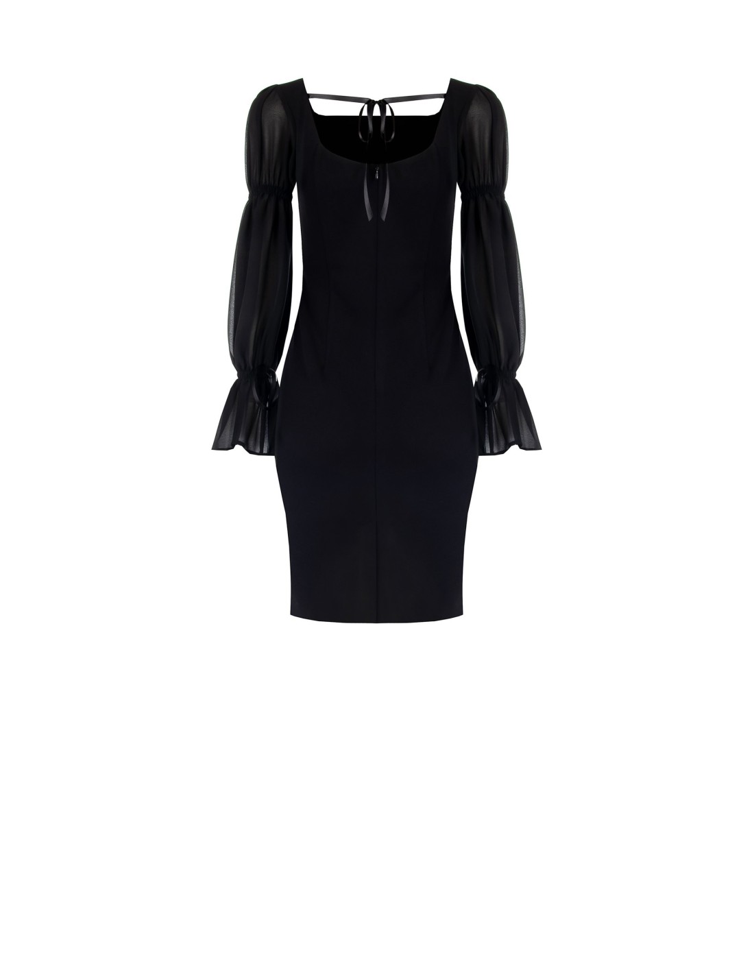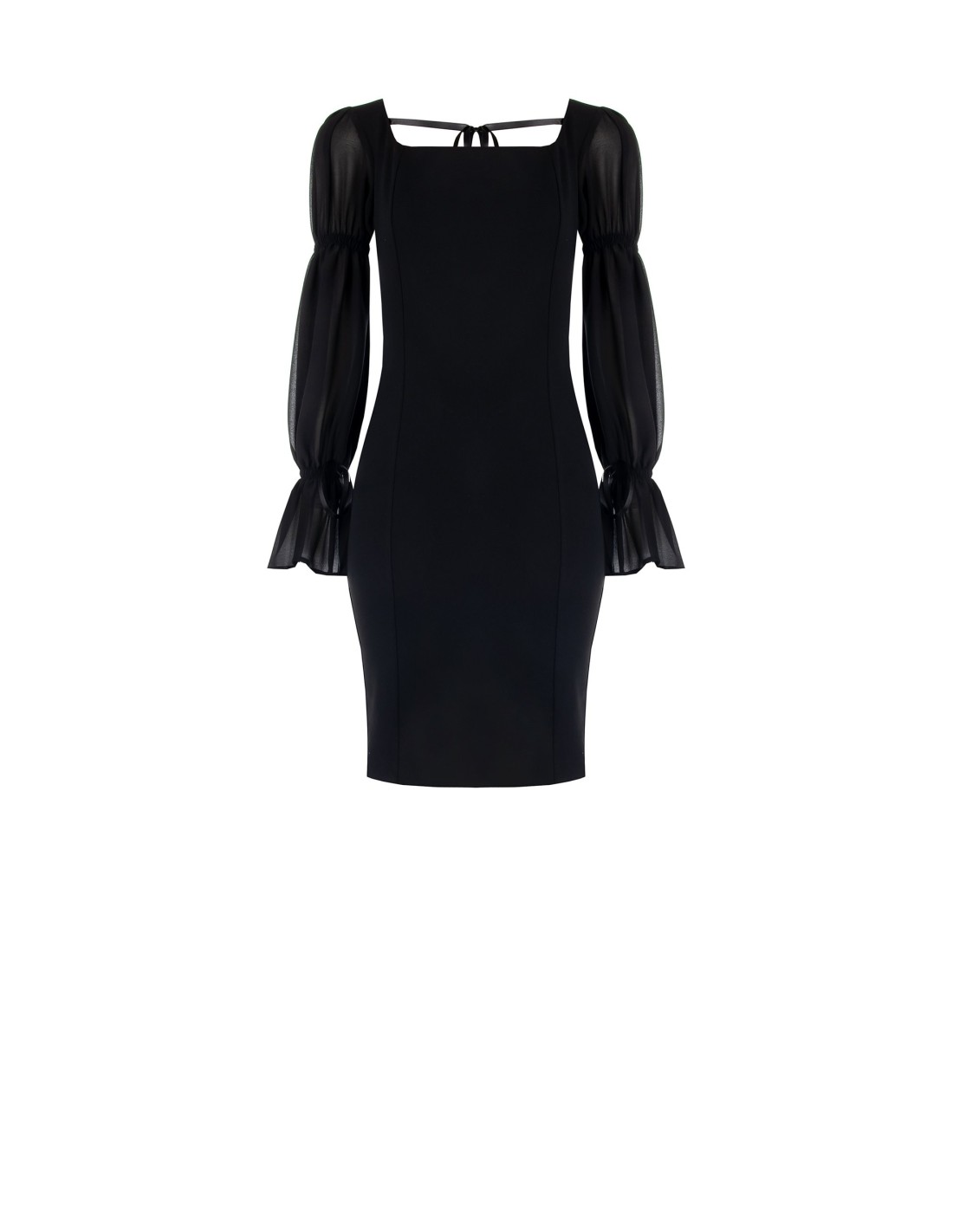 Vestido curto de corte justo em tecido stretch que esculpe a silhueta com conforto. As mangas compridas em georgette transparente, largas e franzidas no pulso com pequenos laços, e o decote quadrado com cordão na parte de trás tornam-no ideal para festas e jantares especiais.