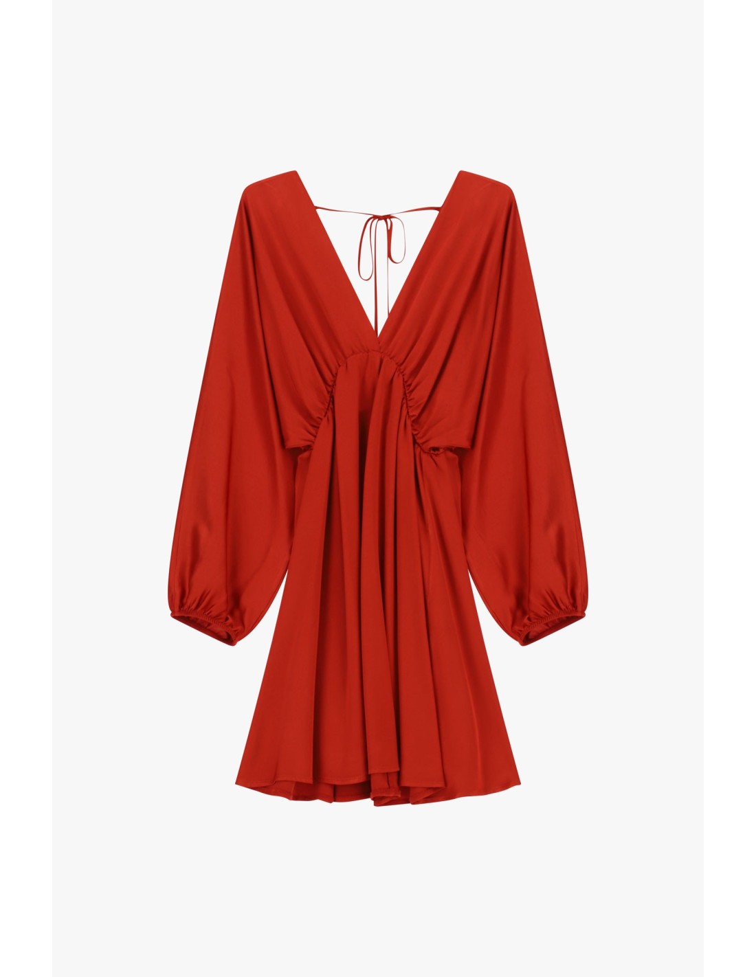 Deixa-te envolver pelo charme deste vestido curto caracterizado por linhas suaves, mangas compridas e largas e um decote profundo com detalhe de nó nas costas. O corte evasê confere movimento e leveza, perfeito para qualquer ocasião em que queiras sentir-te especial e confortável, da manhã à noite.