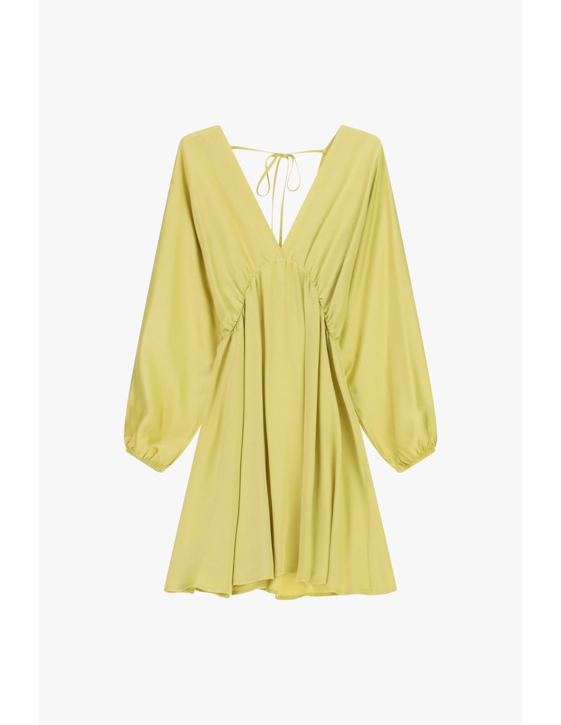 Deixa-te envolver pelo charme deste vestido curto caracterizado por linhas suaves, mangas compridas e largas e um decote profundo com detalhe de nó nas costas. O corte evasê confere movimento e leveza, perfeito para qualquer ocasião em que queiras sentir-te especial e confortável, da manhã à noite.