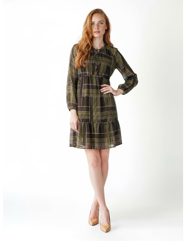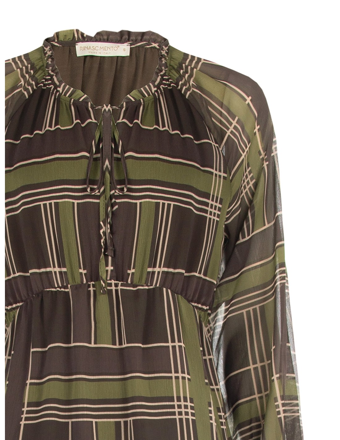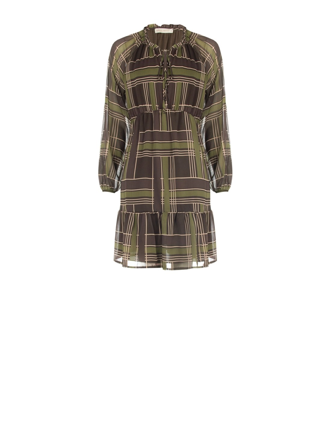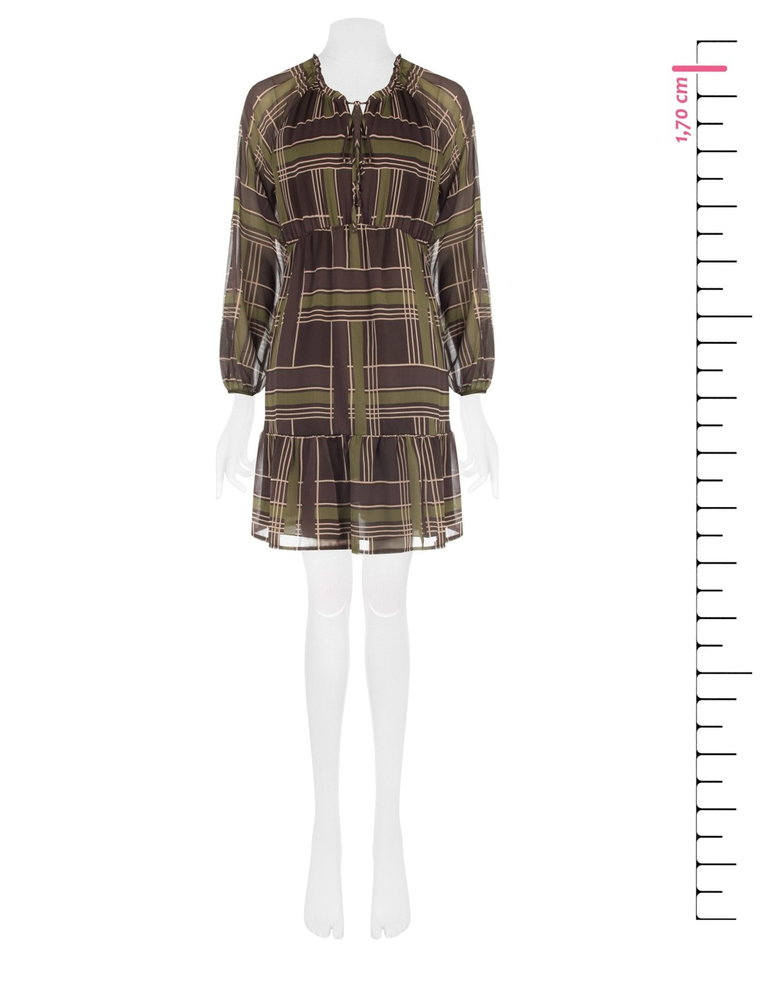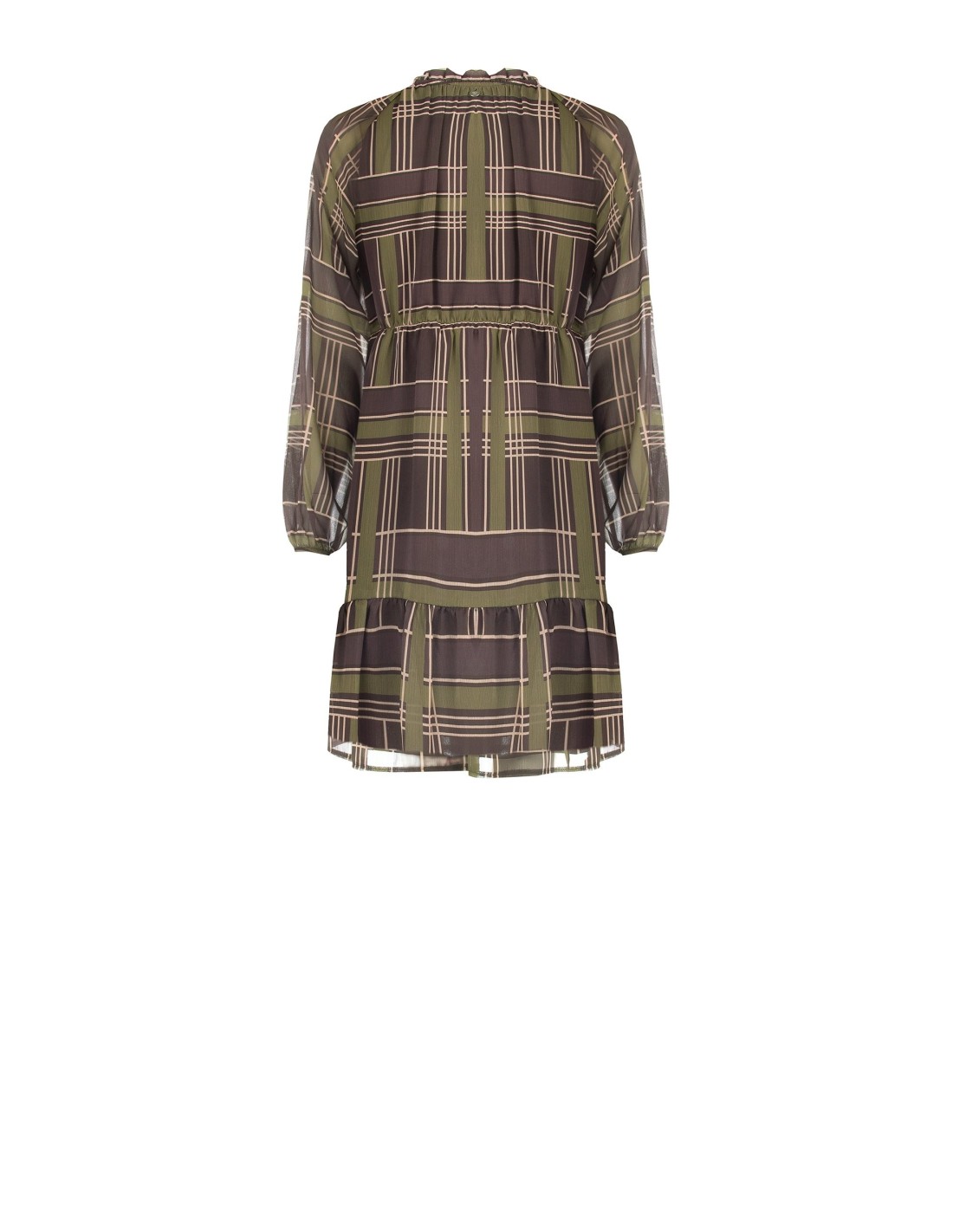 Curto e fluido, com corte evasé que valoriza a silhueta sem apertar. Confeccionado em georgette leve com textura velada e padrão gráfico. Decote franzido com cordões e folho na bainha, mangas suaves com punho elástico. Perfeito do escritório ao aperitivo, com botas ou sapatos de salto.