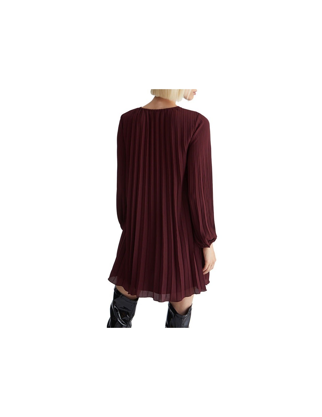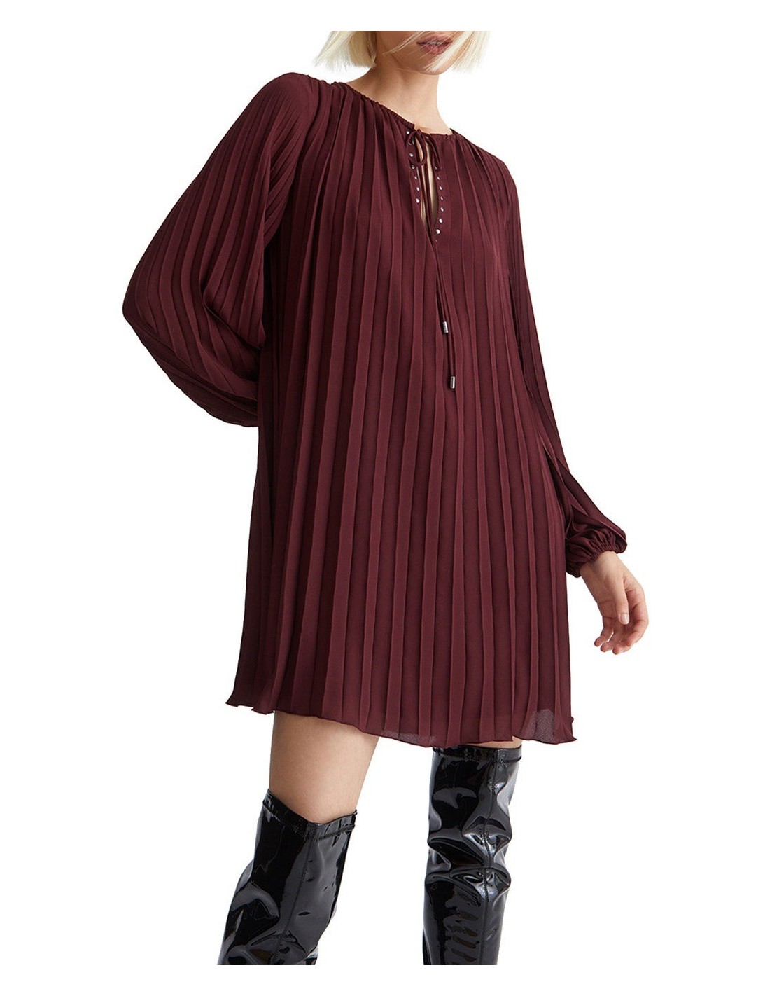 Vestido curto plissado, decote redondo com recorte em gota rematado por tachas com cordões, mangas compridas.