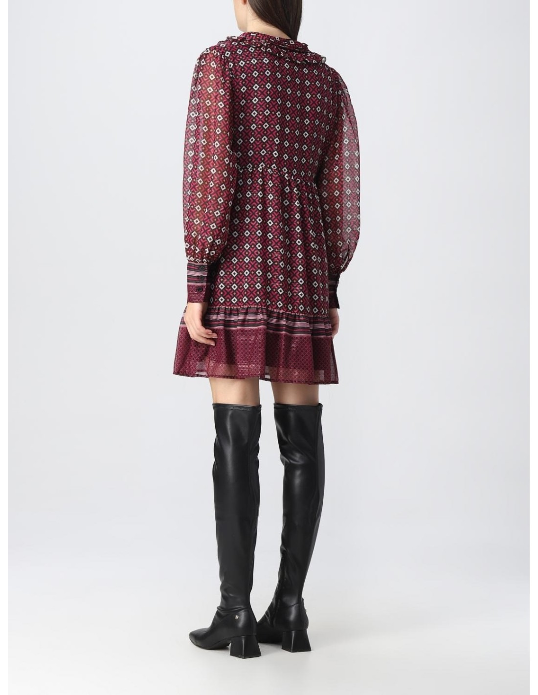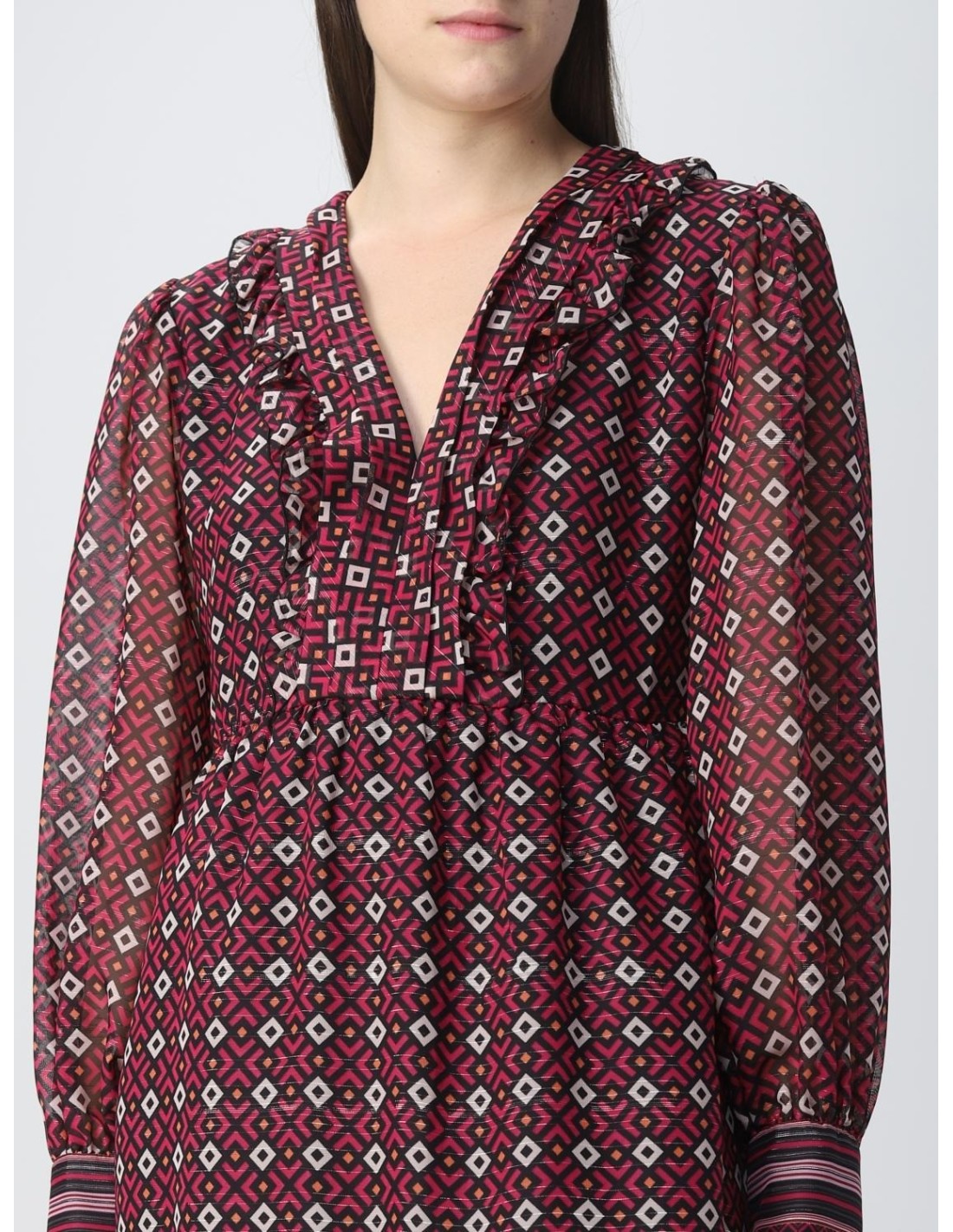 Vestido estampado geométrico, decote em V, folho na barra, mangas compridas.