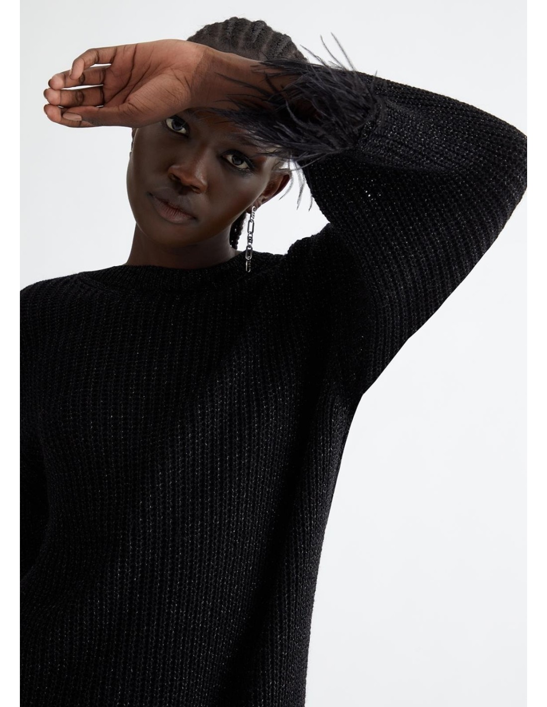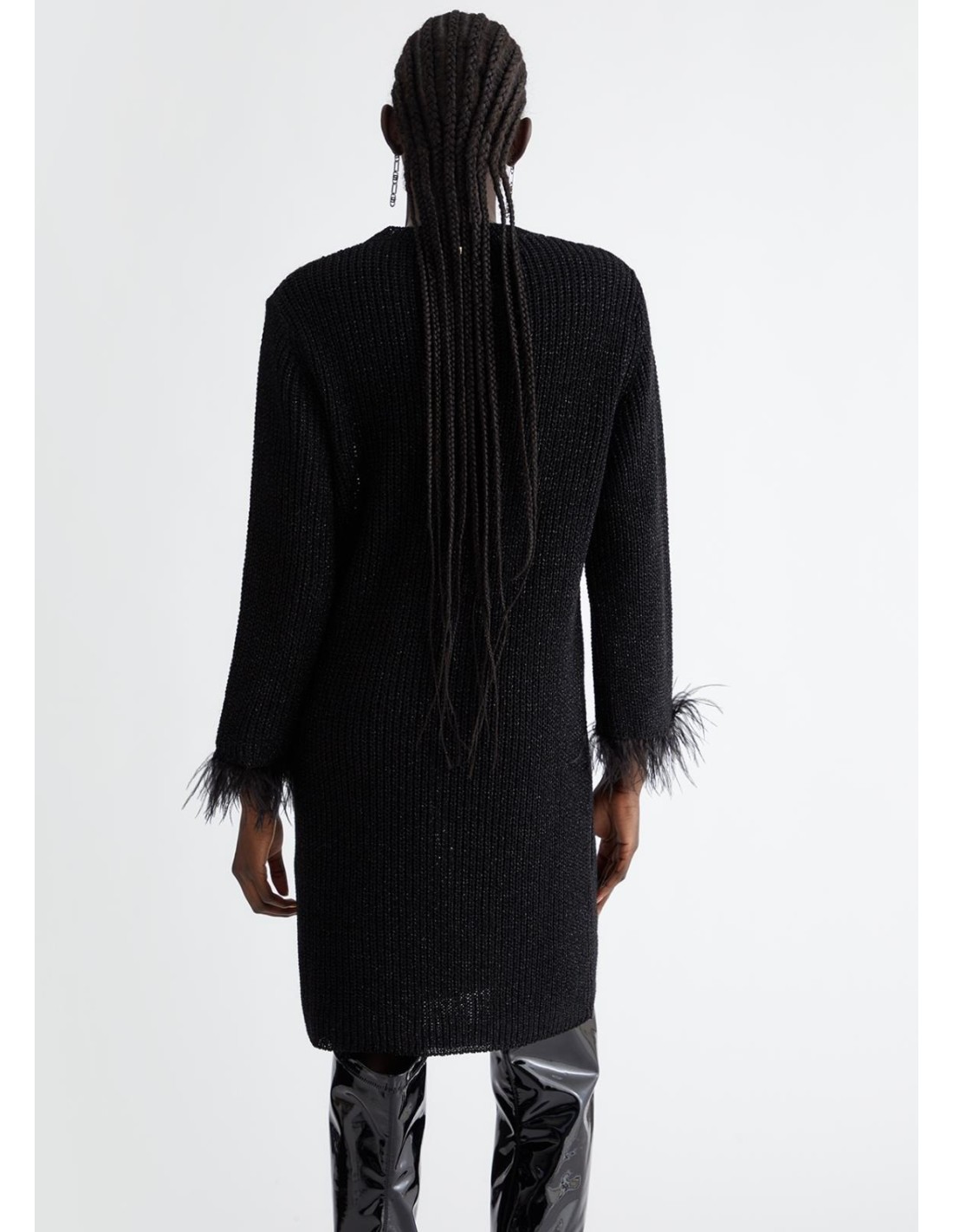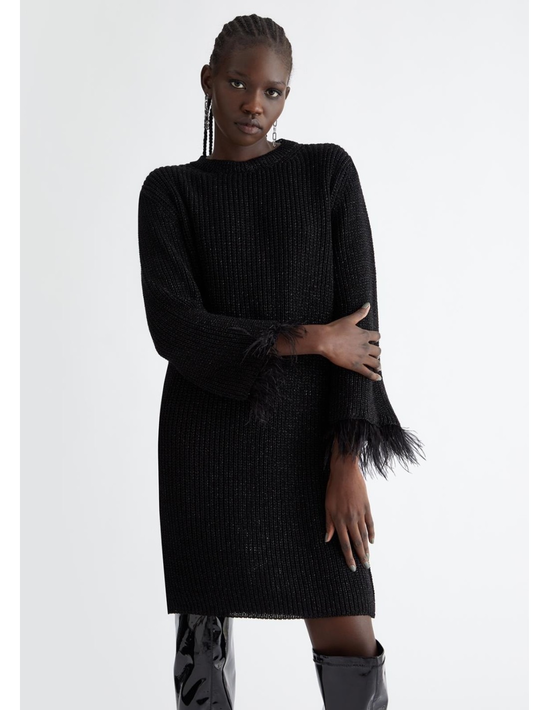 Vestido em malha com lurex e penas junto aos pulsos, gola redonda, mangas compridas.