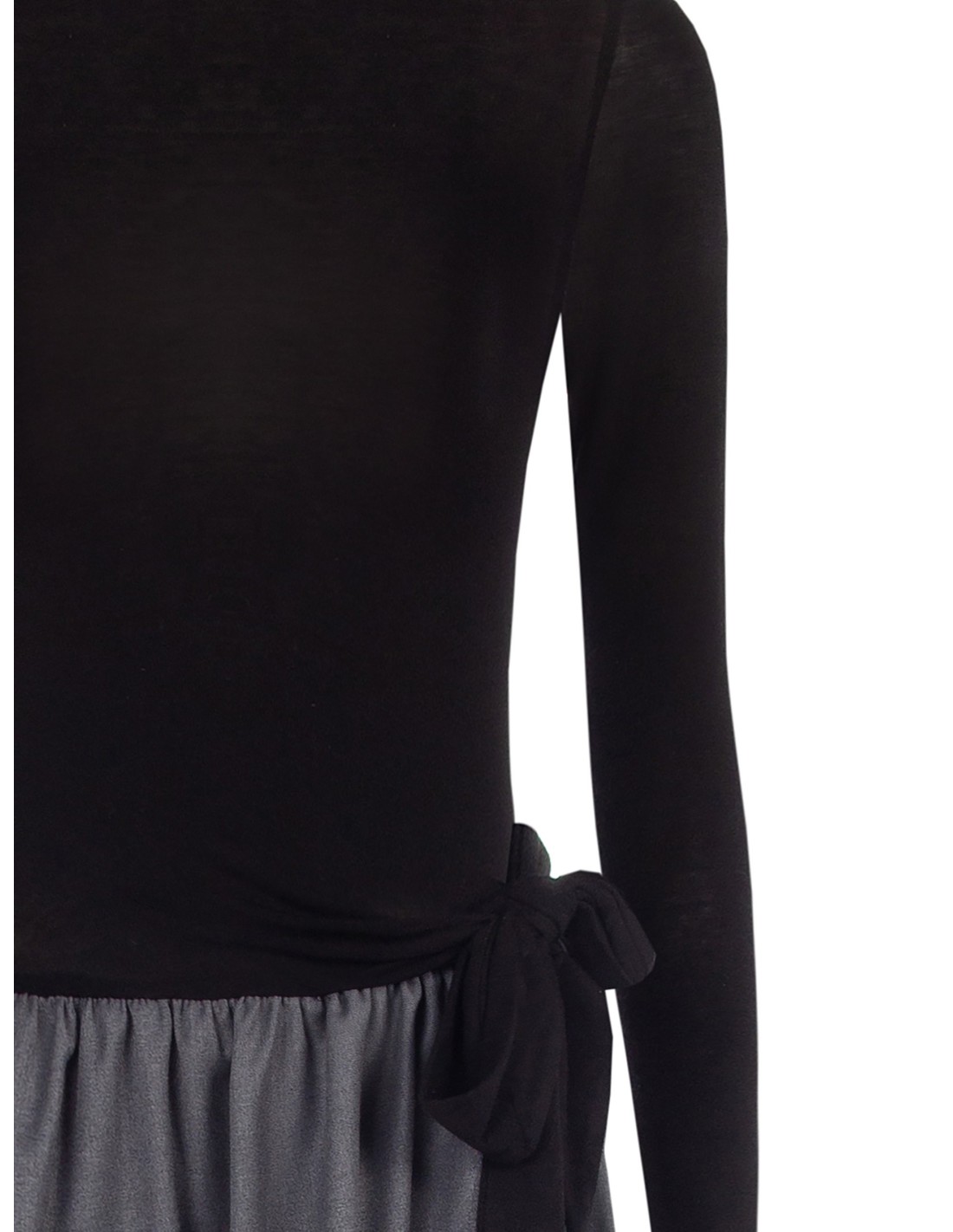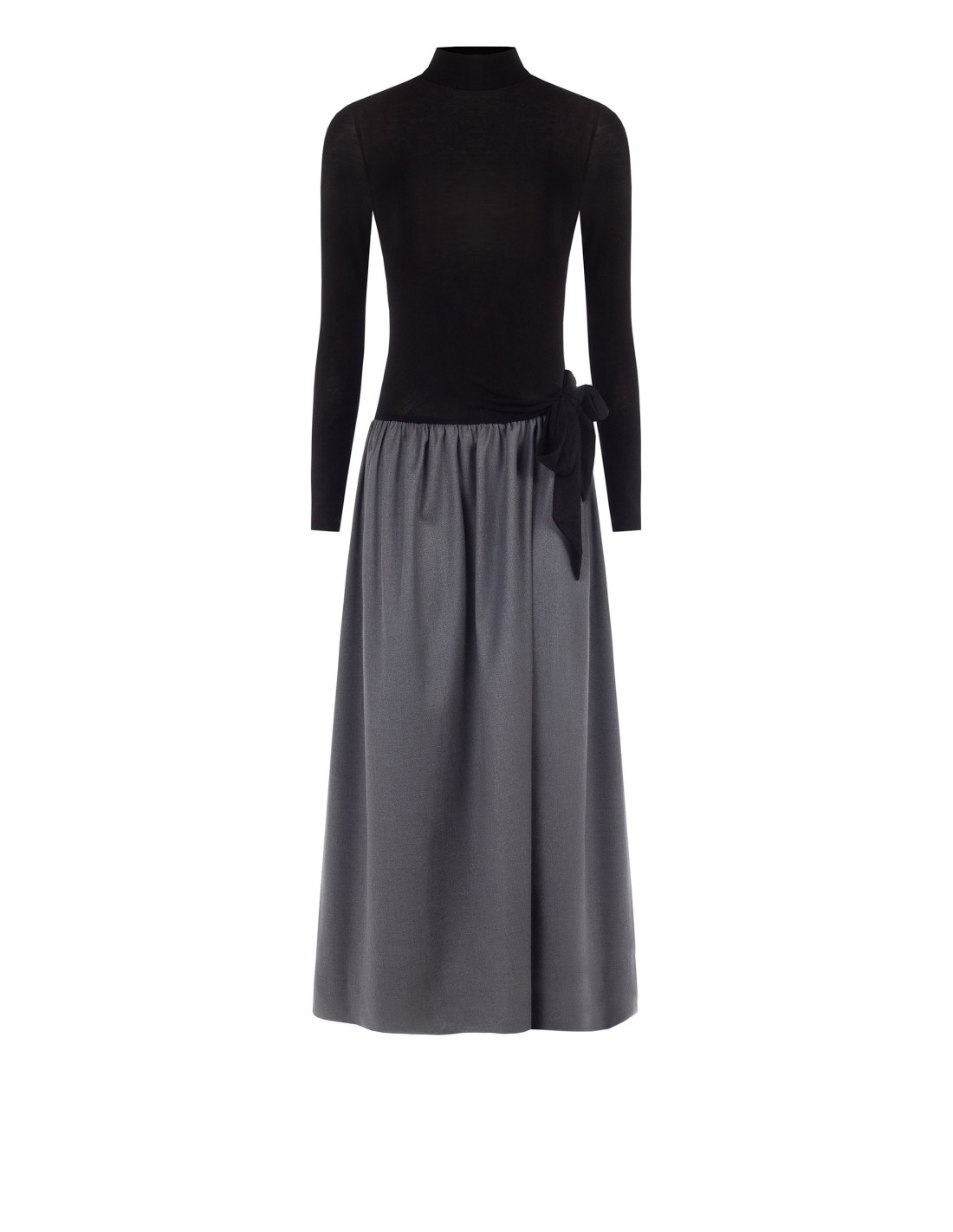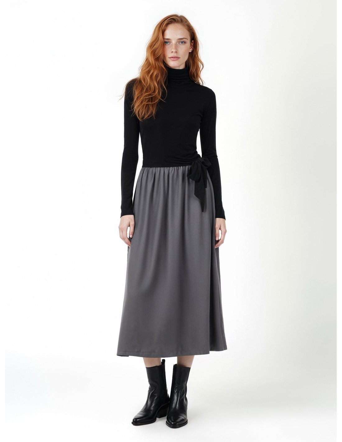 Rinascimento assina um vestido longo com corte evasé, efeito dois-em-um: top justo em jersey macio com gola alta, saia fluida em tecido com aspeto acetinado. O nó lateral realça a cintura e cria uma silhueta harmoniosa. Versátil do escritório ao pós-trabalho: confortável, feminino, pronto a usar.