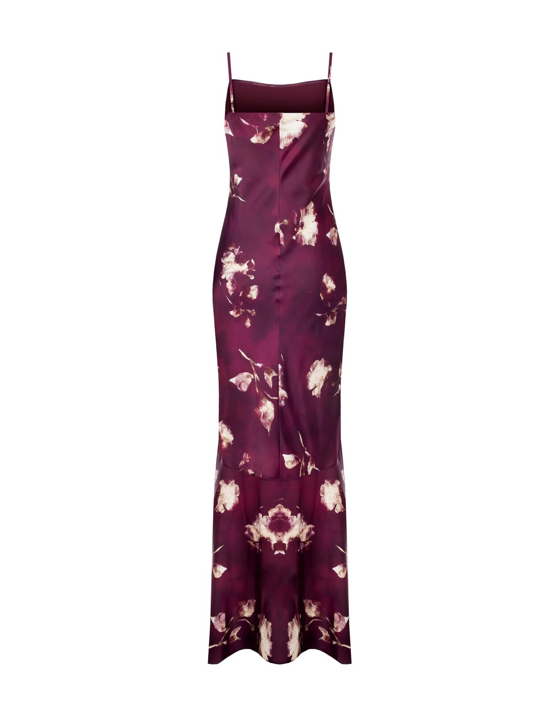 Vestido longo Rinascimento em cetim brilhante com estampado floral, envolve a silhueta com linha sereia suave e bainha evasé assimétrica que acompanha os movimentos. Decote suave e alças finas valorizam o decote: perfeito para cerimónias e festas noturnas.