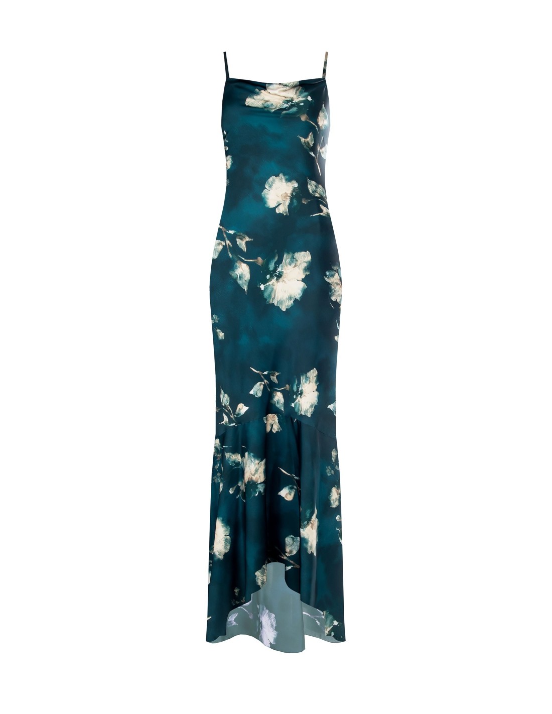 Vestido longo Rinascimento em cetim brilhante com estampado floral, envolve a silhueta com linha sereia suave e bainha evasé assimétrica que acompanha os movimentos. Decote suave e alças finas valorizam o decote: perfeito para cerimónias e festas noturnas.