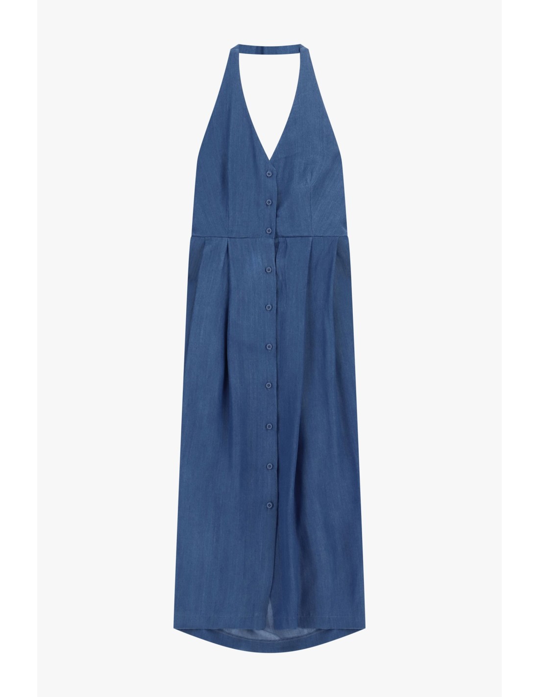Vestido longo de estilo fresco, com decote americano que valoriza os ombros e fecho de botões ao longo de toda a parte frontal. A linha evasê e o corte ligeiramente assimétrico na bainha oferecem grande conforto e movimento, perfeitos para os dias na cidade ou um passeio no parque.
