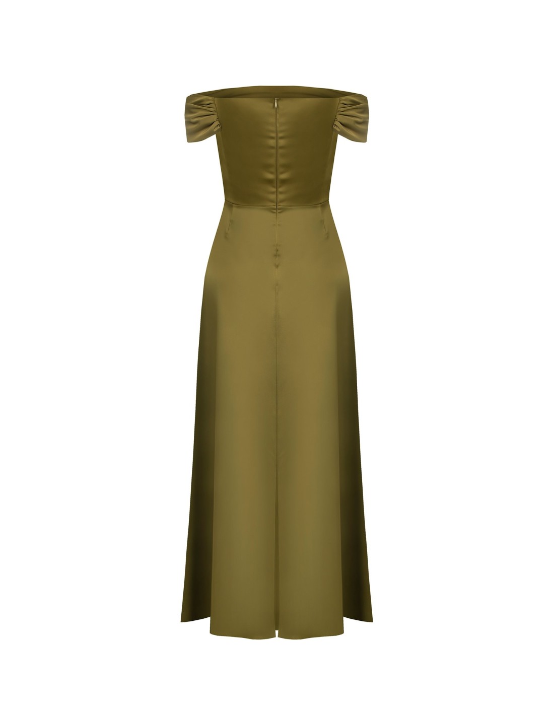 Vestido de corte justo no corpete e fluido na saia, em tecido acetinado de toque sedoso. O decote à Bardot e a estrutura interna sustentam e valorizam a silhueta, enquanto a racha lateral proporciona liberdade de movimento. Perfeito para cerimónias, festas e noites especiais.