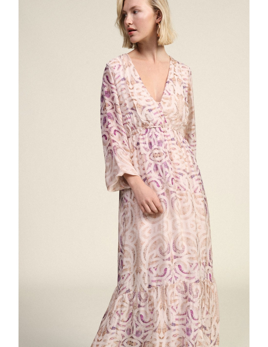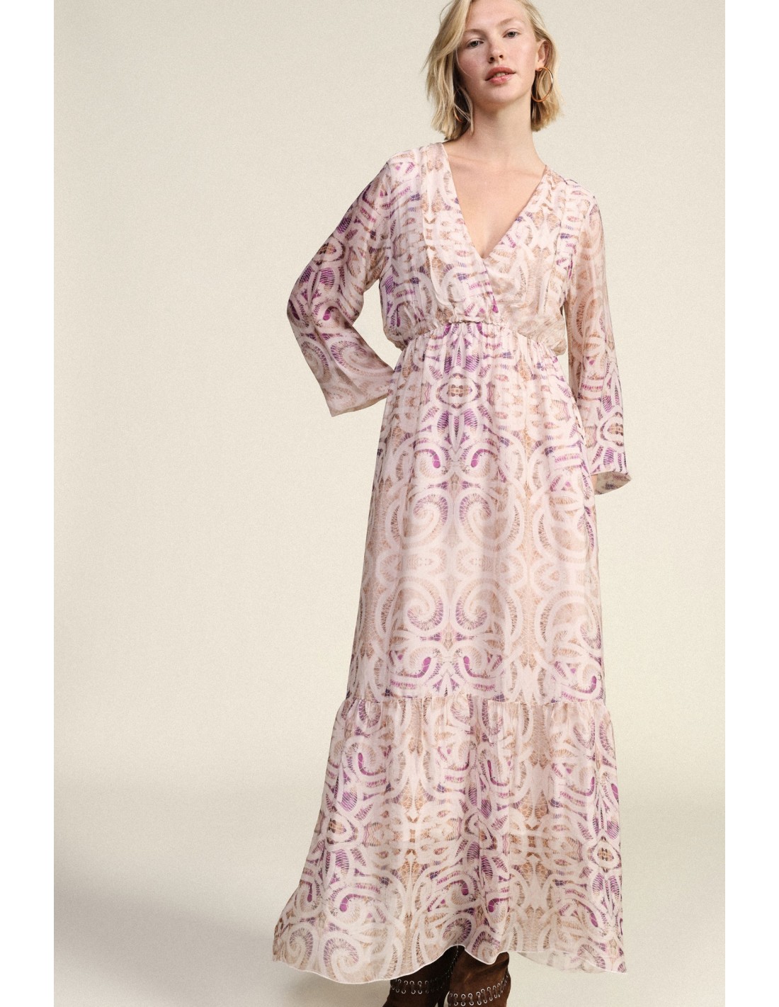 Deixe-se envolver pela leveza deste vestido longo com delicado estampado paisley. O decote em V e as mangas compridas com punhos suaves criam uma silhueta harmoniosa, enquanto o volante na bainha confere movimento. Perfeito para quem procura estilo e conforto da manhã à noite.