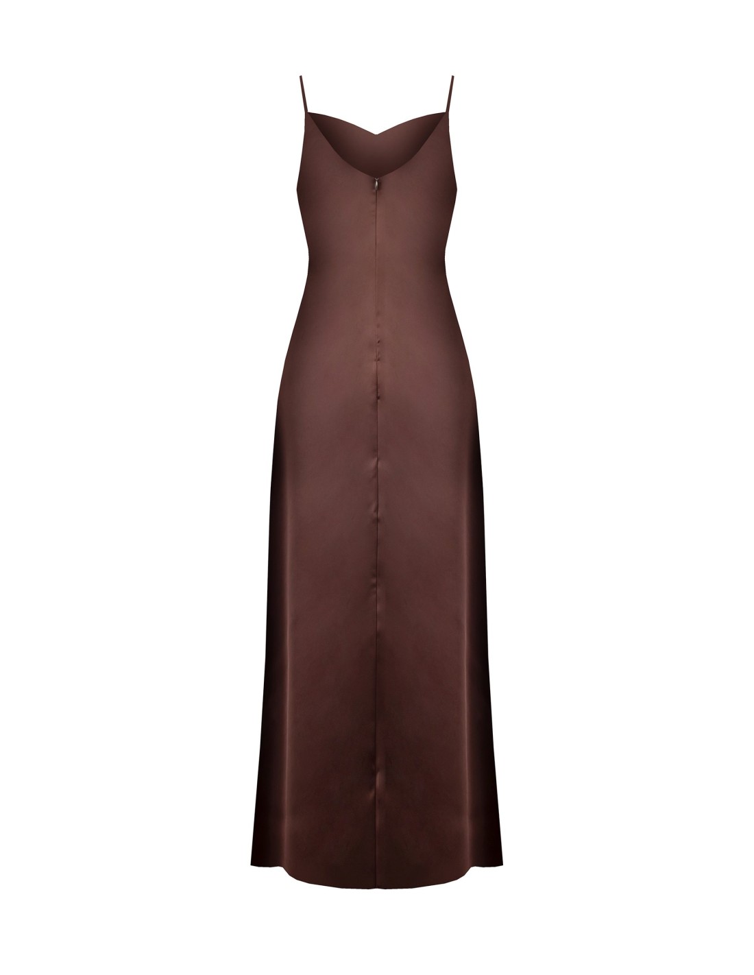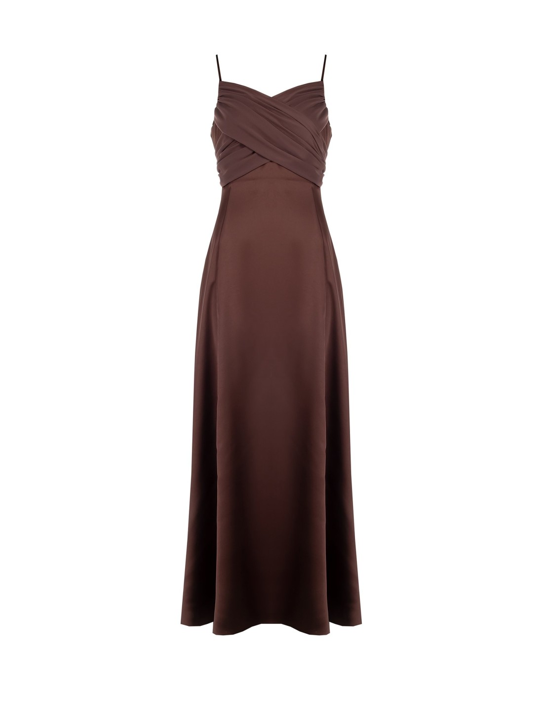 Vestido longo de corte fluido, pensado para acompanhar a silhueta com leveza. O cetim de toque fluido encontra um corpete em georgette com entrelaçado drapeado e decote em coração, para um efeito feminino e confortável. Ideal para cerimónias, festas e eventos noturnos.