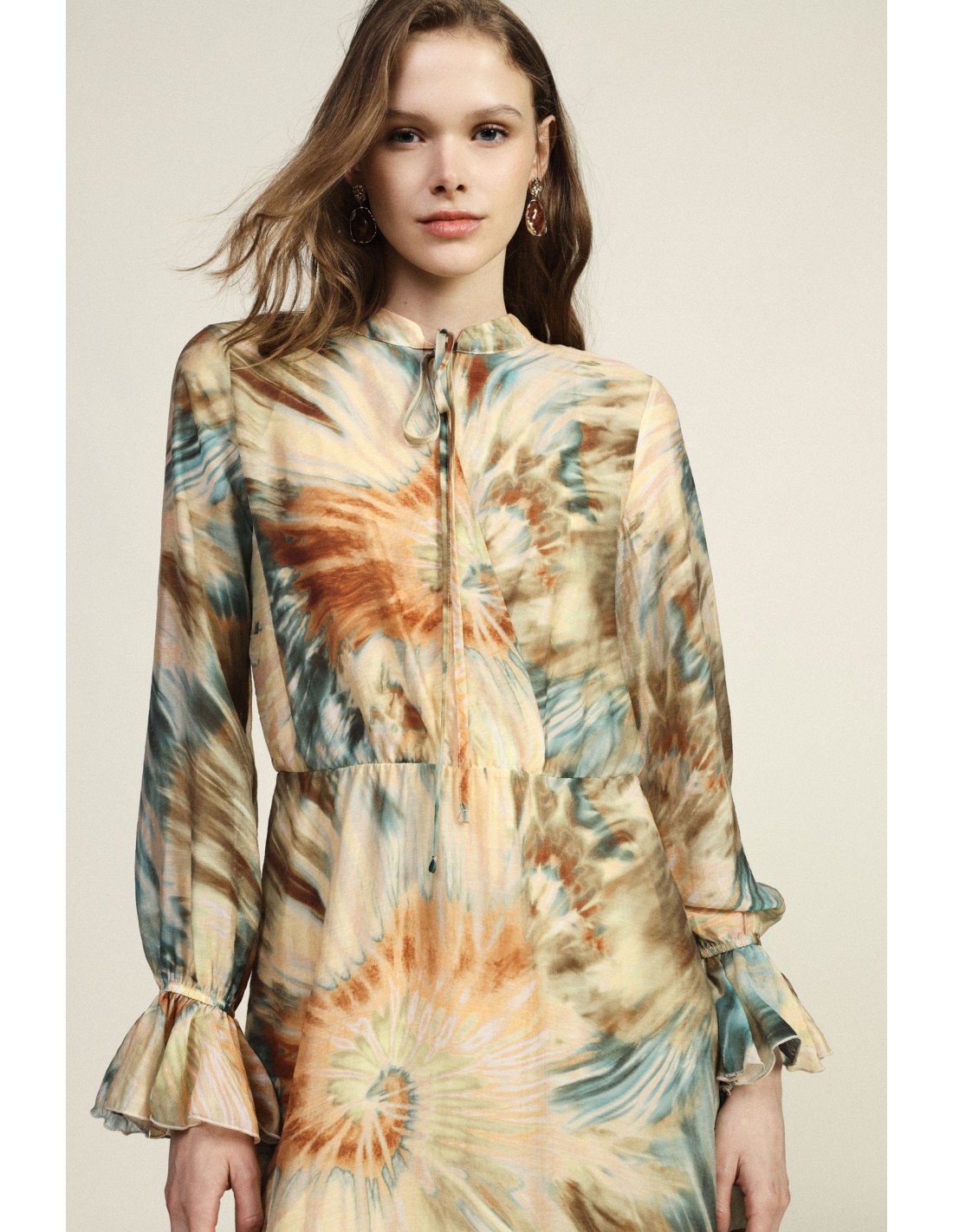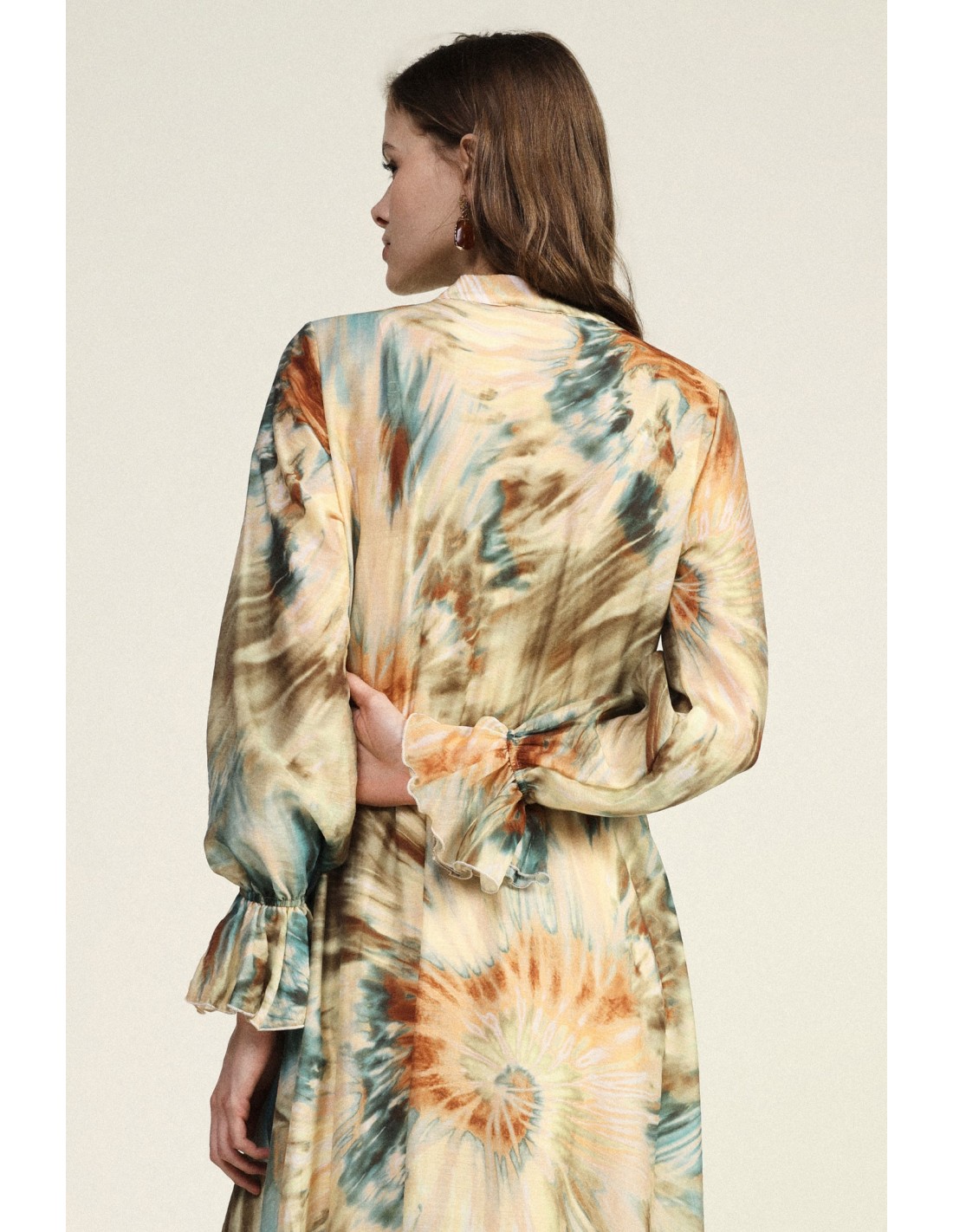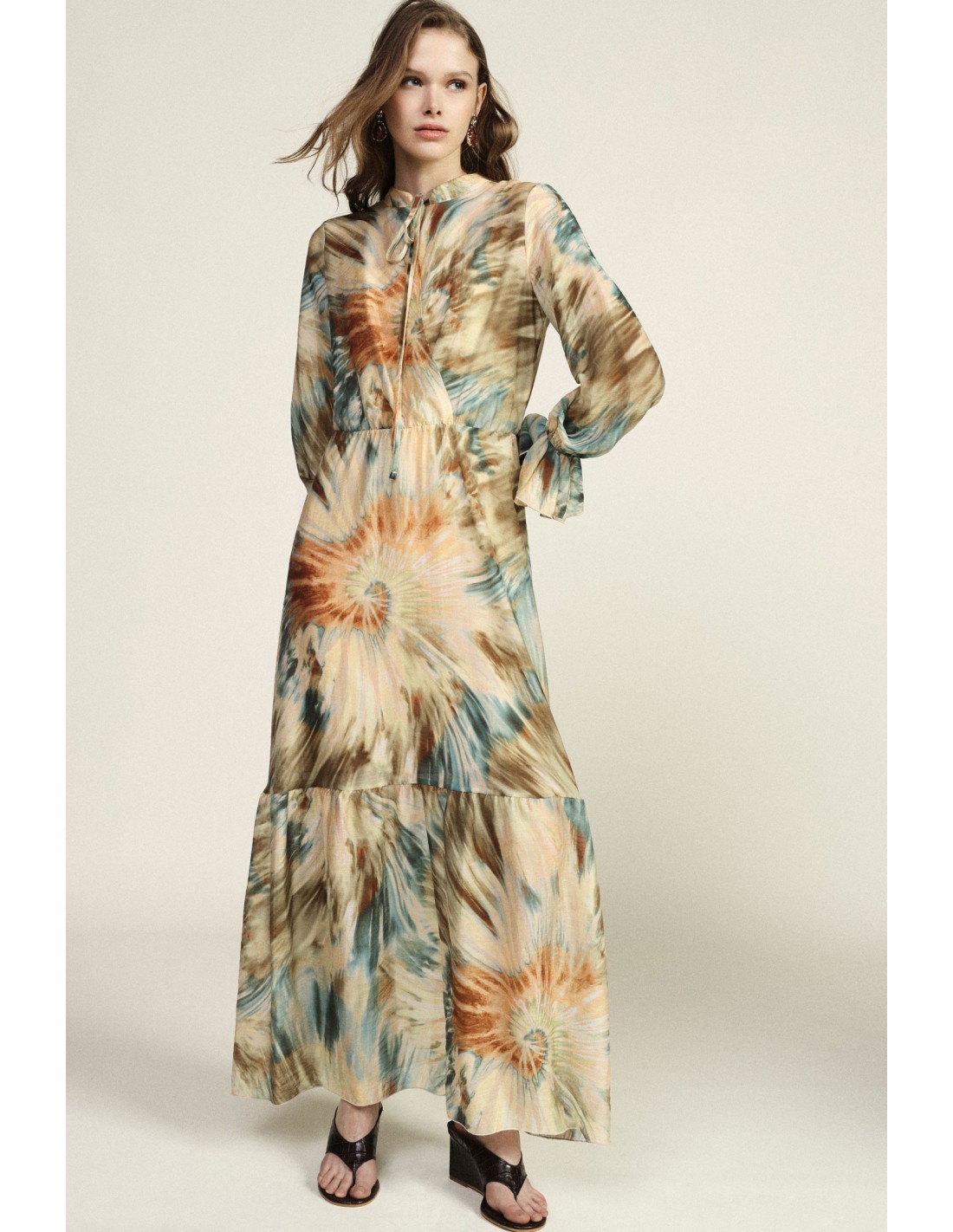 Deixe-se envolver por este vestido longo com estampado aquarela que confere movimento e leveza. As mangas compridas com punho franzido e o delicado laço no decote acrescentam um toque sofisticado. Perfeito para os seus dias mais luminosos e para momentos em que deseja sentir-se autêntica e livre nos gestos.