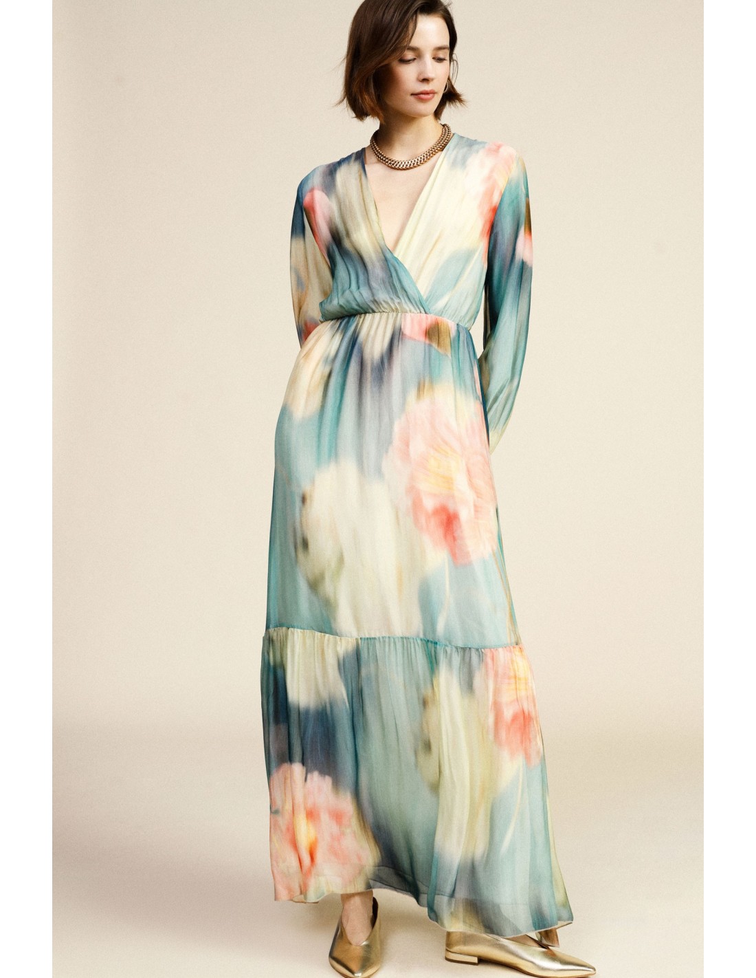 Deixa-te envolver por um estampado floral que transmite energia e personalidade. O corte longo, as mangas leves e a cintura marcada realçam a feminilidade e garantem liberdade de movimento. Perfeito para te sentires especial todos os dias, com detalhes delicados que valorizam todas as silhuetas.