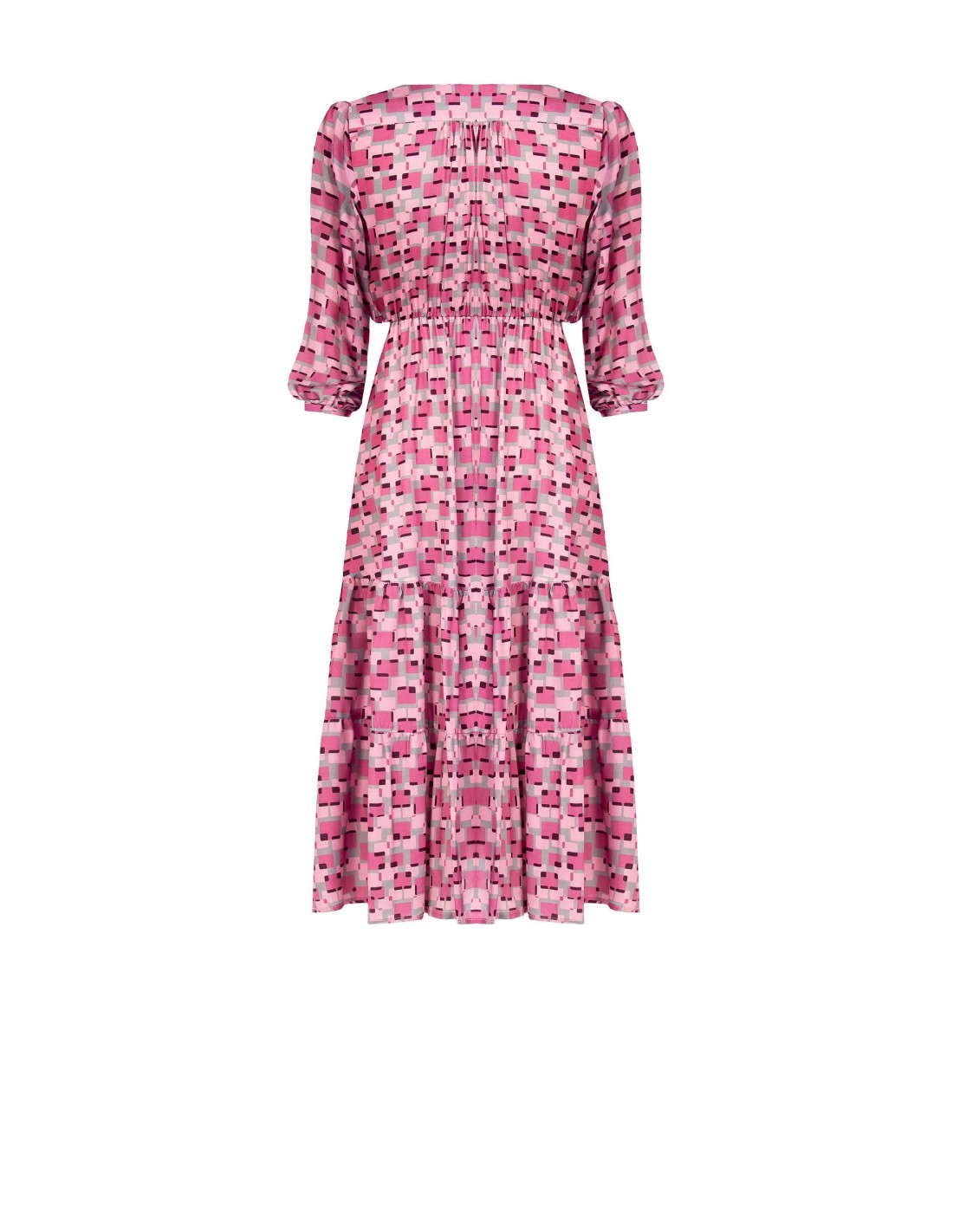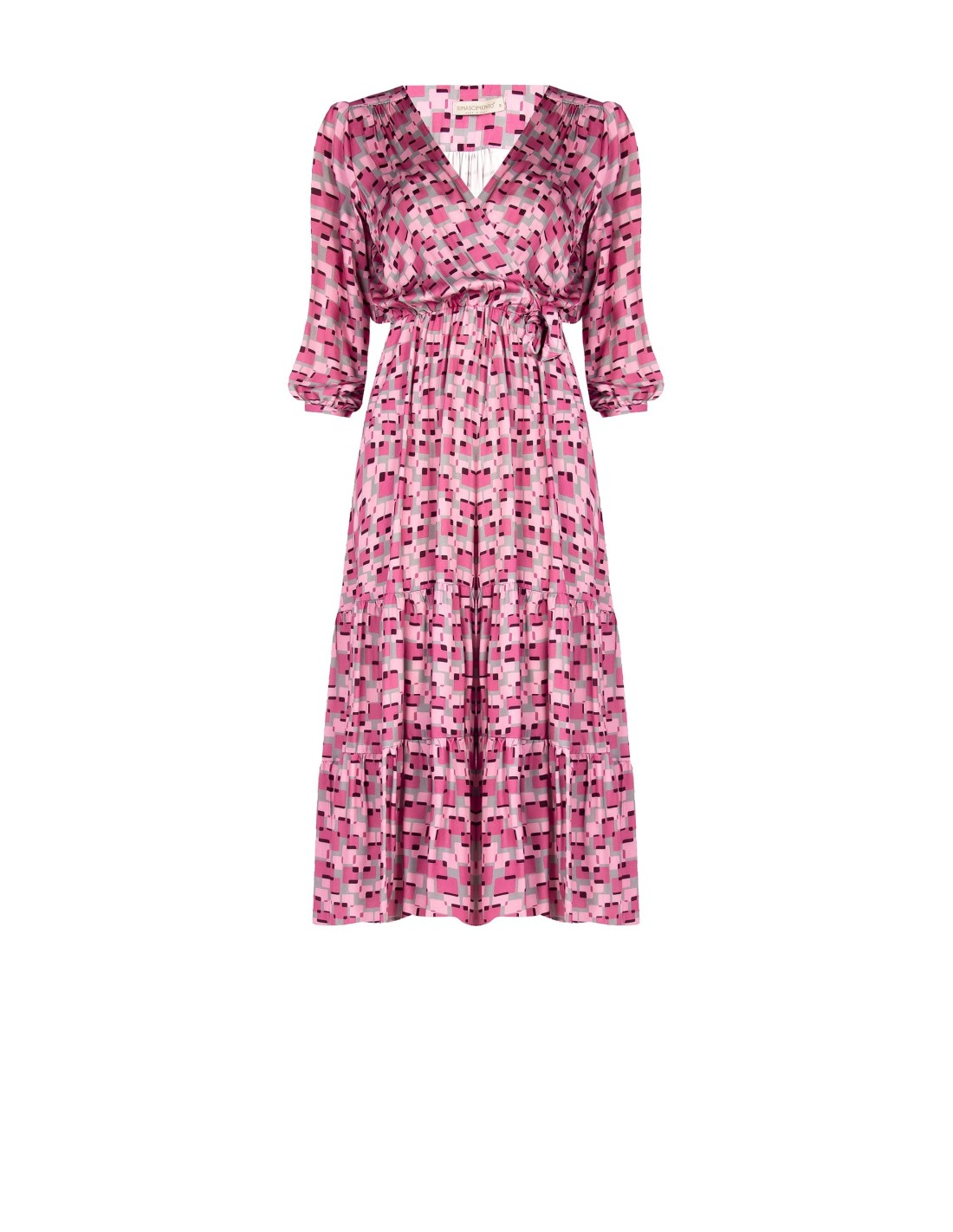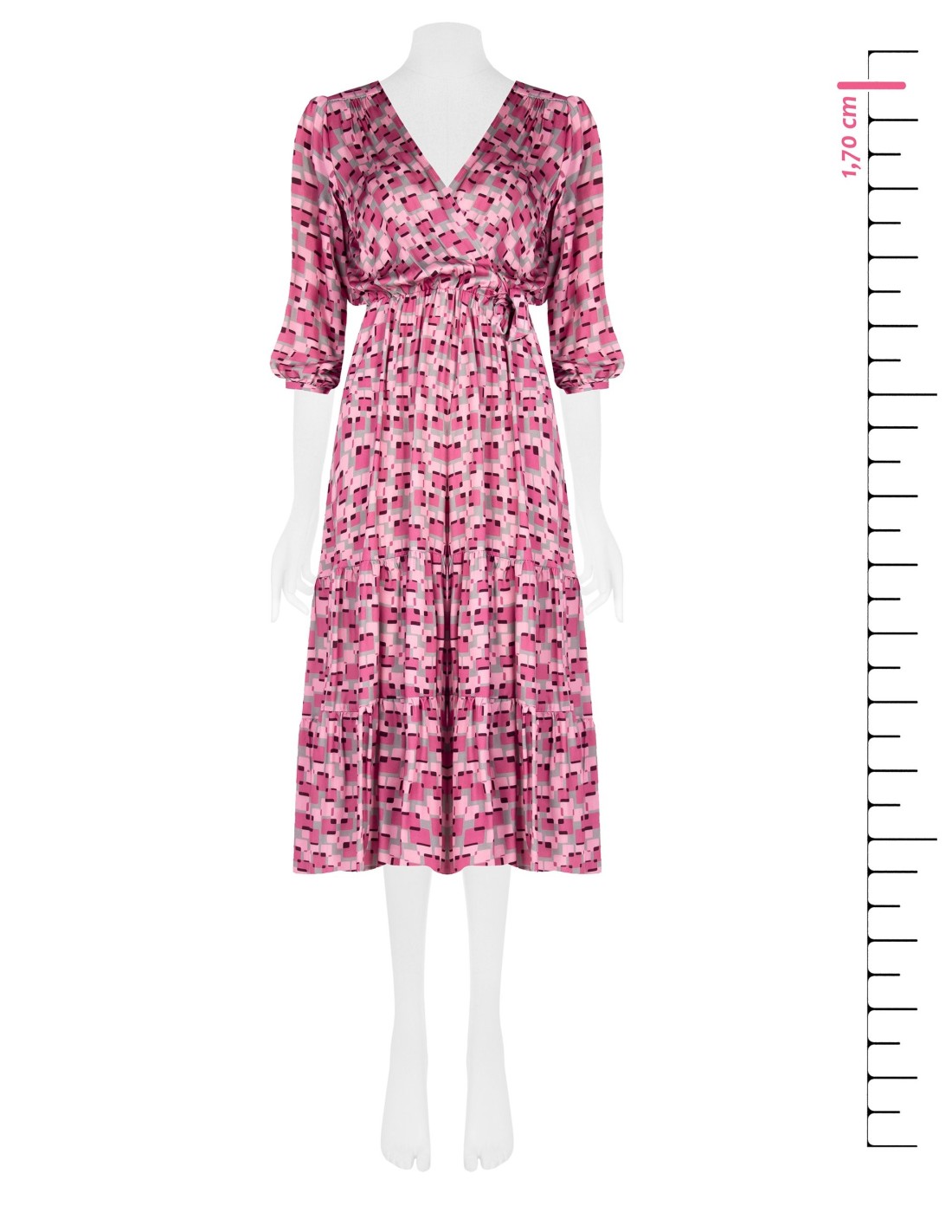 Vestido de linha fluida e feminina, com caimento suave que acaricia a silhueta e valoriza a cintura. Em tecido leve e fluido com textura estampada, destaca-se pelo decote em V cruzado e pelo cinto para atar. Perfeito para eventos, jantares e ocasiões especiais.