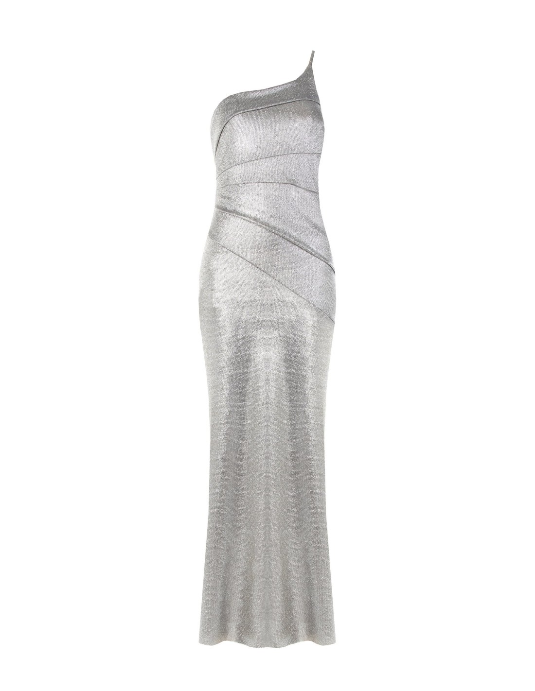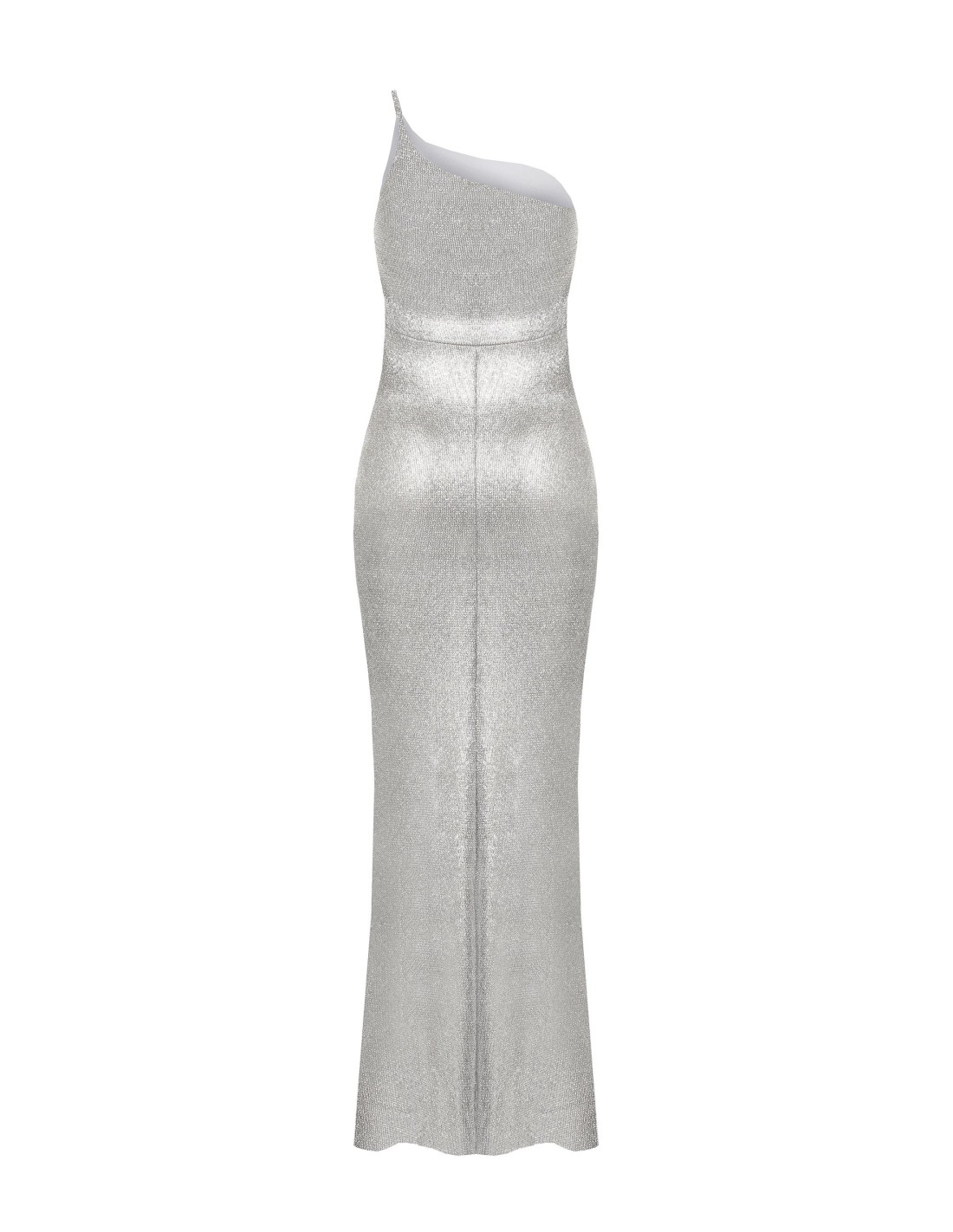 Vestido longo de corte justo que acaricia a silhueta e se abre naturalmente na base. A malha laminada, suave e elástica, ilumina o look sem abdicar do conforto. Decote de um ombro só e drapeado valorizam a cintura: perfeito para festas, cerimónias e eventos noturnos.