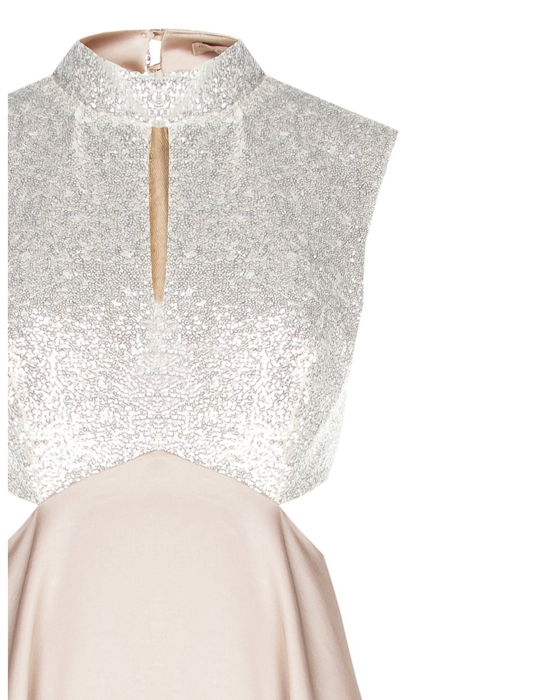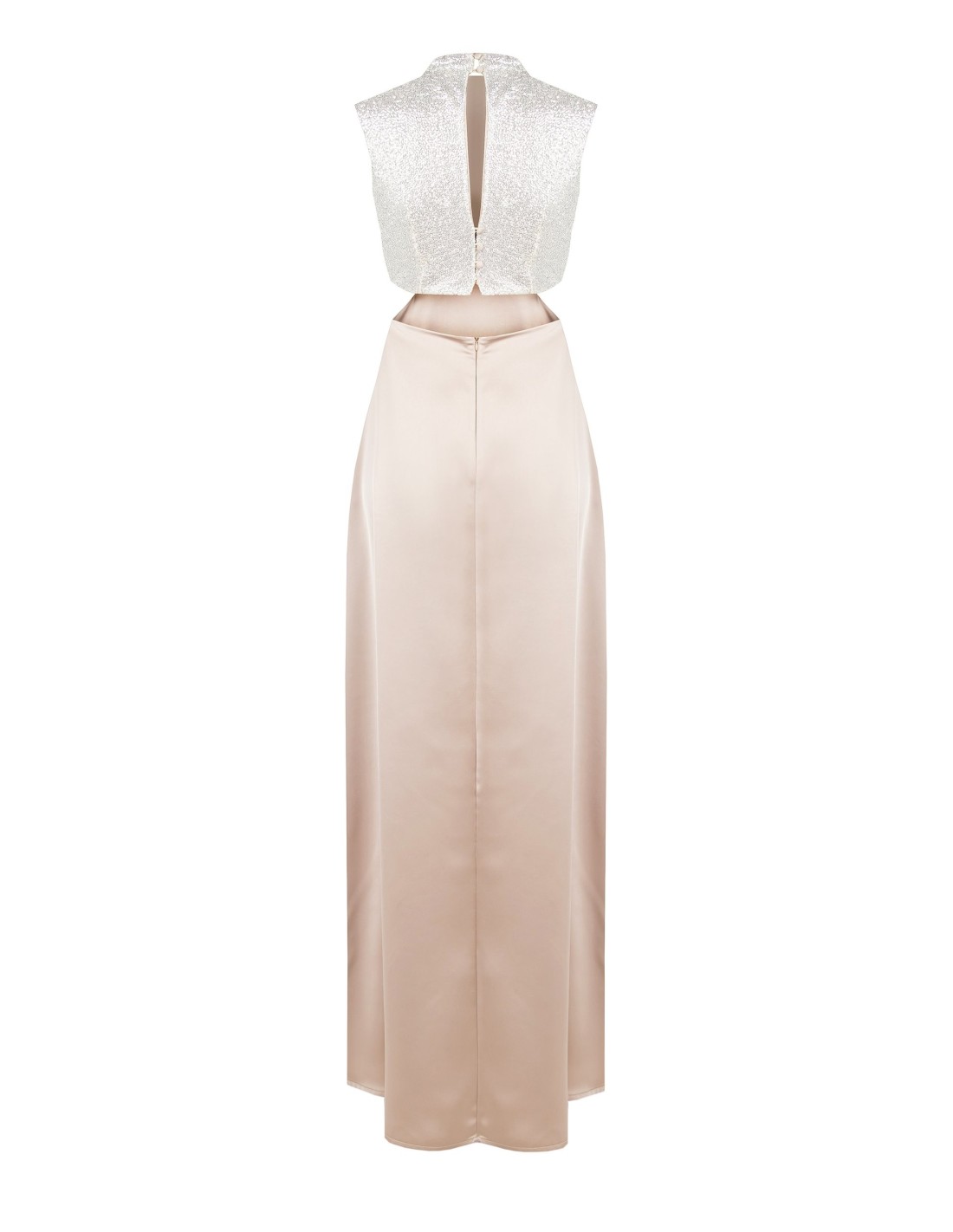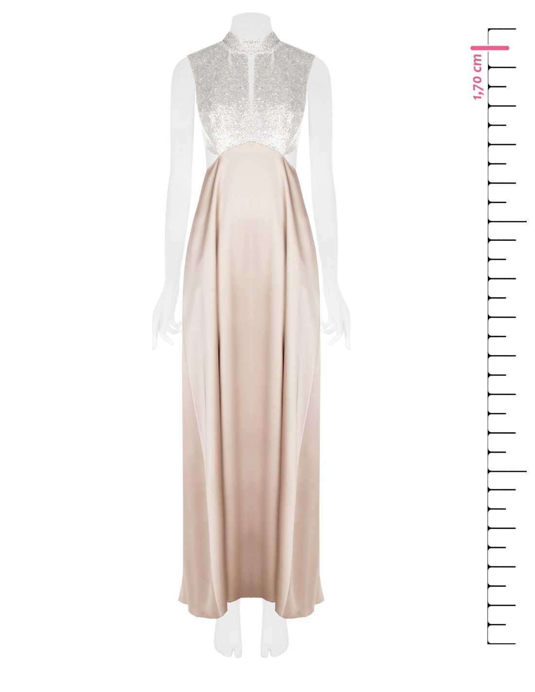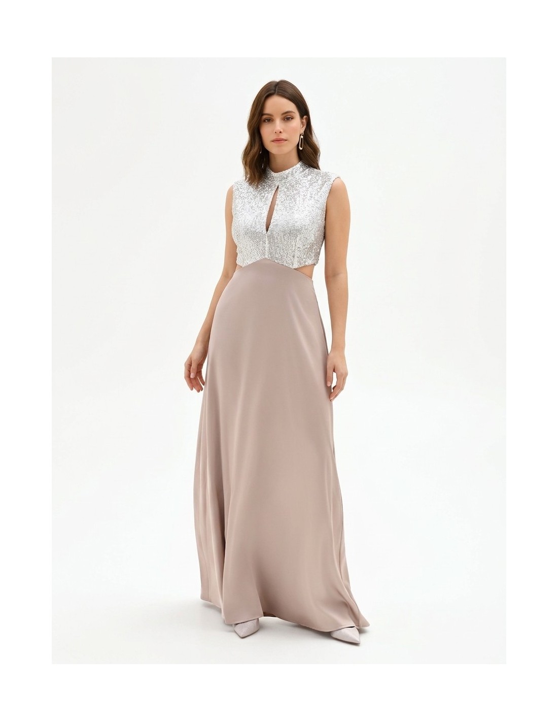 Vestido longo de corte fluido e amplo, pensado para acompanhar os movimentos e valorizar a silhueta. O cetim desliza com elegância, enquanto o corpete bordado com lantejoulas ilumina o decote. Gola alta e abertura em gota tornam-no perfeito para cerimónias, festas e noites especiais.