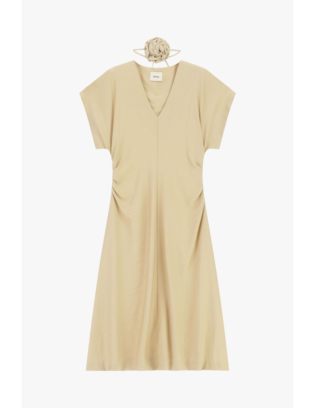 Este vestido midi com decote em V apresenta mangas amplas e um elegante drapeado nas ancas, que confere movimento e valoriza a silhueta sem abrir mão do conforto. O corte suave e a linha ligeiramente evasê tornam-no perfeito para te acompanhar no dia a dia com um toque original. O pormenor floral na gola permite-te reinventar cada look.