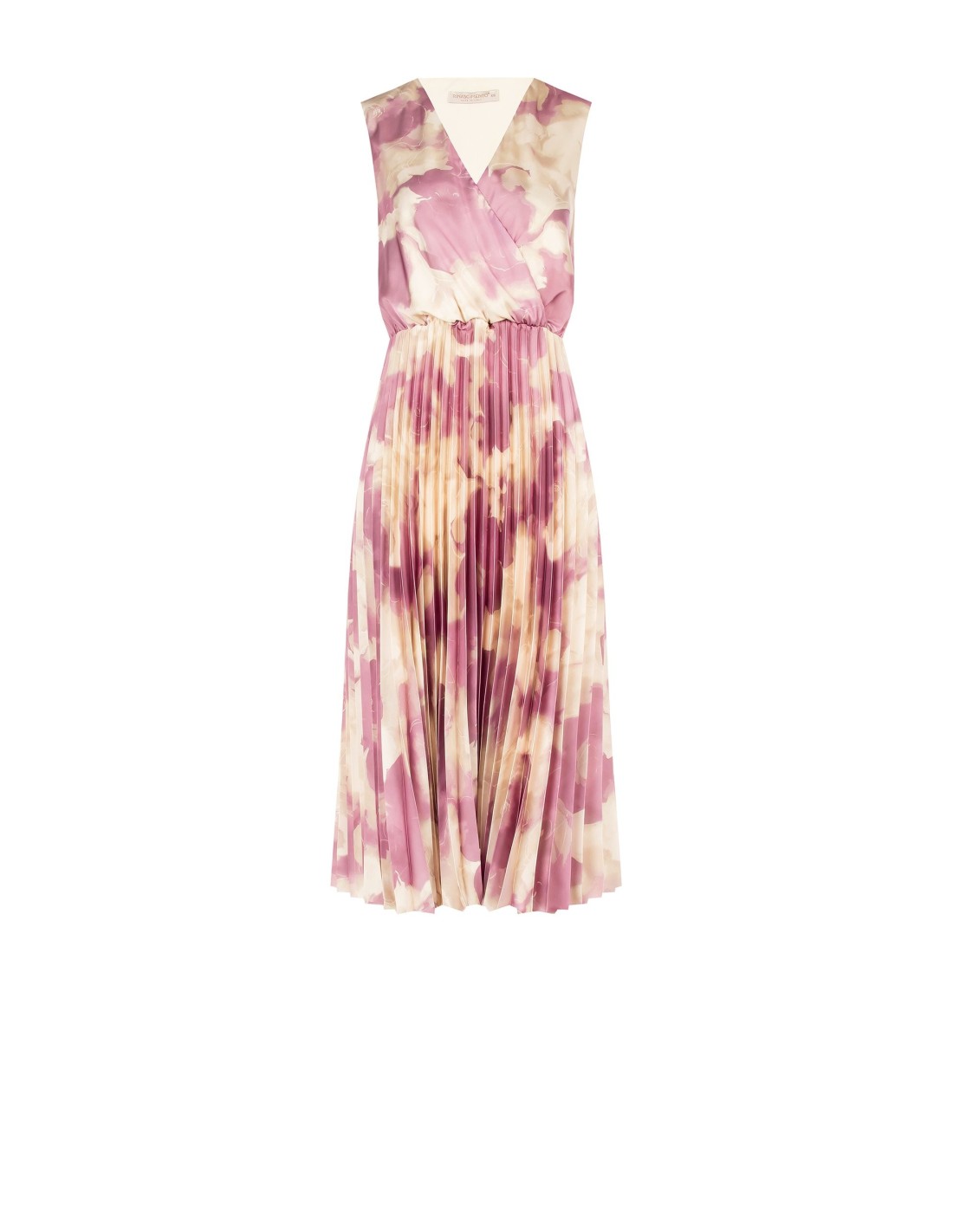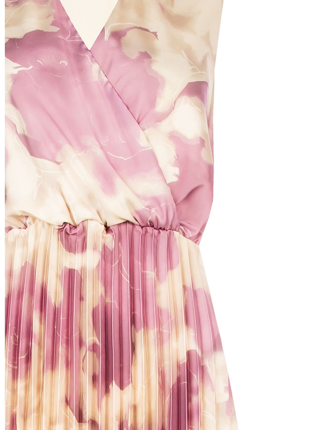 Vestido midi em raso com flores esfumadas plissê e decote em V cruzado Rinascimento