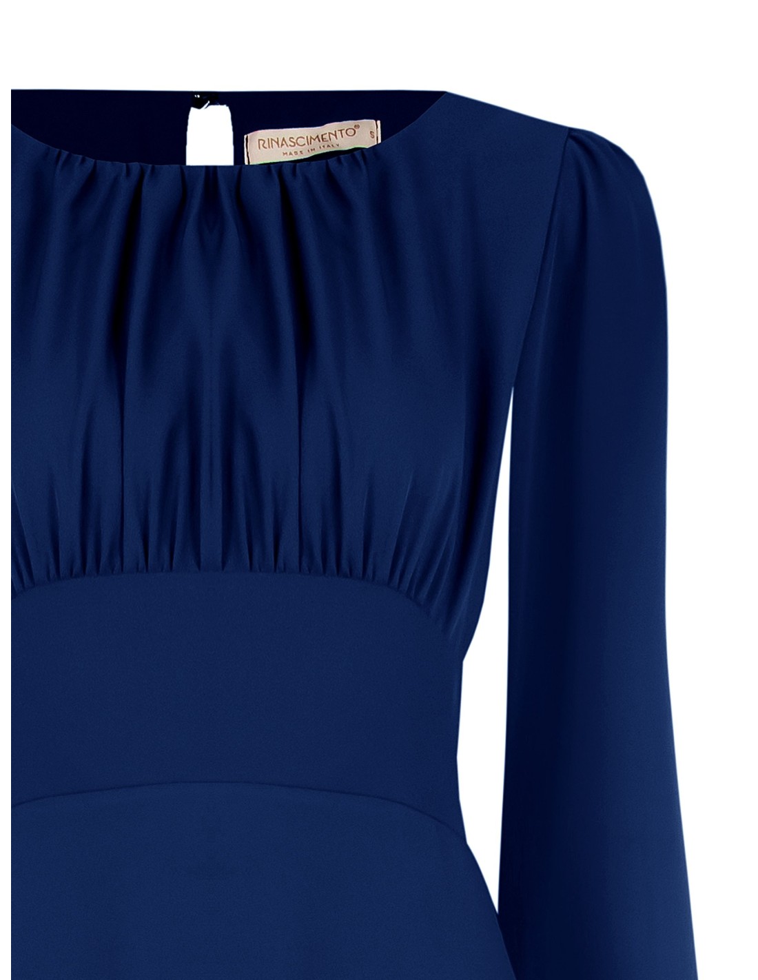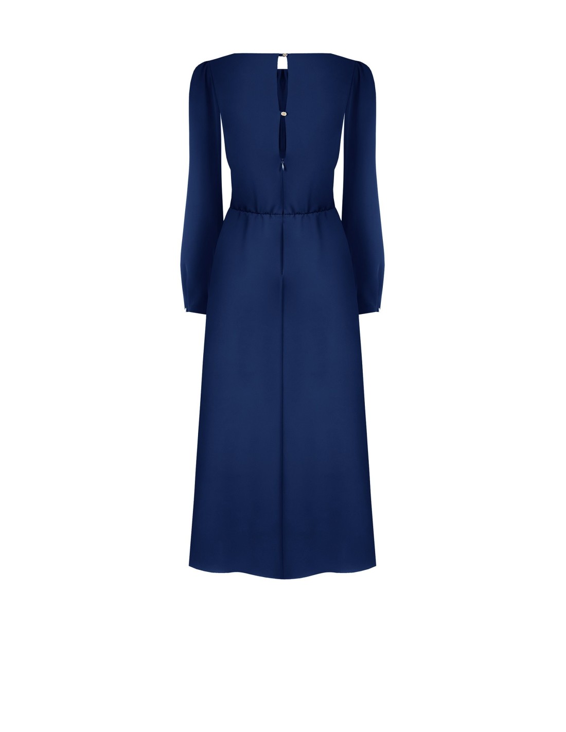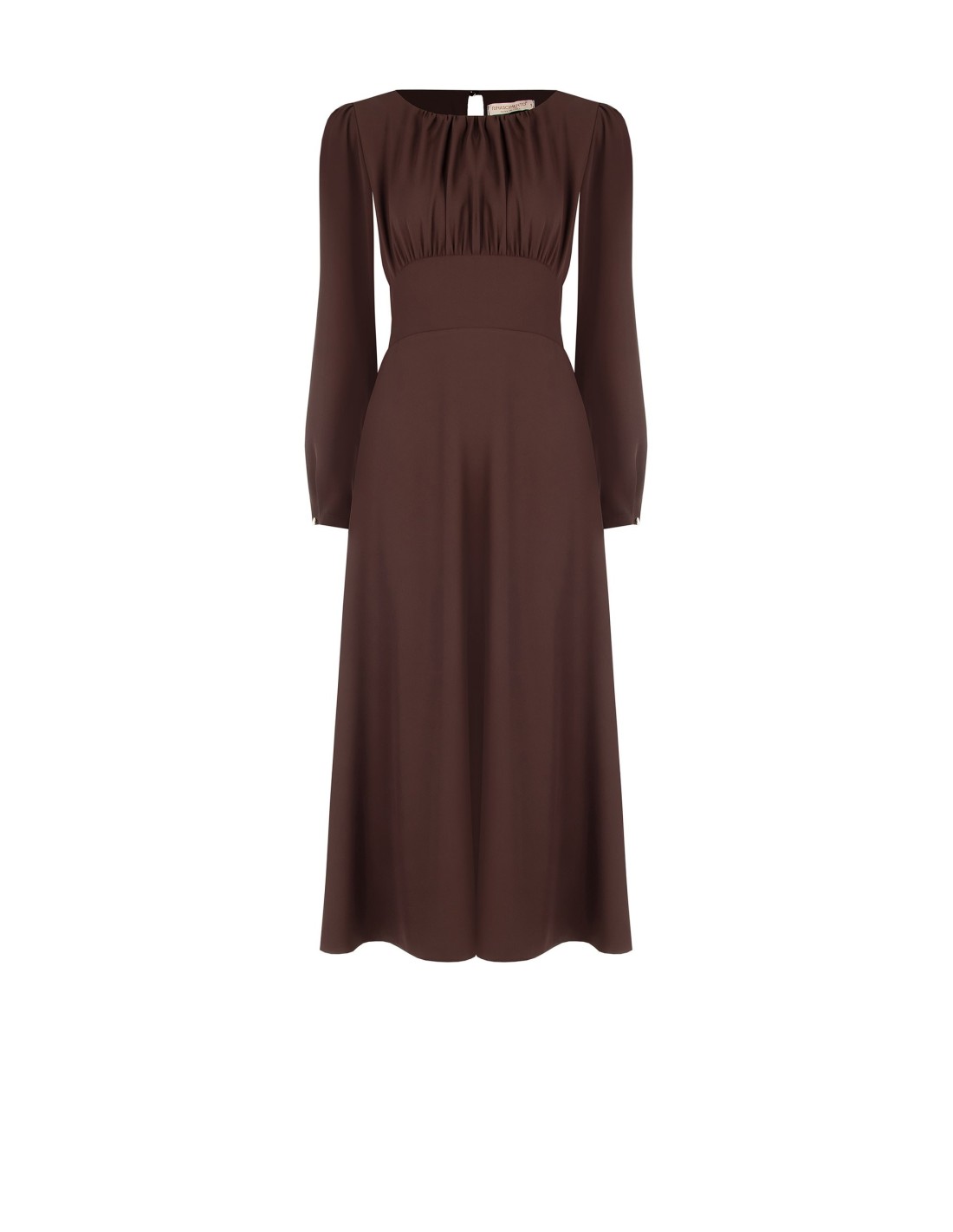 Vestido médio-longo em tecido macio e leve, com corte evasé que acompanha a silhueta sem marcar. Corpete franzido com decote rematado por pespontos e abertura em gota nas costas, mangas compridas com micro botão. Perfeito para escritório, eventos e jantares especiais.