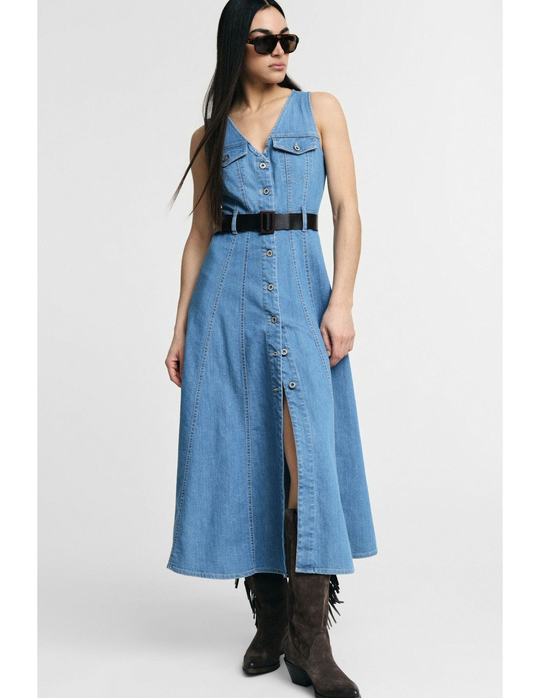 Vestido midi evasê com bolsos frontais e cinto