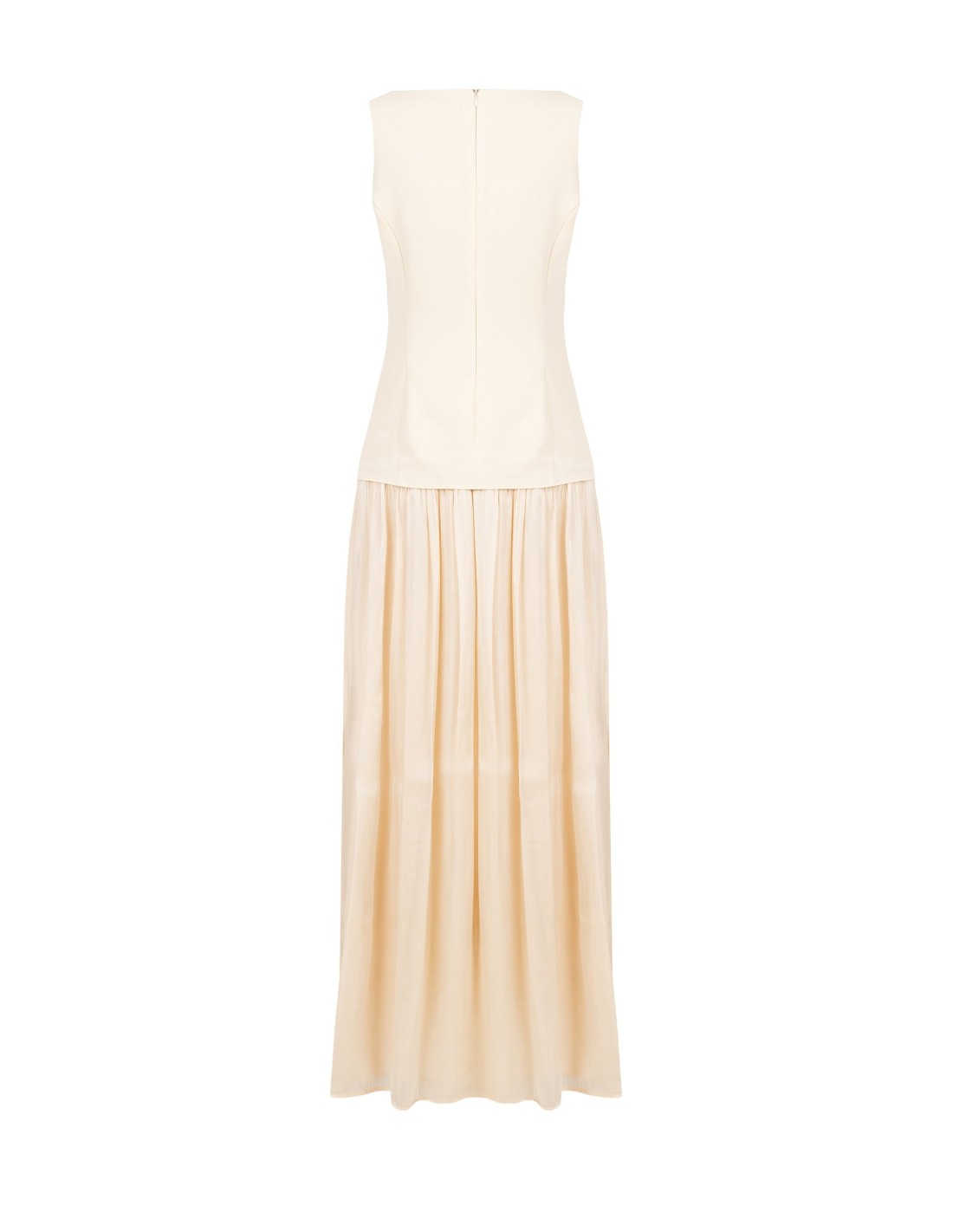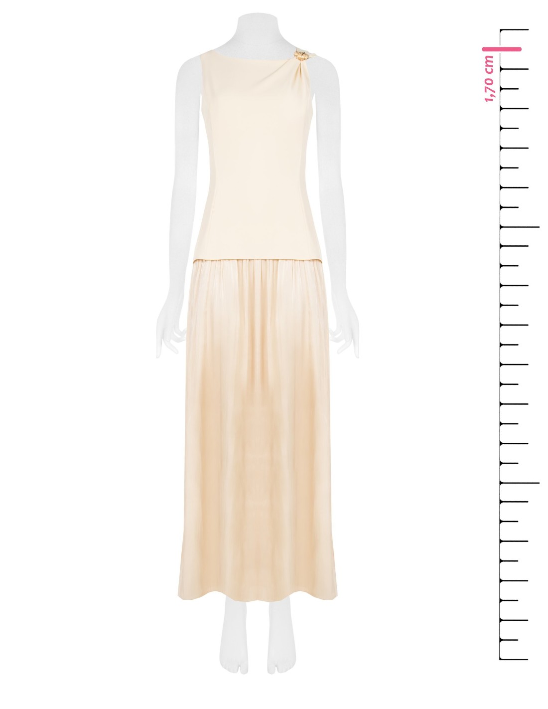Silhueta deslizante que realça a cintura, corpete em tecido liso e saia longa em georgette macia e leve. Ombro descoberto com delicado franzido preso por detalhe metálico, fecho na parte de trás. Perfeito para cerimónias, cocktail e eventos noturnos.