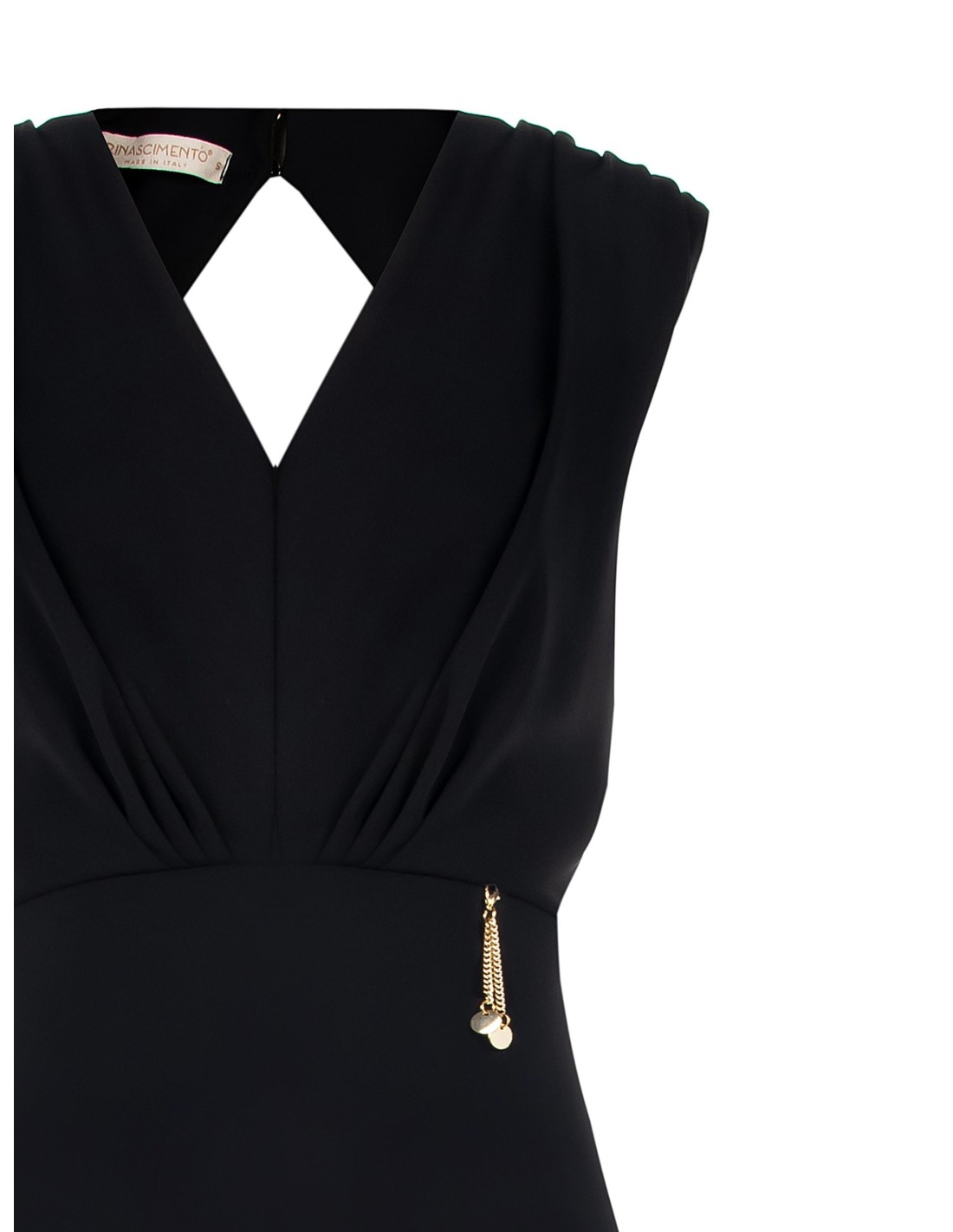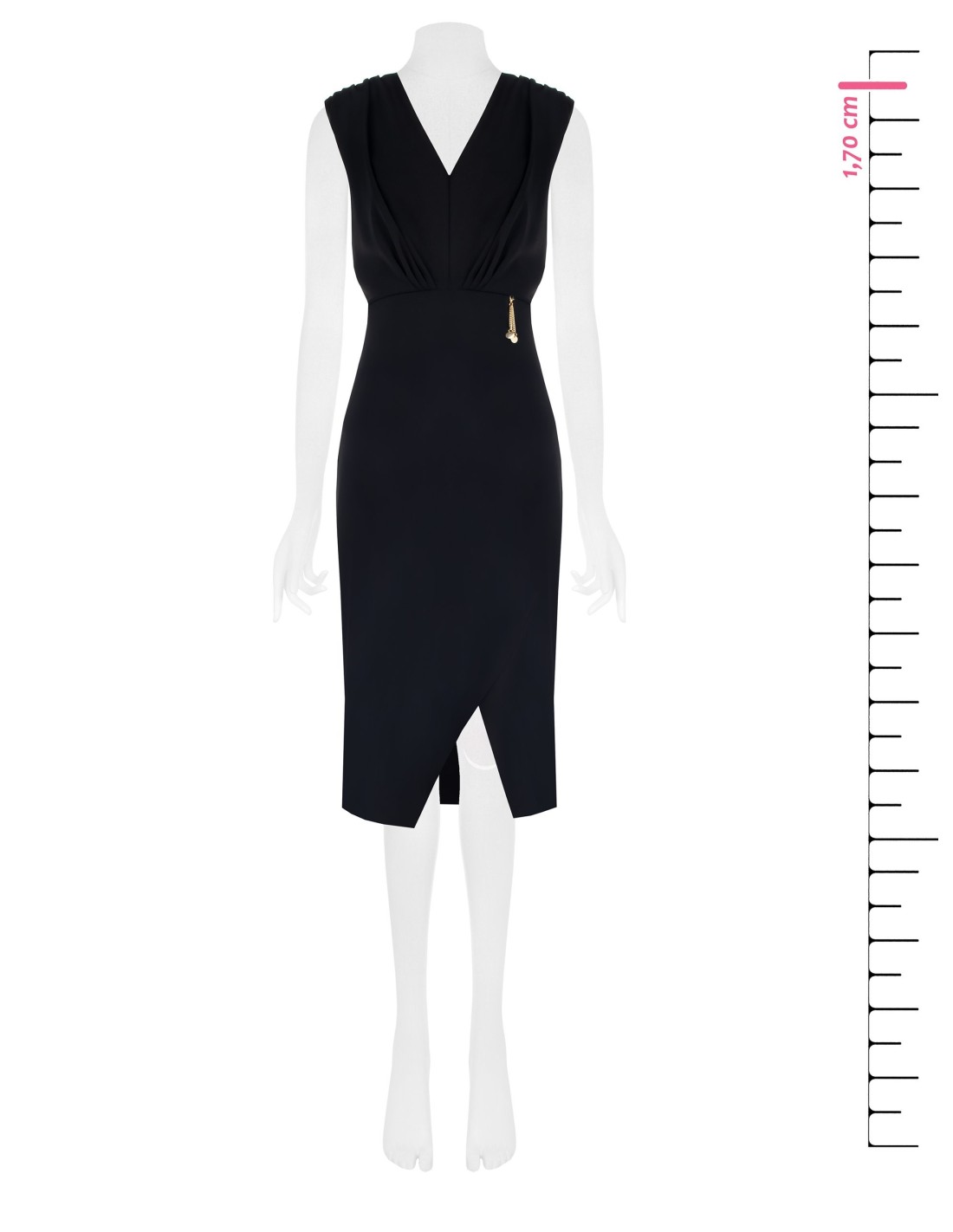 Vestido tubinho midi Rinascimento em tecido crepe stretch que envolve a silhueta sem a apertar. Corpete drapeado com decote em V e recorte nas costas, fenda frontal cruzada e pendente metálico na cintura. Perfeito da reunião noturna ao cocktail.