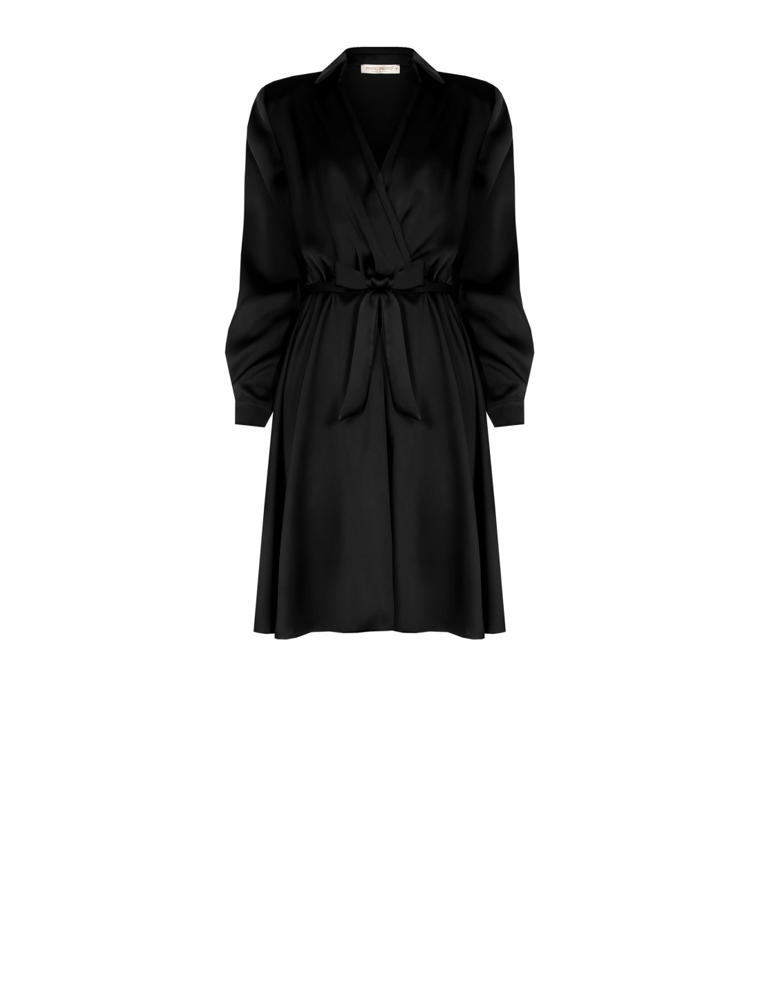 Feminino e versátil, este modelo de corte suave e evasê acaricia a silhueta com um tecido fluido de textura satinada. O decote cruzado com colarinho e o laço na cintura valorizam as formas com conforto. Perfeito do escritório ao aperitivo.
