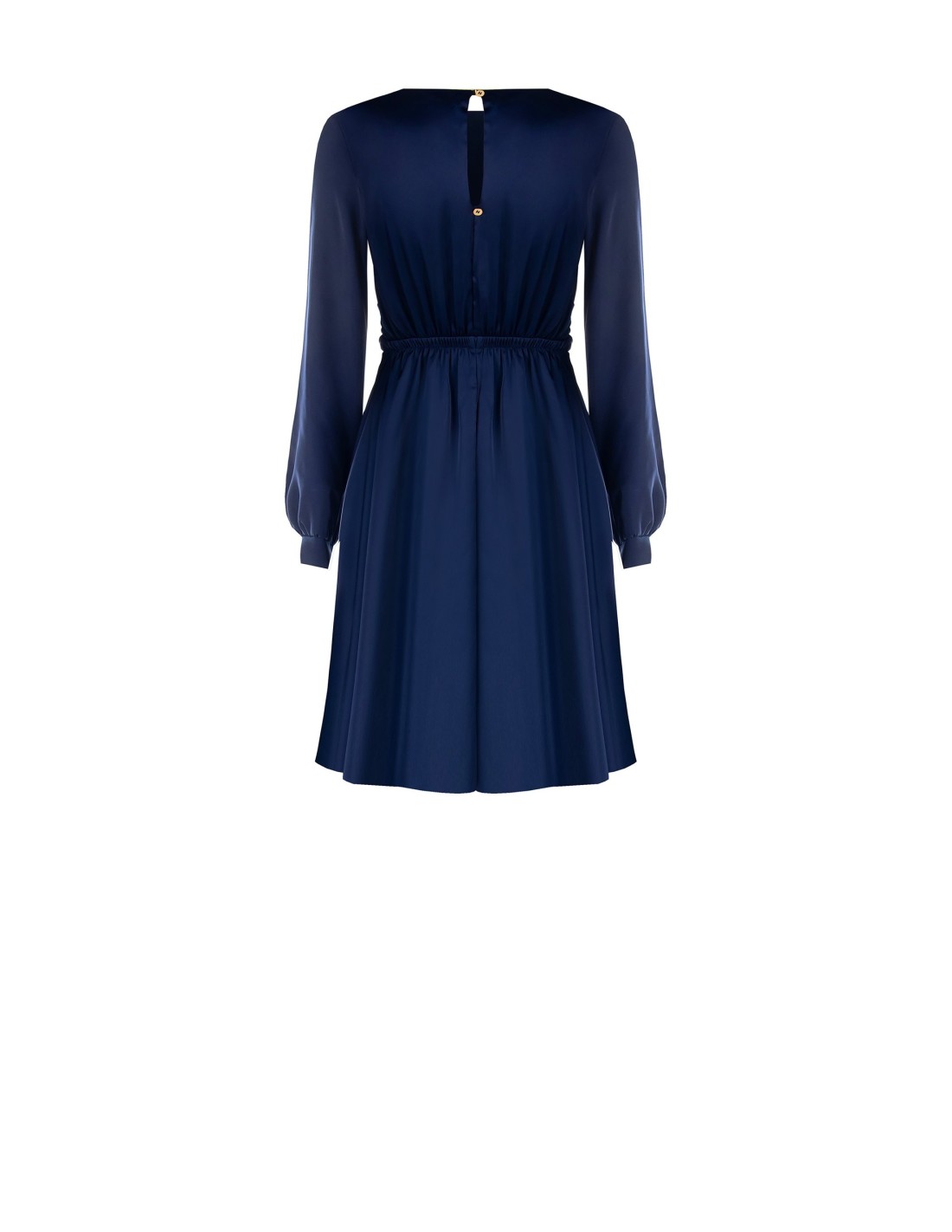 Corte evasé e cintura definida para um modelo em tecido fluido com efeito acetinado, macio na pele e leve em movimento. Mangas compridas com punho e abertura em gota nas costas com botões dourados que valorizam as costas. Perfeito do escritório ao aperitivo.