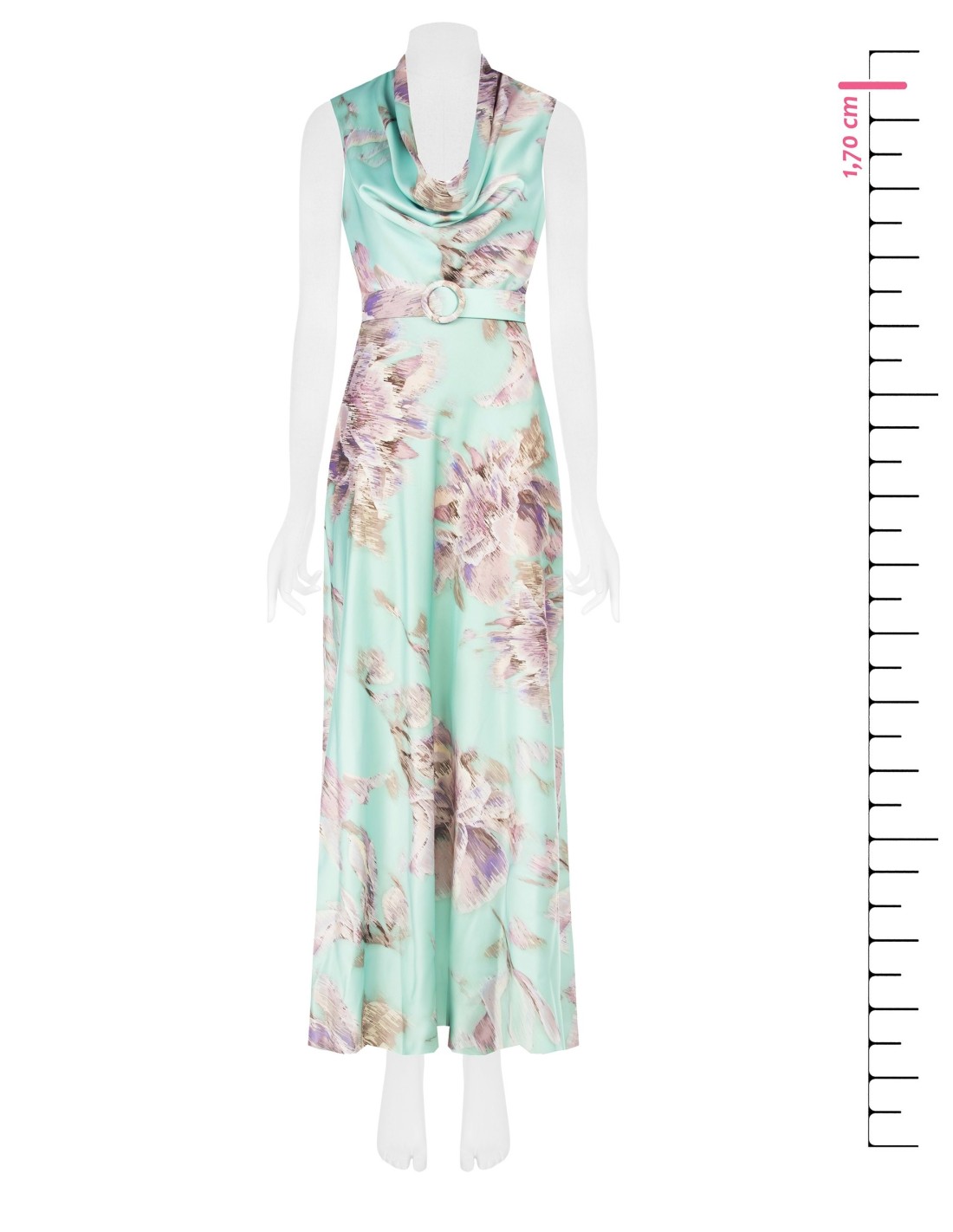Vestido longo Rinascimento em tecido fluido com efeito cetim, de corte fluído com cintura definida. O decote em cascata valoriza o colo, enquanto o cinto com fivela redonda realça a silhueta. Perfeito para cerimónias, festas e ocasiões especiais.