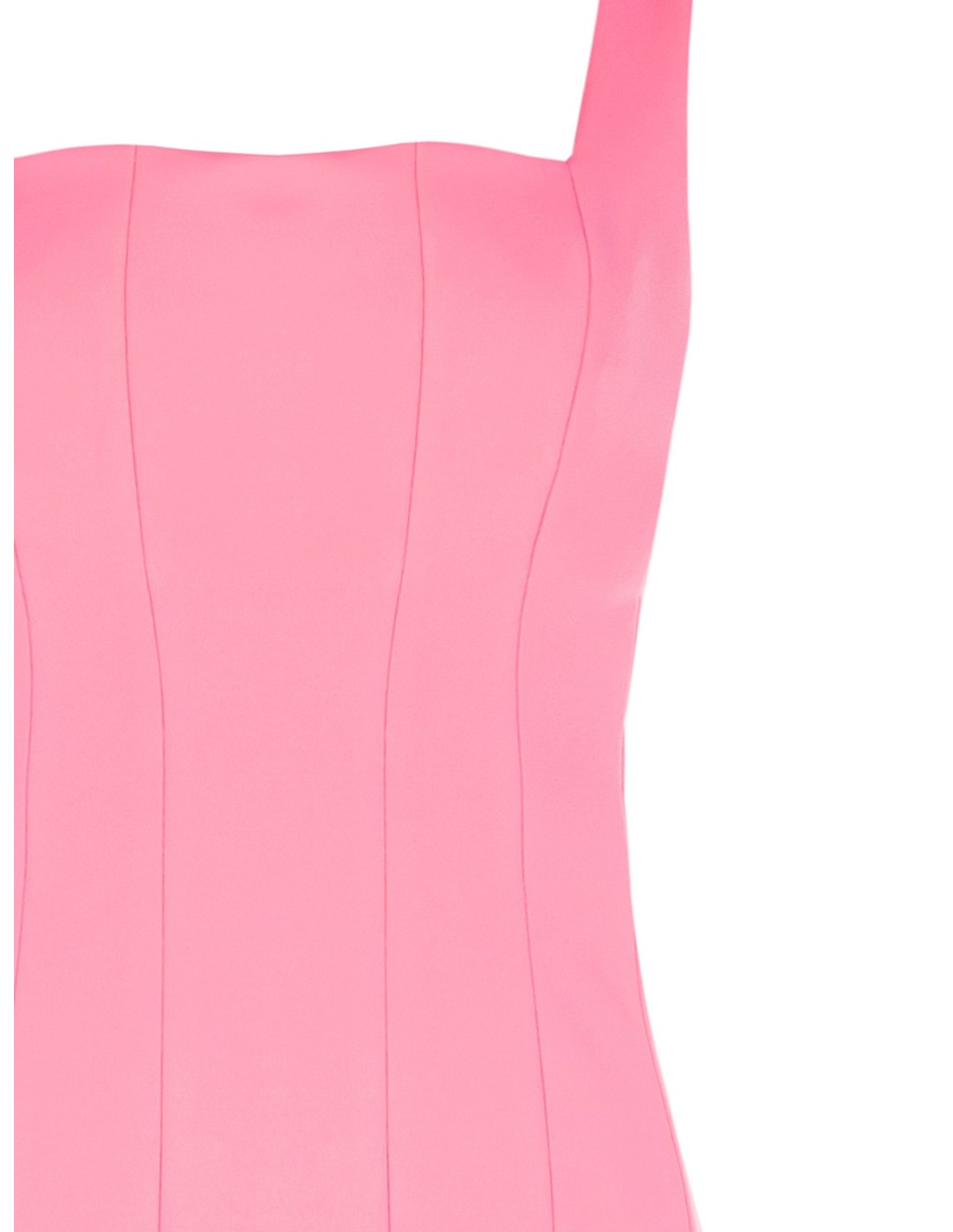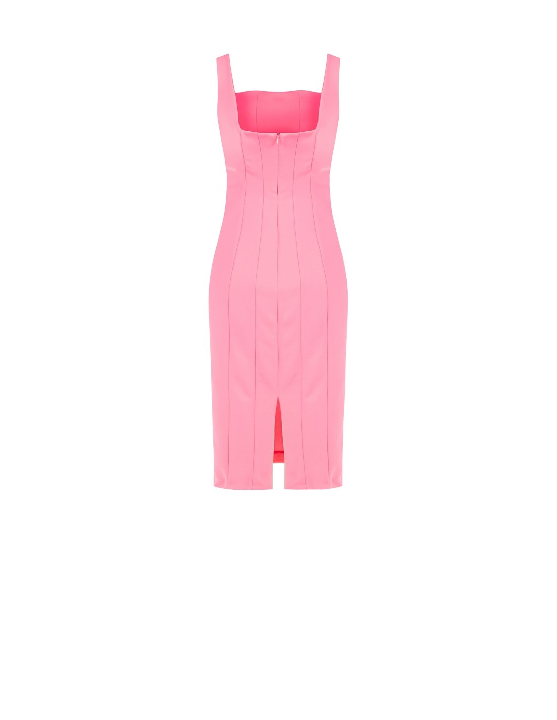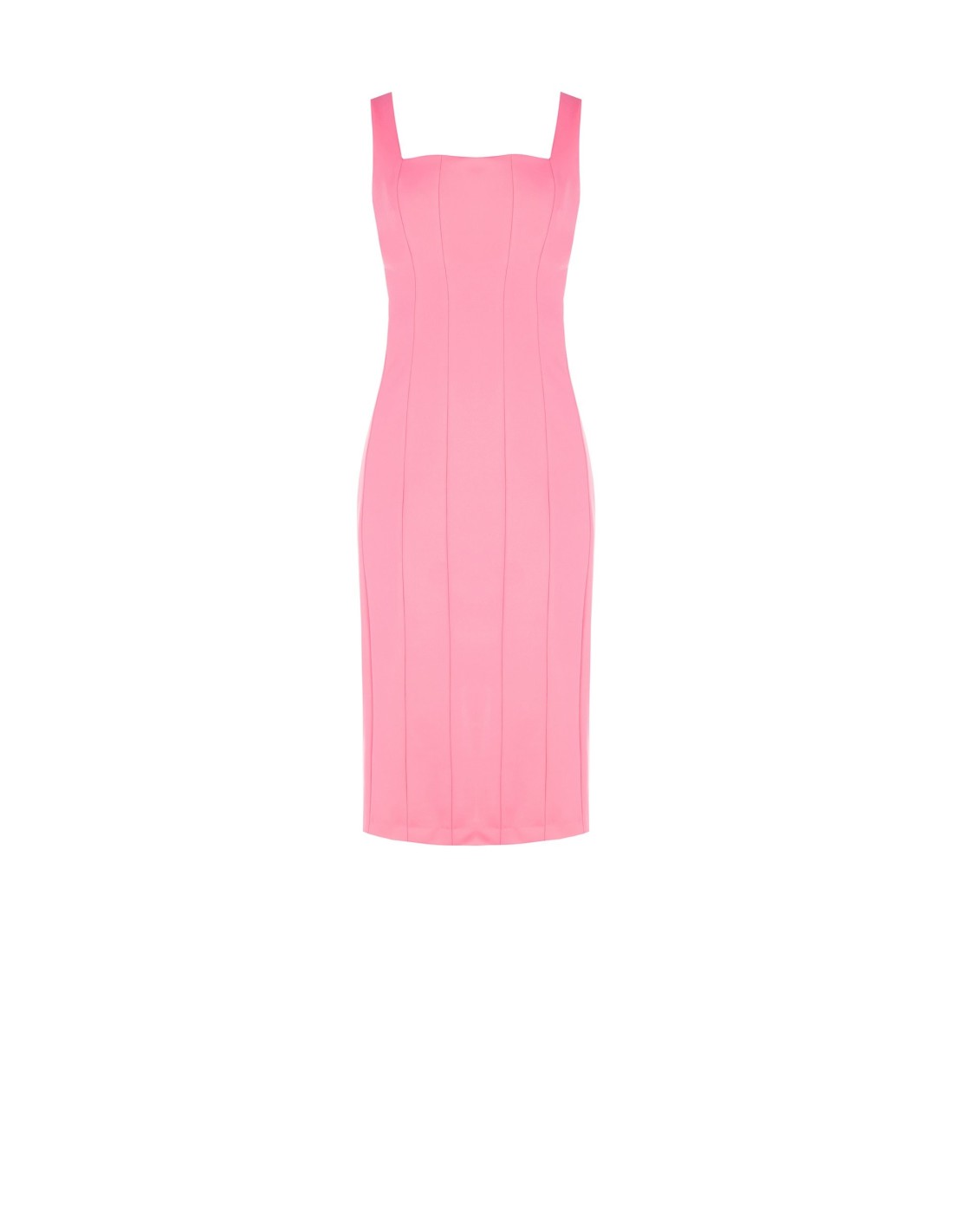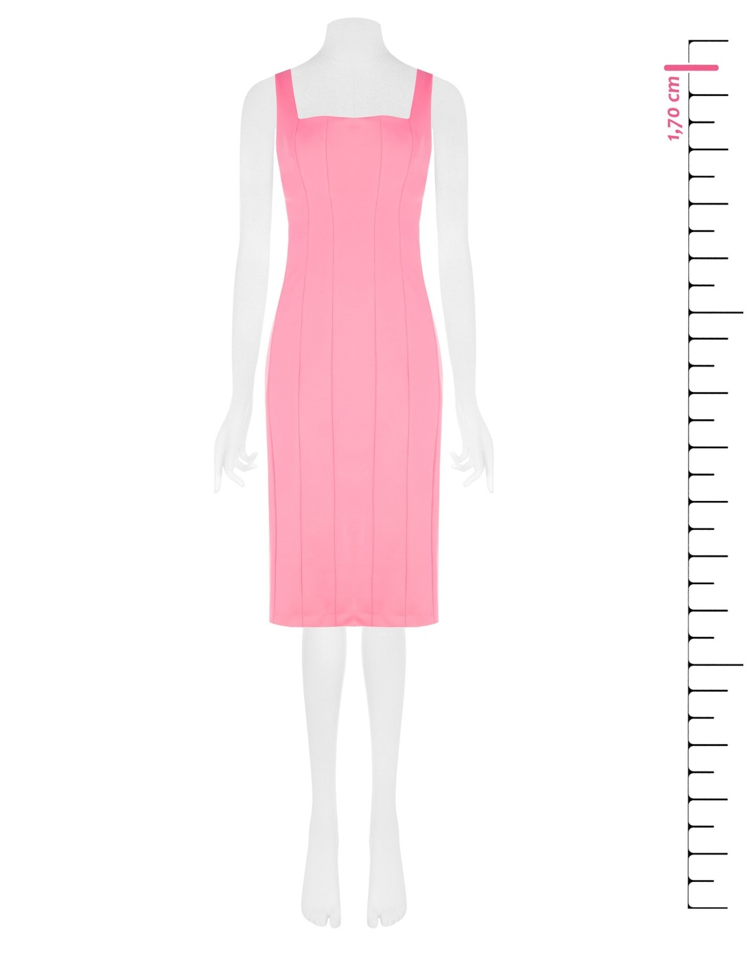 Tubinho midi Rinascimento de corte justo em tecido técnico stretch que esculpe a silhueta sem renunciar ao conforto. Decote recto com alças largas, costuras verticais que alongam e racha nas costas para um andar fluido: perfeito do aperitivo à festa.