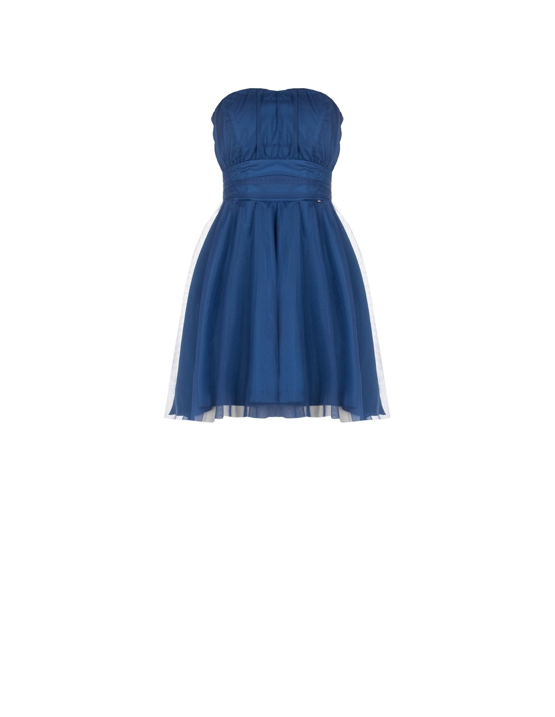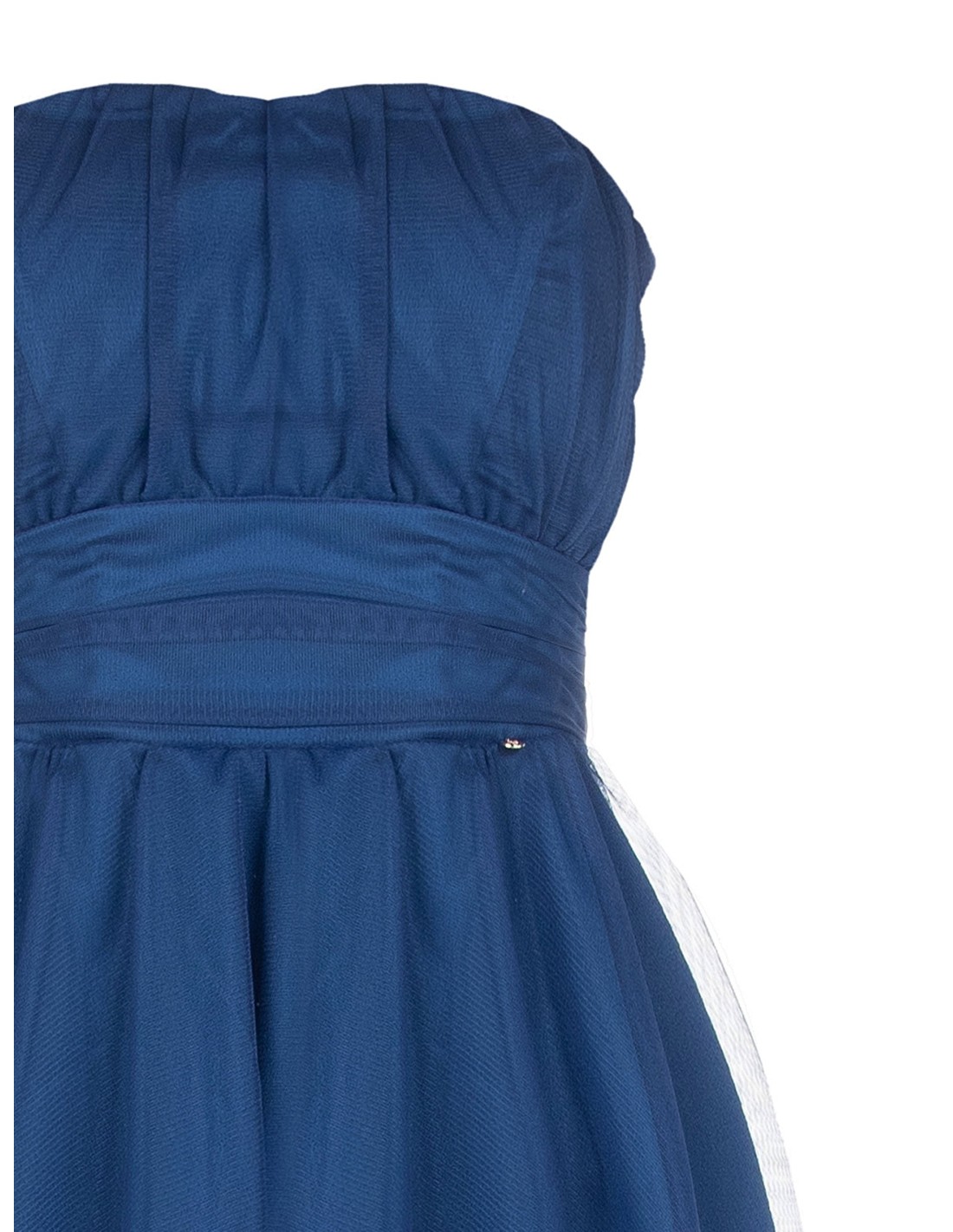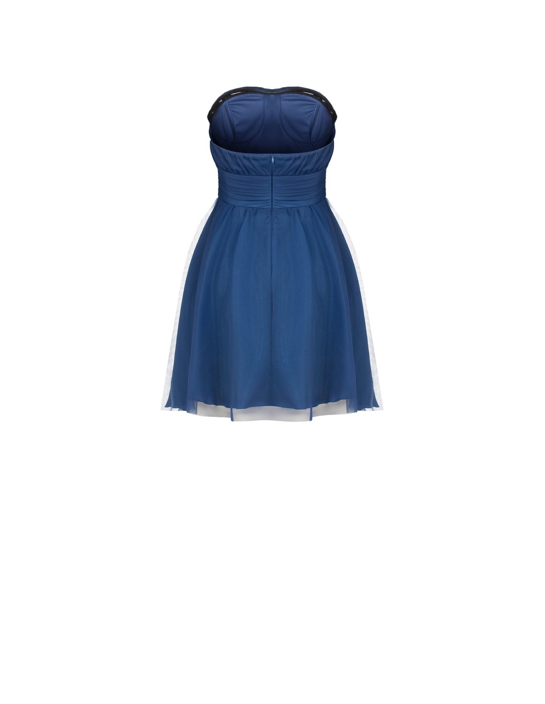 Vestido curto estilo bustier com corpete justo e ligeiras pregas que valorizam o decote. A saia em tecido fluido com uma camada de tule cria um volume suave e movimento. Fecho invisível na parte de trás. Perfeito para festas e cerimónias de verão.