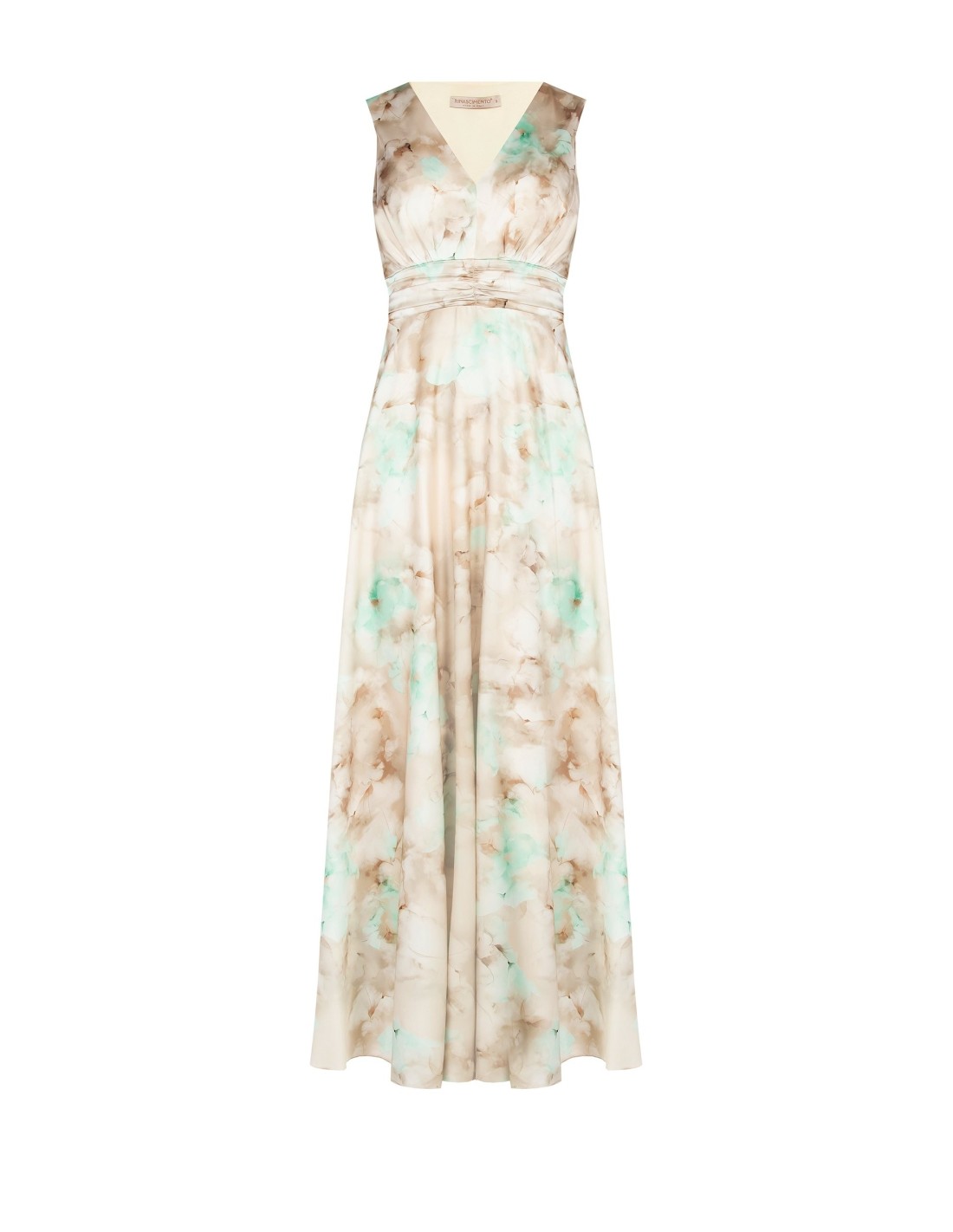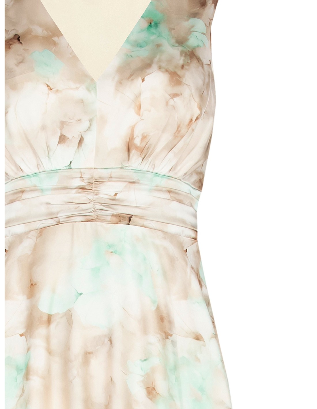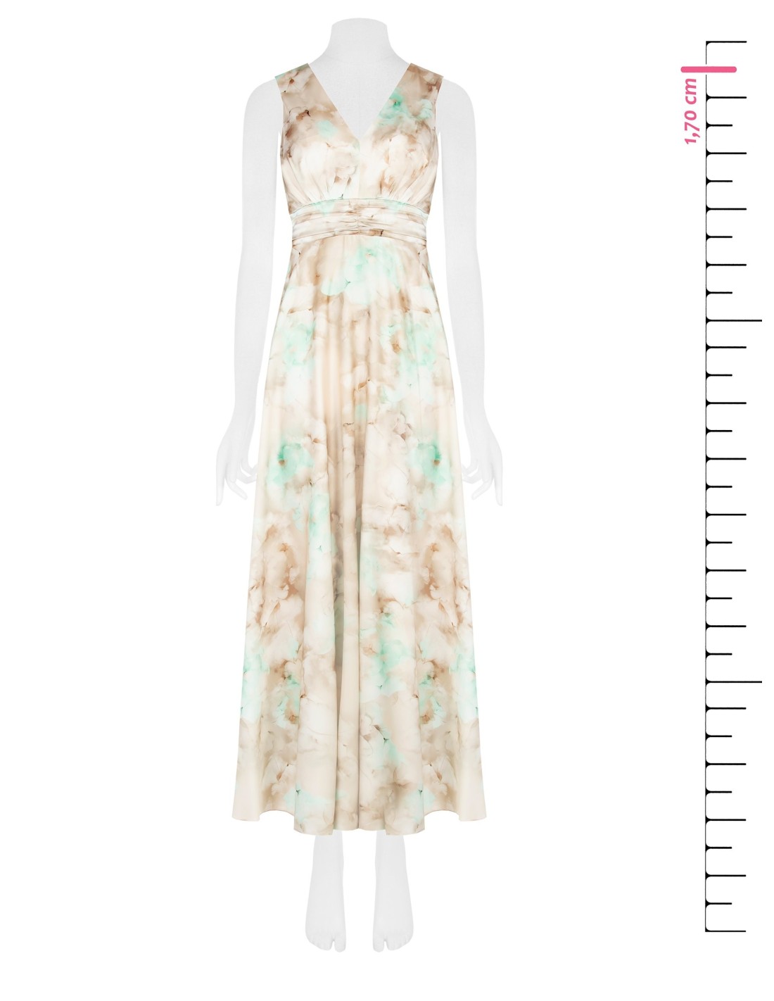 Comprido e fluido, envolve a silhueta sem a apertar graças ao tecido leve e macio. O decote em V cruzado e o cinto franzido realçam a cintura, enquanto a estampa em degradé confere movimento. Perfeito para cerimónias, cocktails e ocasiões especiais.