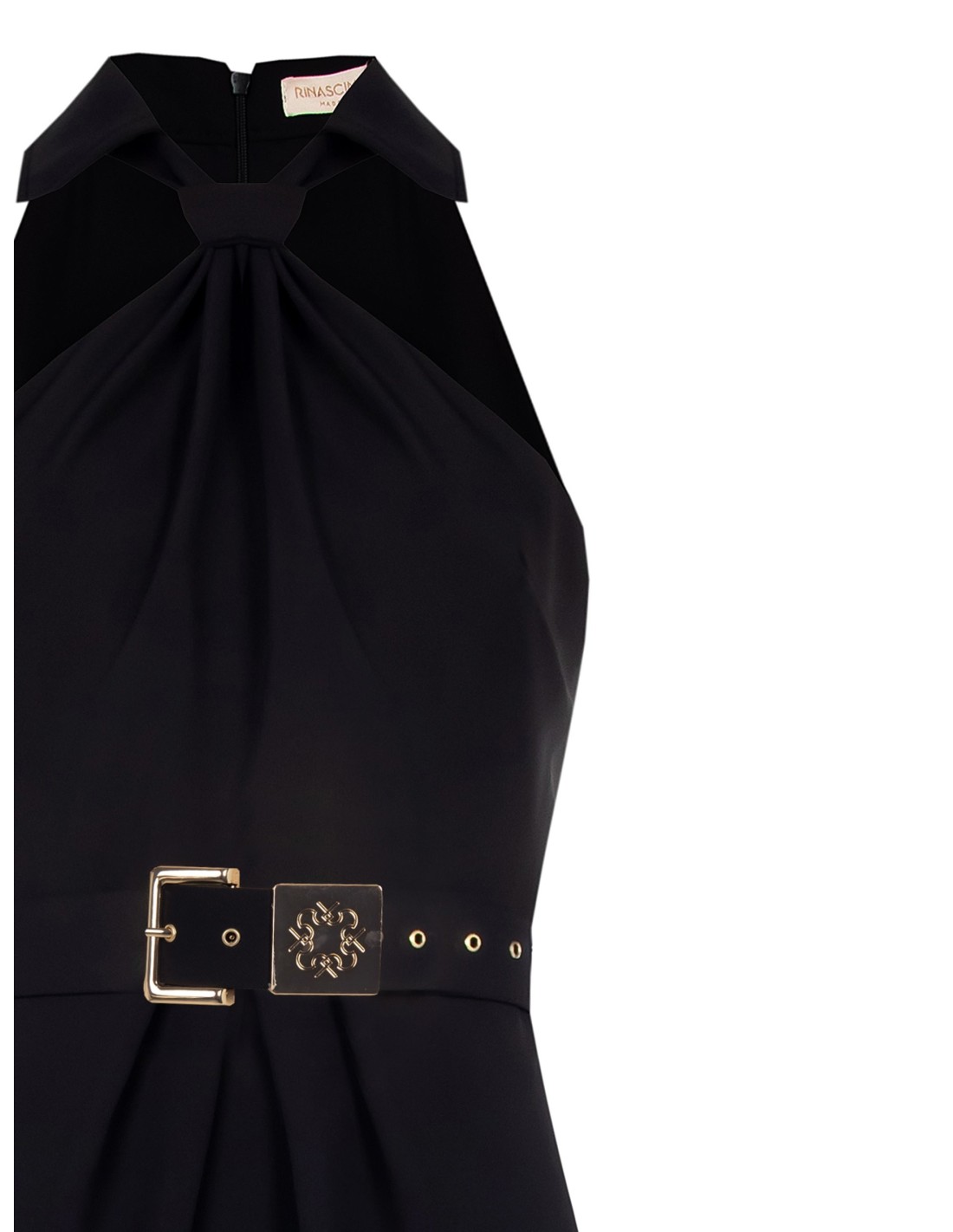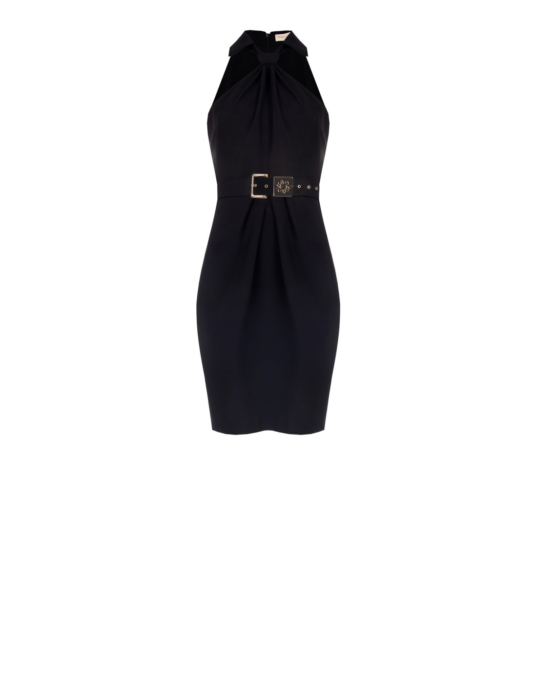 Corte justo em tecido fluido e macio, que envolve a silhueta com conforto. Decote americano com nó drapeado e gola estruturada, cinto com fivela com logótipo em metal que realça a cintura. Perfeito para cocktails, festas e noites especiais.