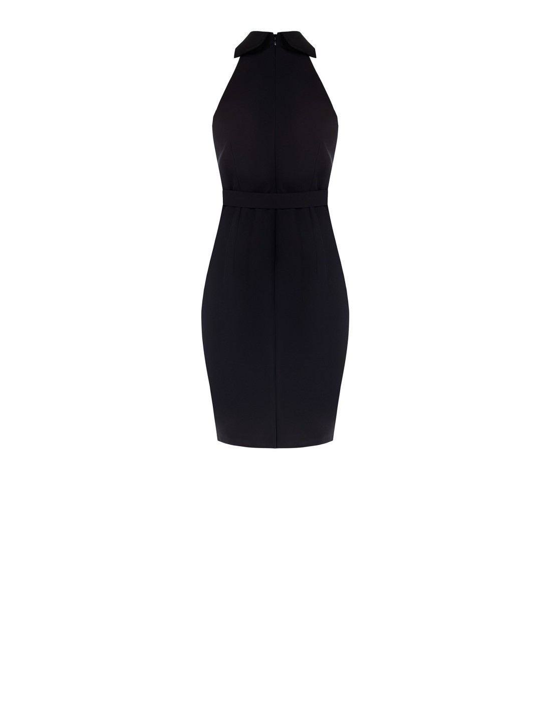 Corte justo em tecido fluido e macio, que envolve a silhueta com conforto. Decote americano com nó drapeado e gola estruturada, cinto com fivela com logótipo em metal que realça a cintura. Perfeito para cocktails, festas e noites especiais.