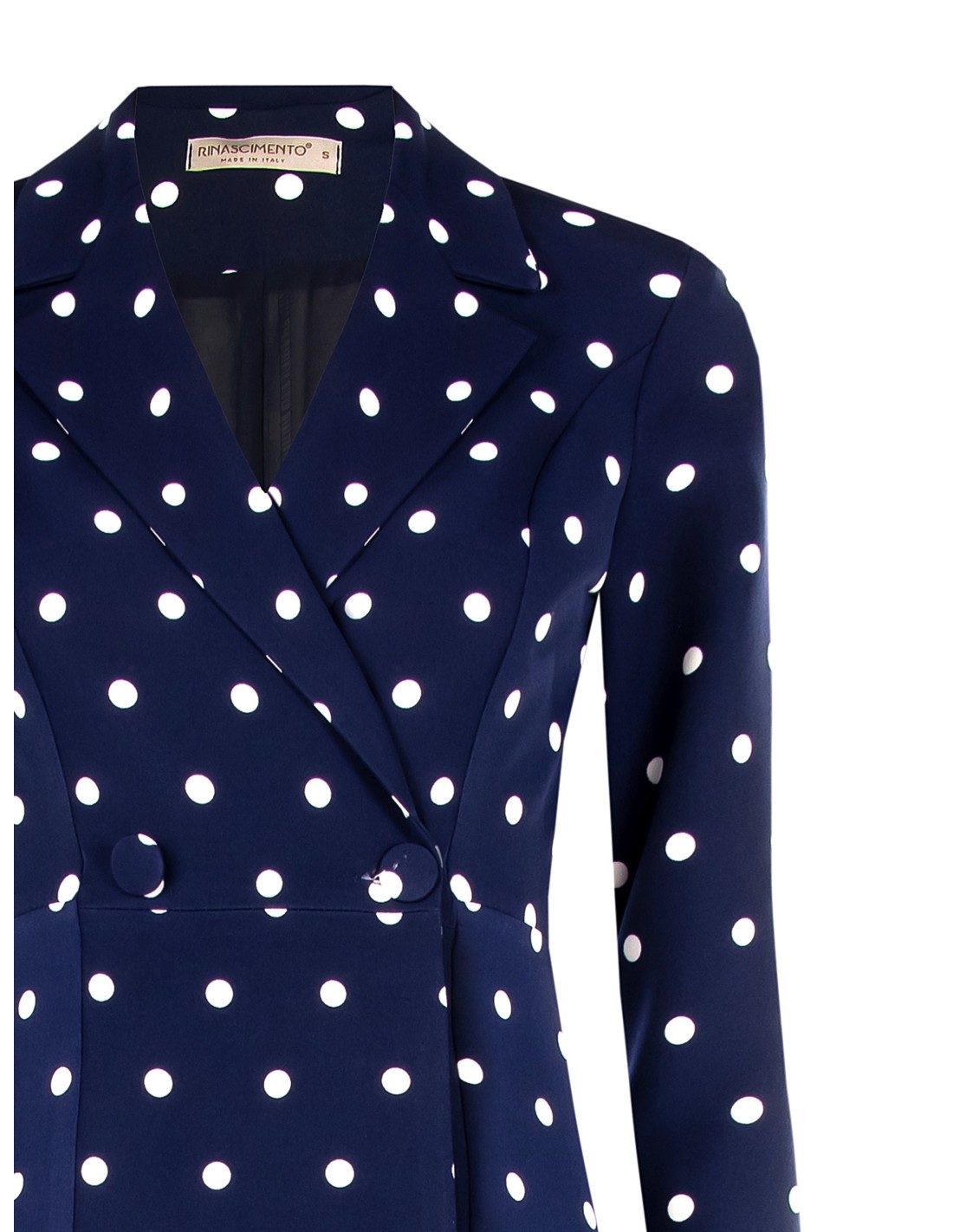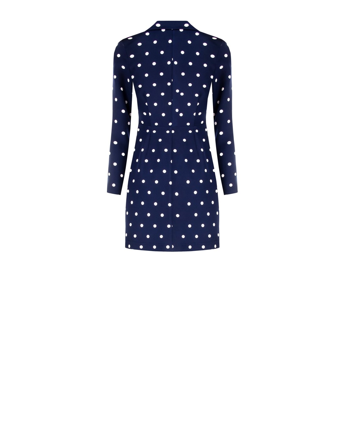 Vestido curto com corte tipo blazer, corte justo que realça a cintura. Confeccionado em tecido fluido com estampa de bolinhas e fecho cruzado com botões forrados. Gola de lapela e mangas compridas, perfeito do escritório ao aperitivo.