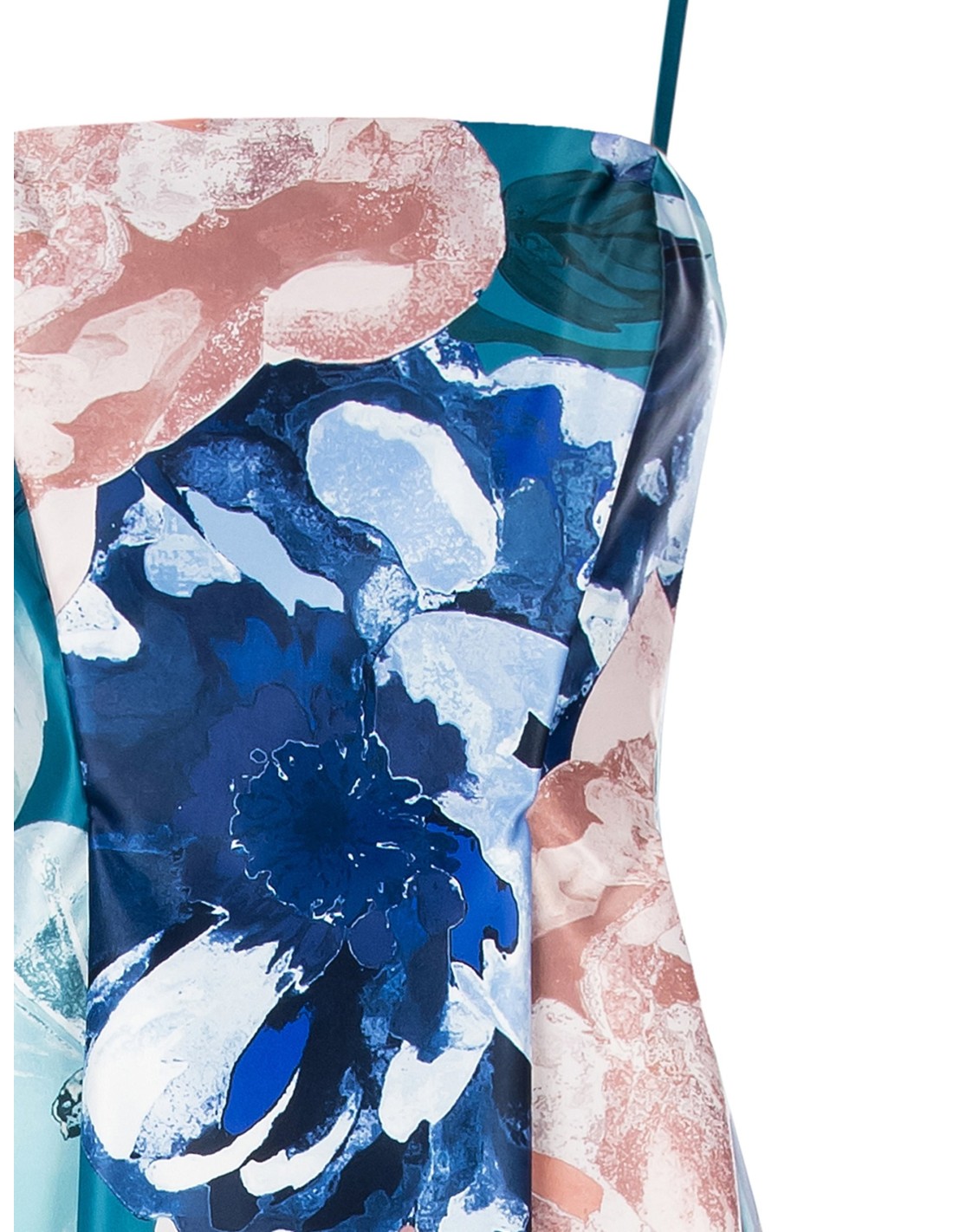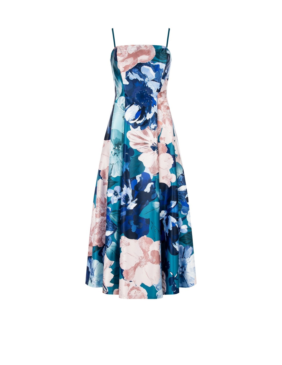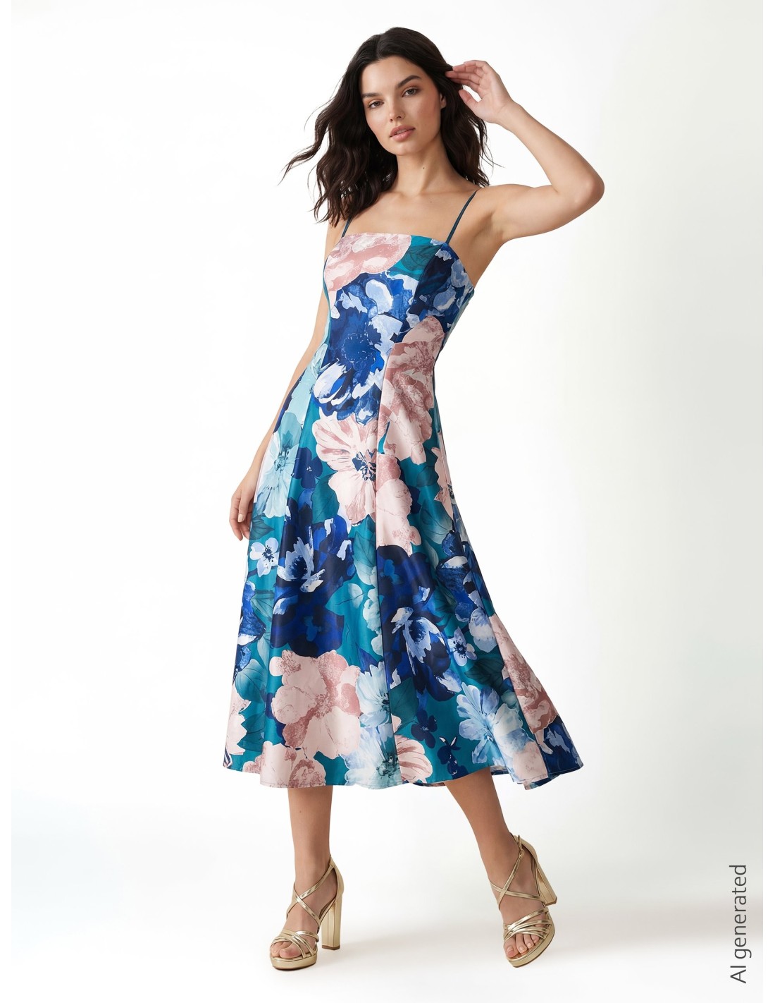 Linha evasê que acaricia a cintura e cai macia até à panturrilha, em tecido brilhante com toque sedoso. Corpete justo com decote recto e alças finas, fecho invisível nas costas. Perfeito para cerimónias, festas de verão e cocktails ao ar livre.
