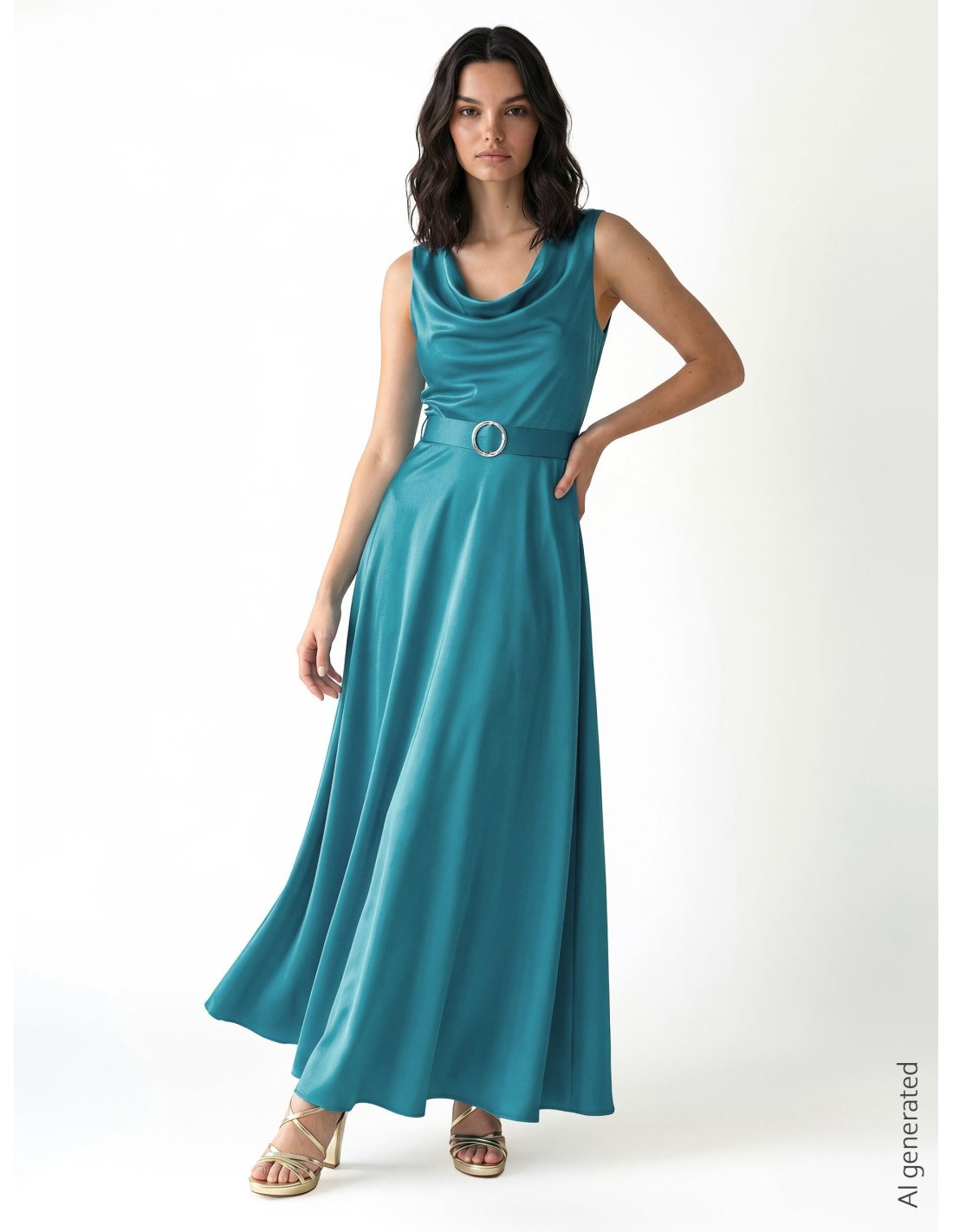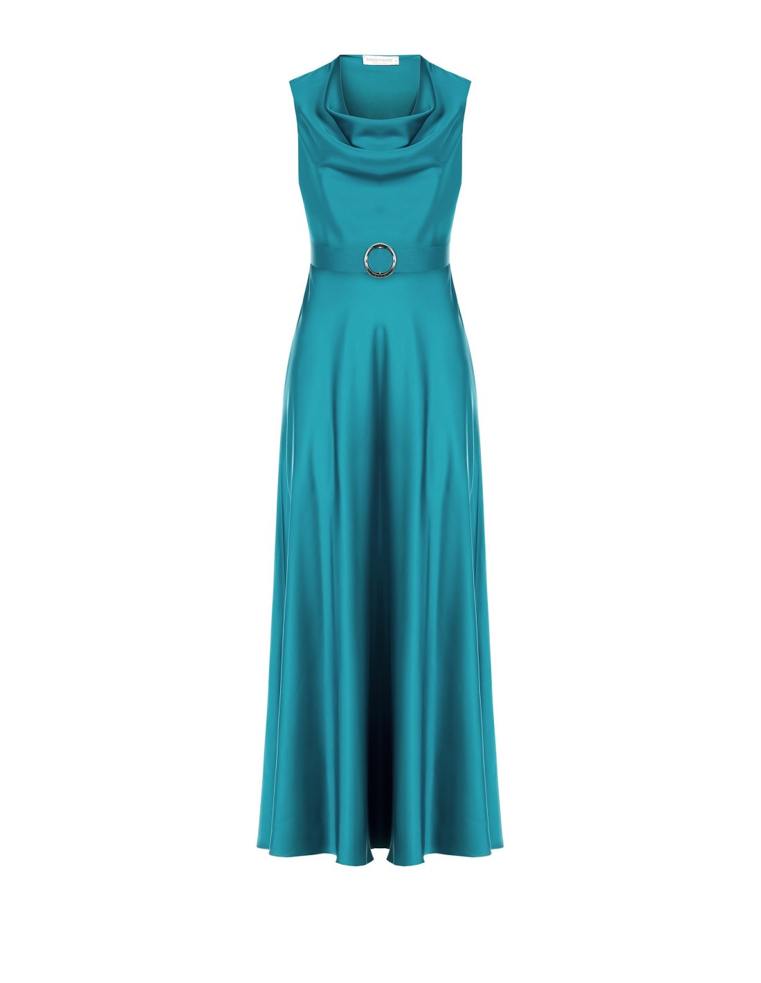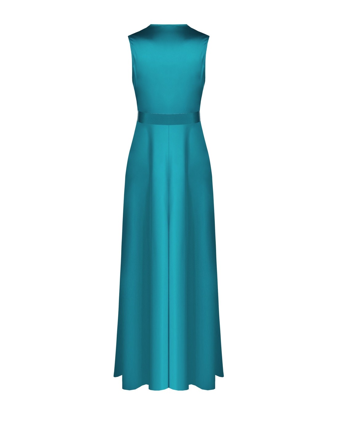 Vestido longo Rinascimento de corte evasê que envolve a cintura e desliza suavemente pelos quadris. Confeccionado em tecido acetinado brilhante, valoriza o decote com um corte suave em cascata. Perfeito para cerimónias, cocktails e noites especiais.