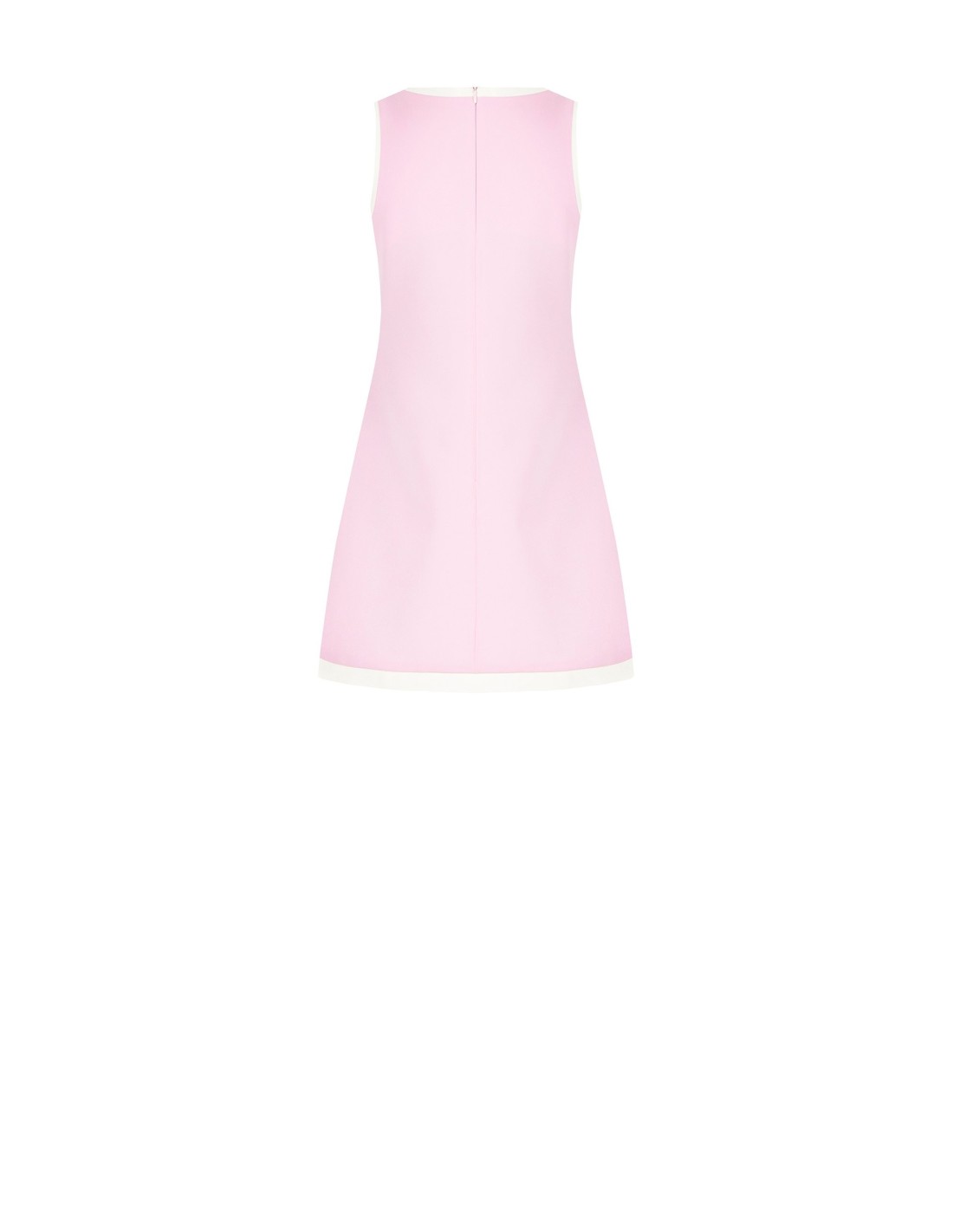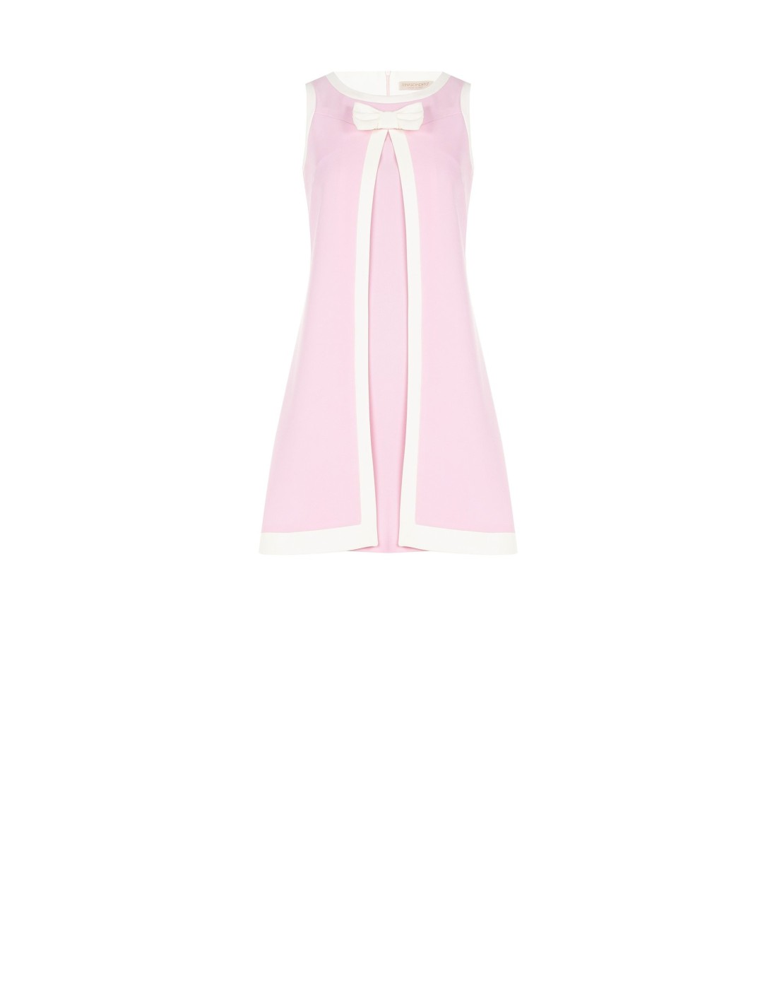 Minivestido Rinascimento de corte evasé em tecido fluido que acaricia a silhueta sem marcar. O laço no decote e o painel frontal com ribetes contrastantes iluminam o look. Perfeito para cerimónias, festas elegantes ou para o escritório com um blazer.