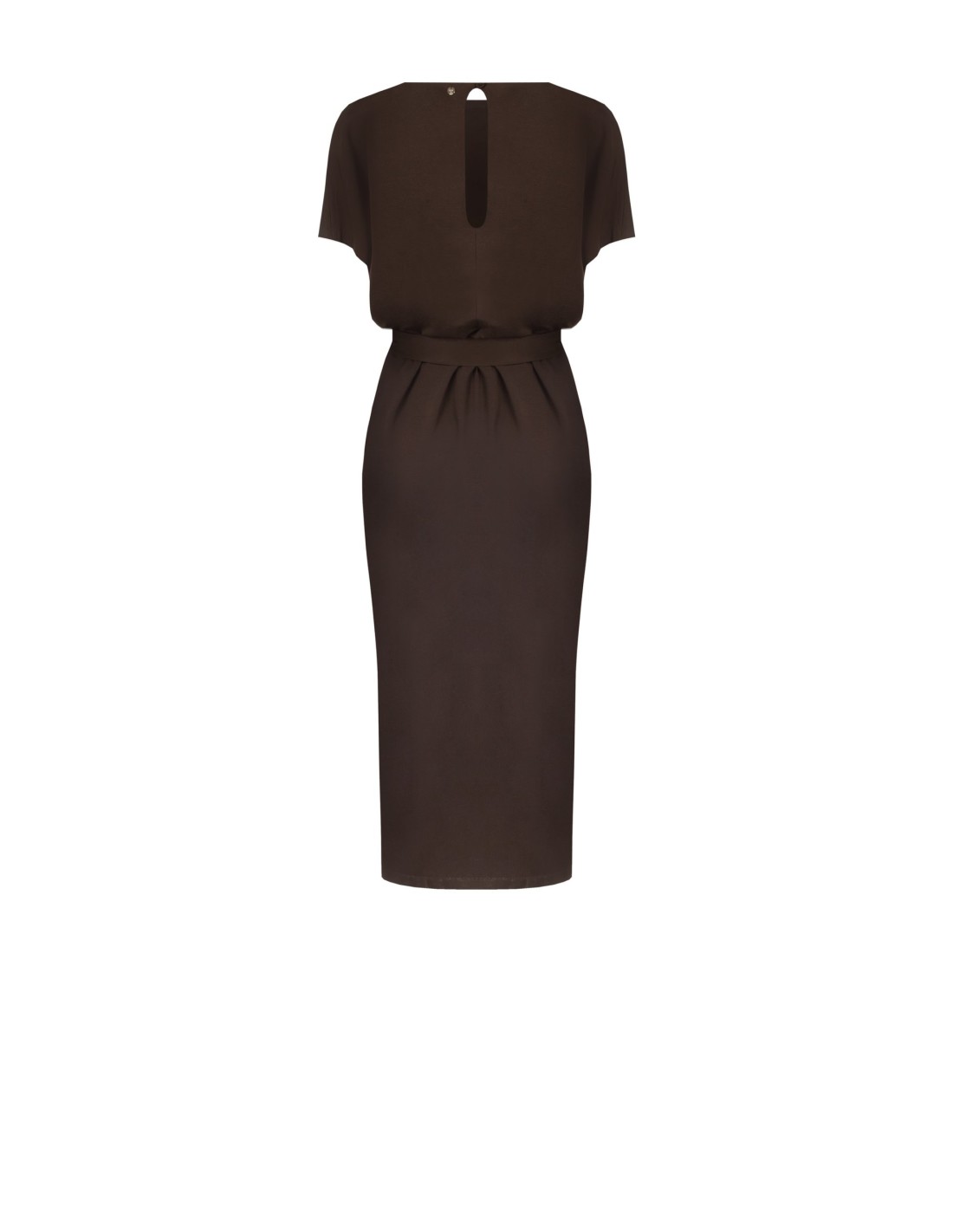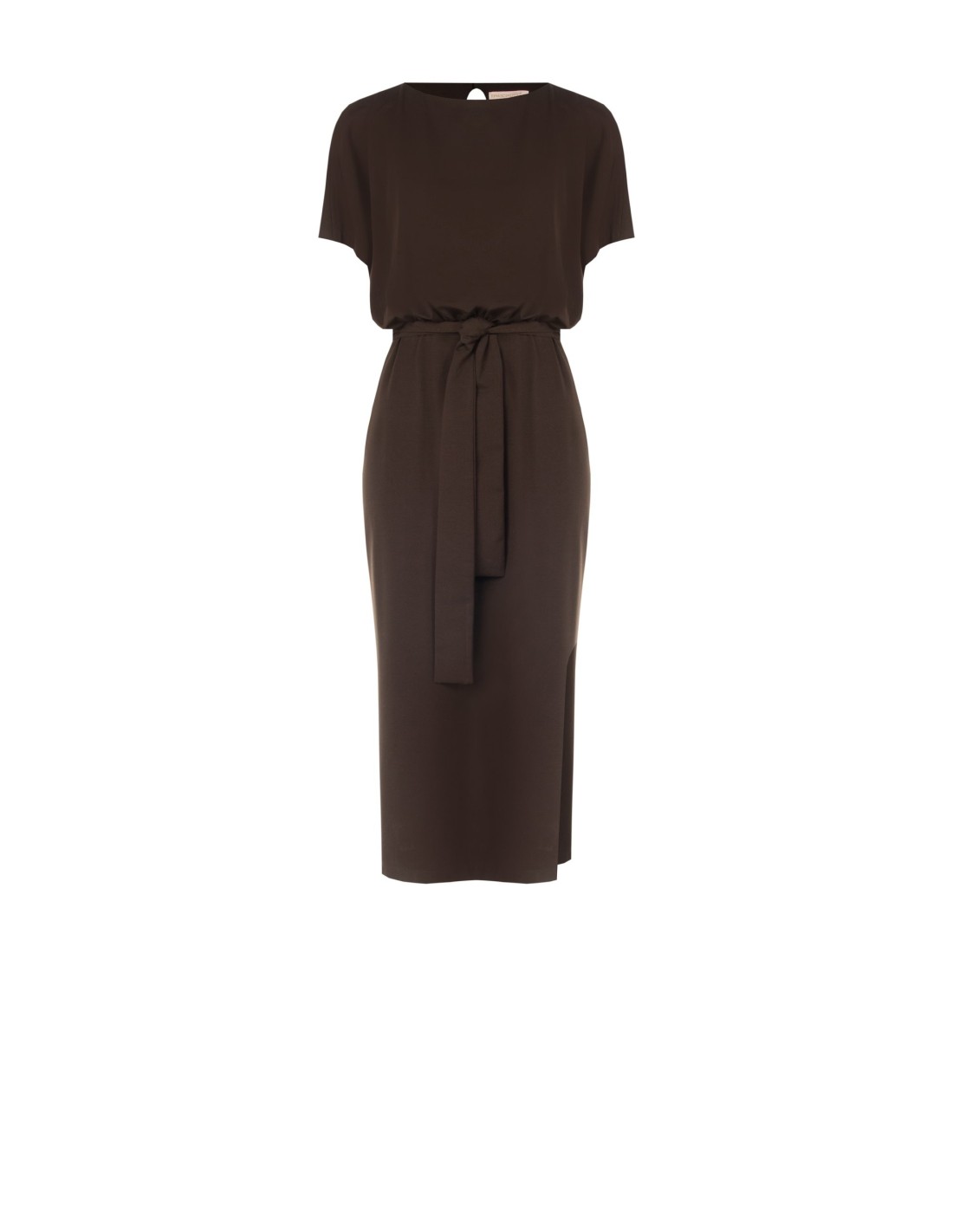 Linha midi suave que acompanha as formas, em tecido fluido e confortável. O cinto para atar realça a linha da cintura, a fenda lateral alonga a silhueta, o pormenor em gota na parte de trás acrescenta uma sensualidade discreta. Perfeito do escritório ao aperitivo.