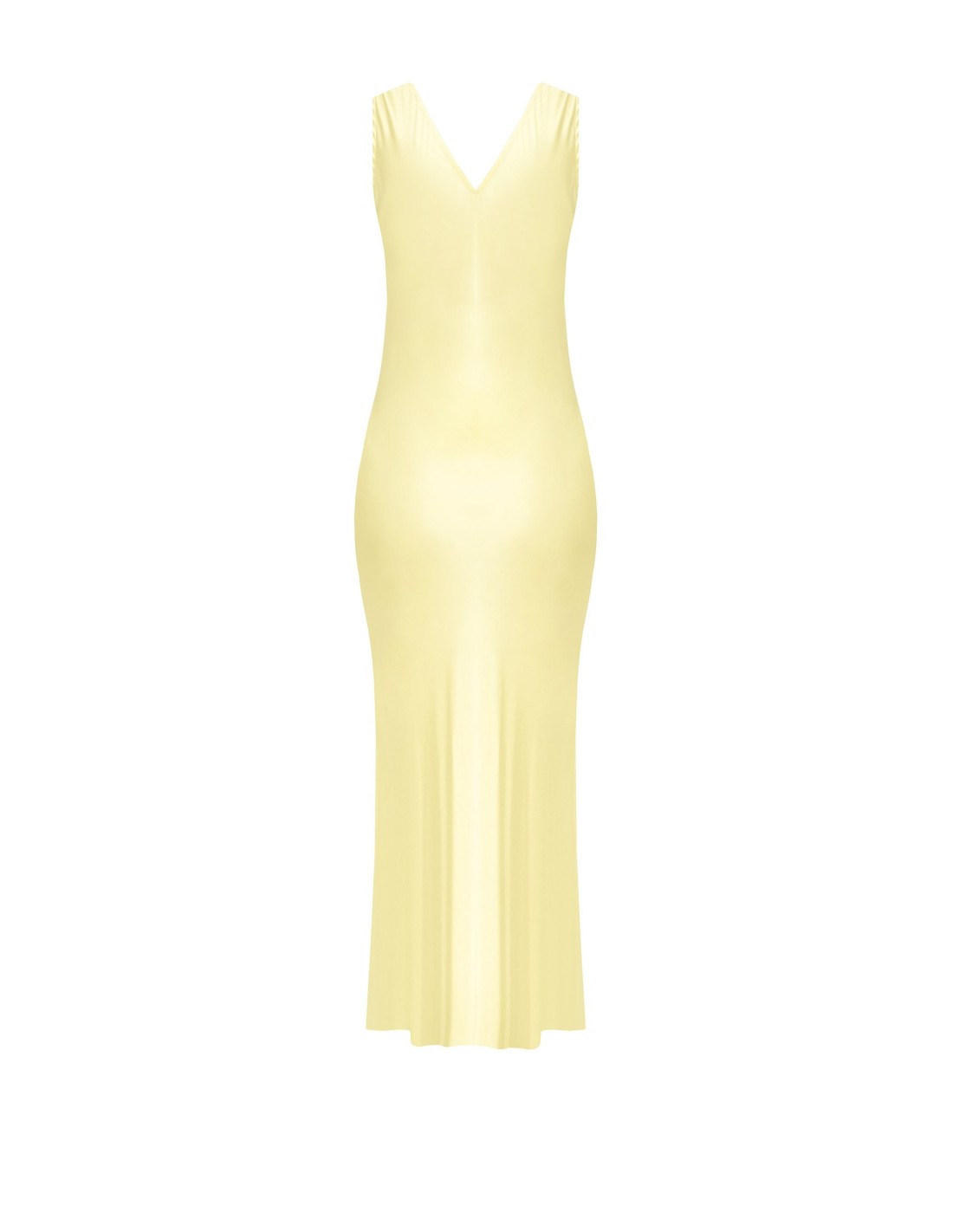 Vestido longo de corte fluido, em cetim fluido que acaricia a silhueta com conforto e leveza. O decote em V com acabamentos em renda e o laço frontal acrescentam um toque delicado e feminino. Perfeito para festas, jantares especiais ou ocasiões noturnas.