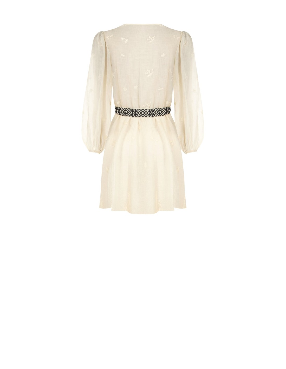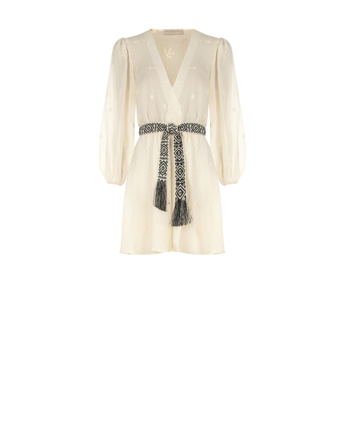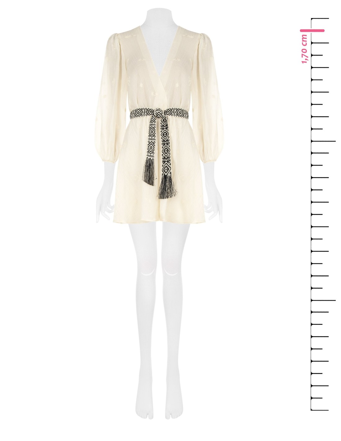 Minissaia de corte suave e feminino, em tecido leve com delicados bordados por toda a peça que acariciam a silhueta com conforto. O decote em V cruzado e o cinto jacquard com franjinhas definem a cintura. Perfeito para brunches, fins de semana na cidade e aperitivos especiais.