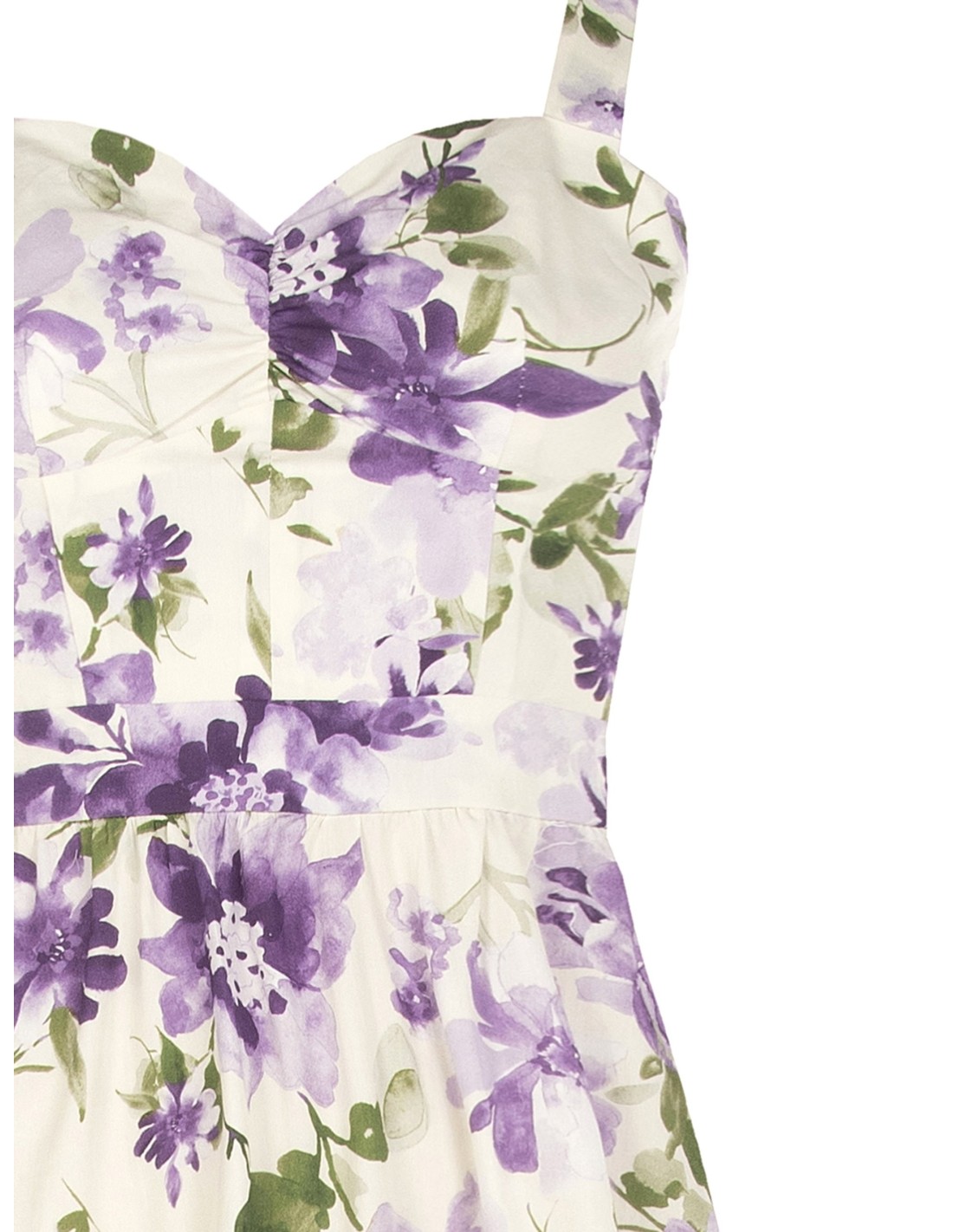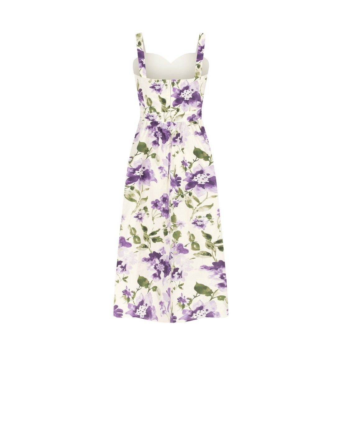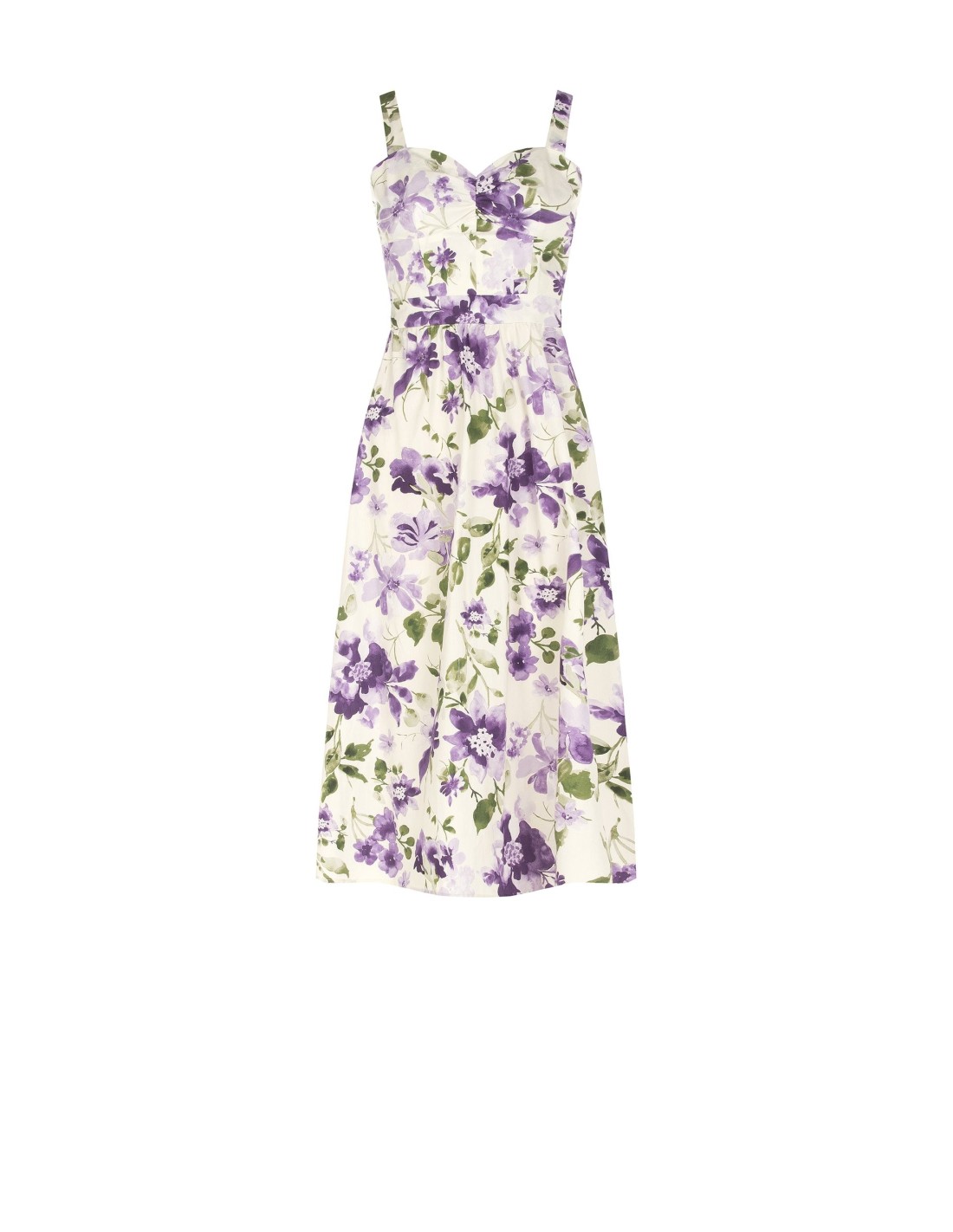 Midi de corte evasé, em tecido leve e fluido com estampa floral de efeito aquarela. O decote em coração e o corpete modelado valorizam a silhueta, enquanto a saia ampla acompanha os movimentos com conforto. Perfeito para cerimónias, festas e ocasiões especiais diurnas.