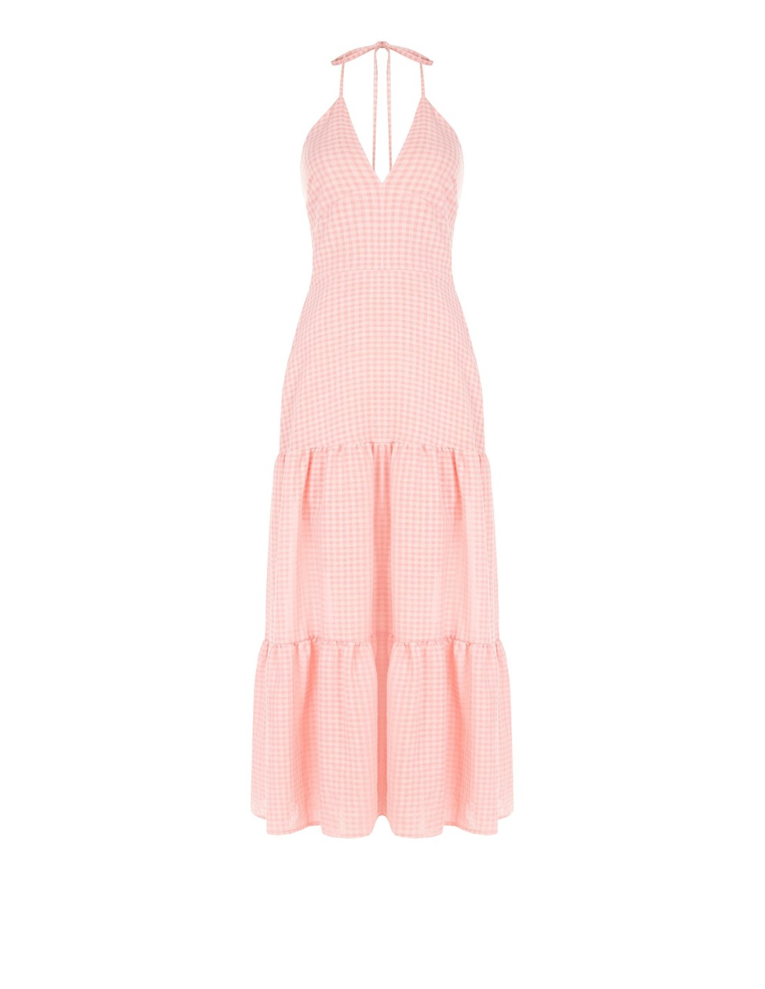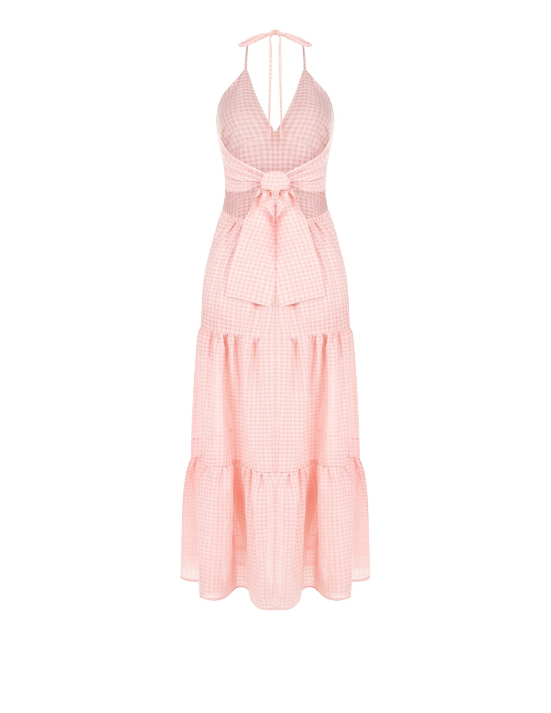 Longo e fluido, acaricia a silhueta com um corte suave que alonga sem apertar. O tecido leve com textura vichy confere frescura e conforto, enquanto o decote profundo e o laço na parte de trás acrescentam feminilidade. Perfeito para festas de verão, férias e elegância do dia a dia.