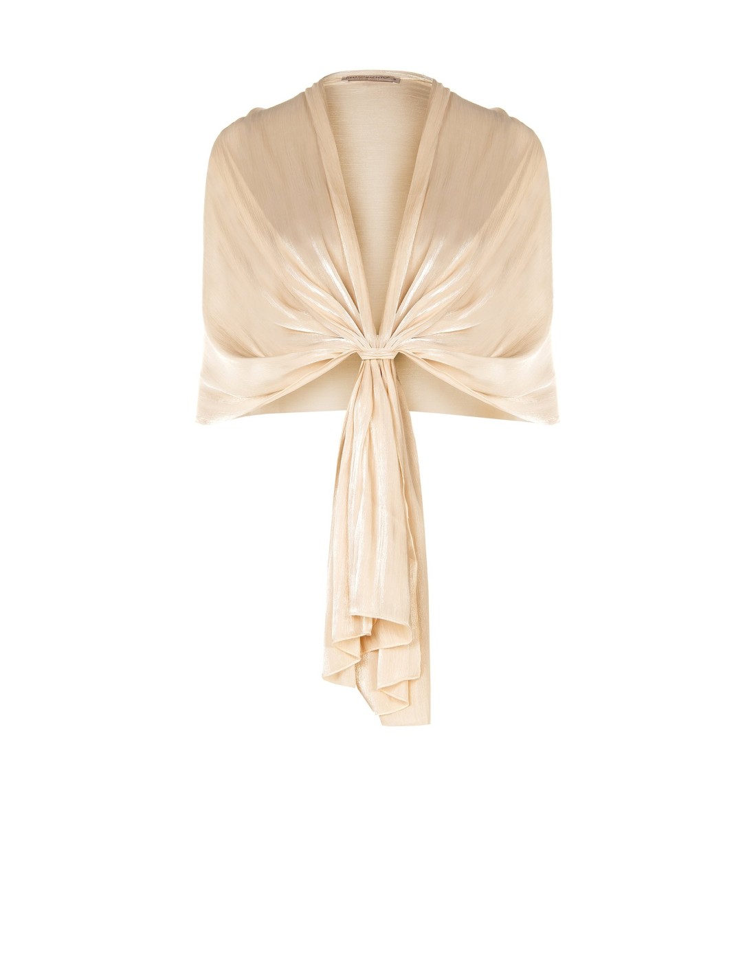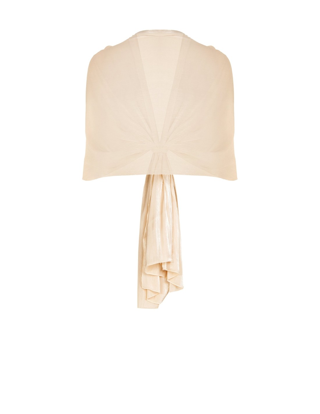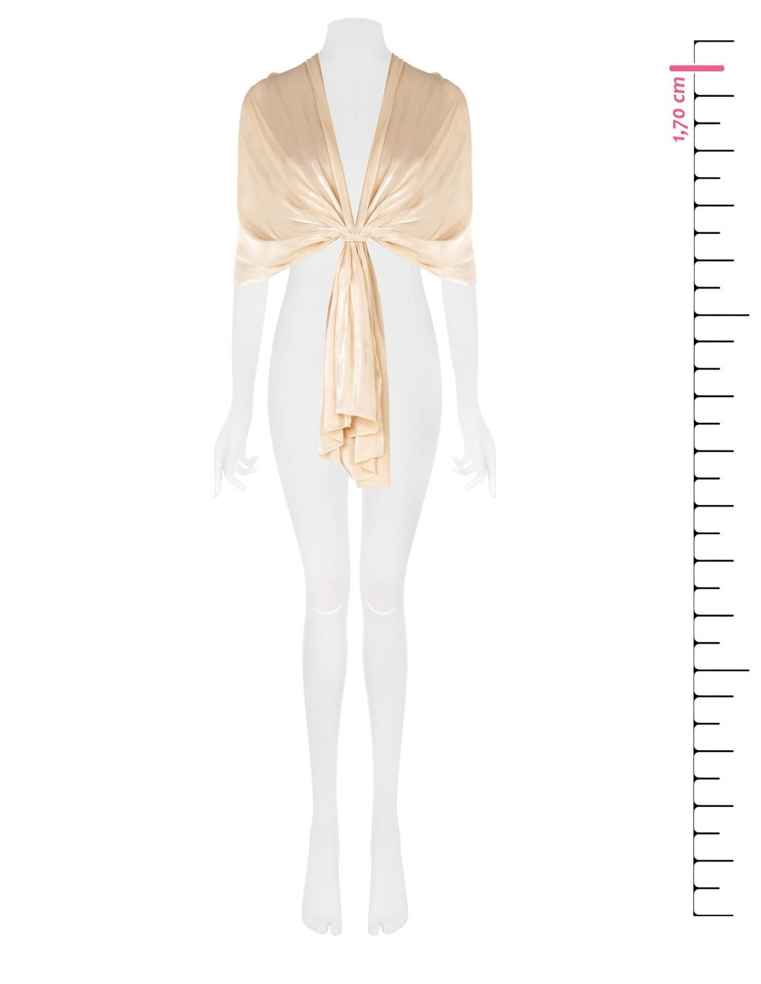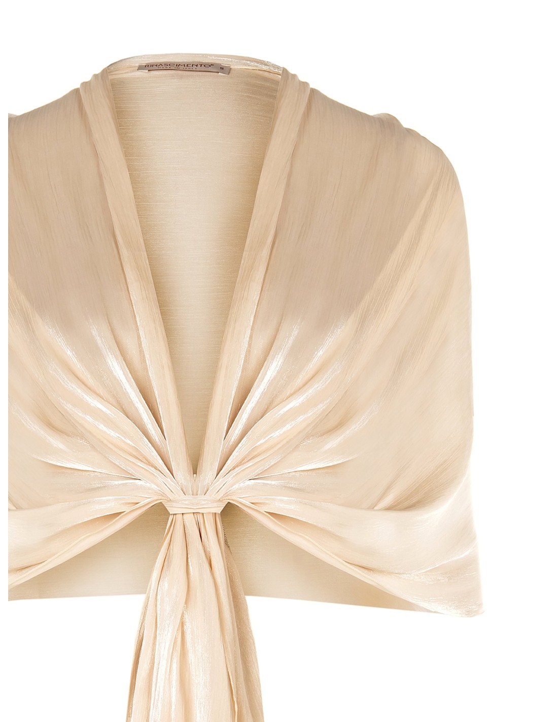 Estola fluida em tecido leve e luminoso, de corte suave que envolve os ombros com naturalidade. O nó frontal cria drapeados elegantes e alonga a silhueta. Perfeita sobre vestidos de cerimónia ou looks de noite para um toque sofisticado.