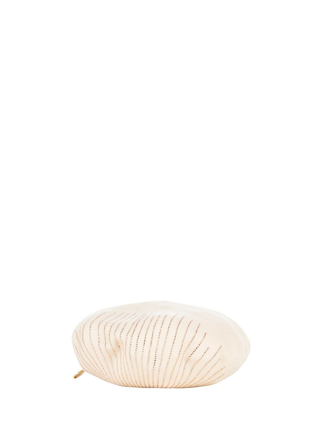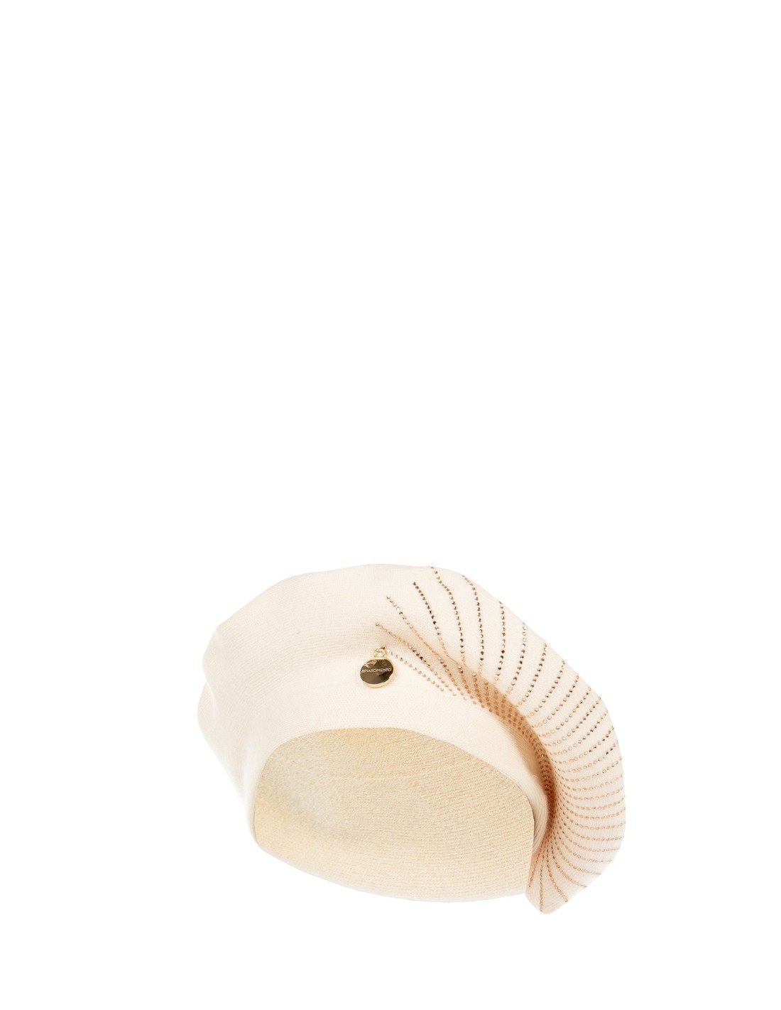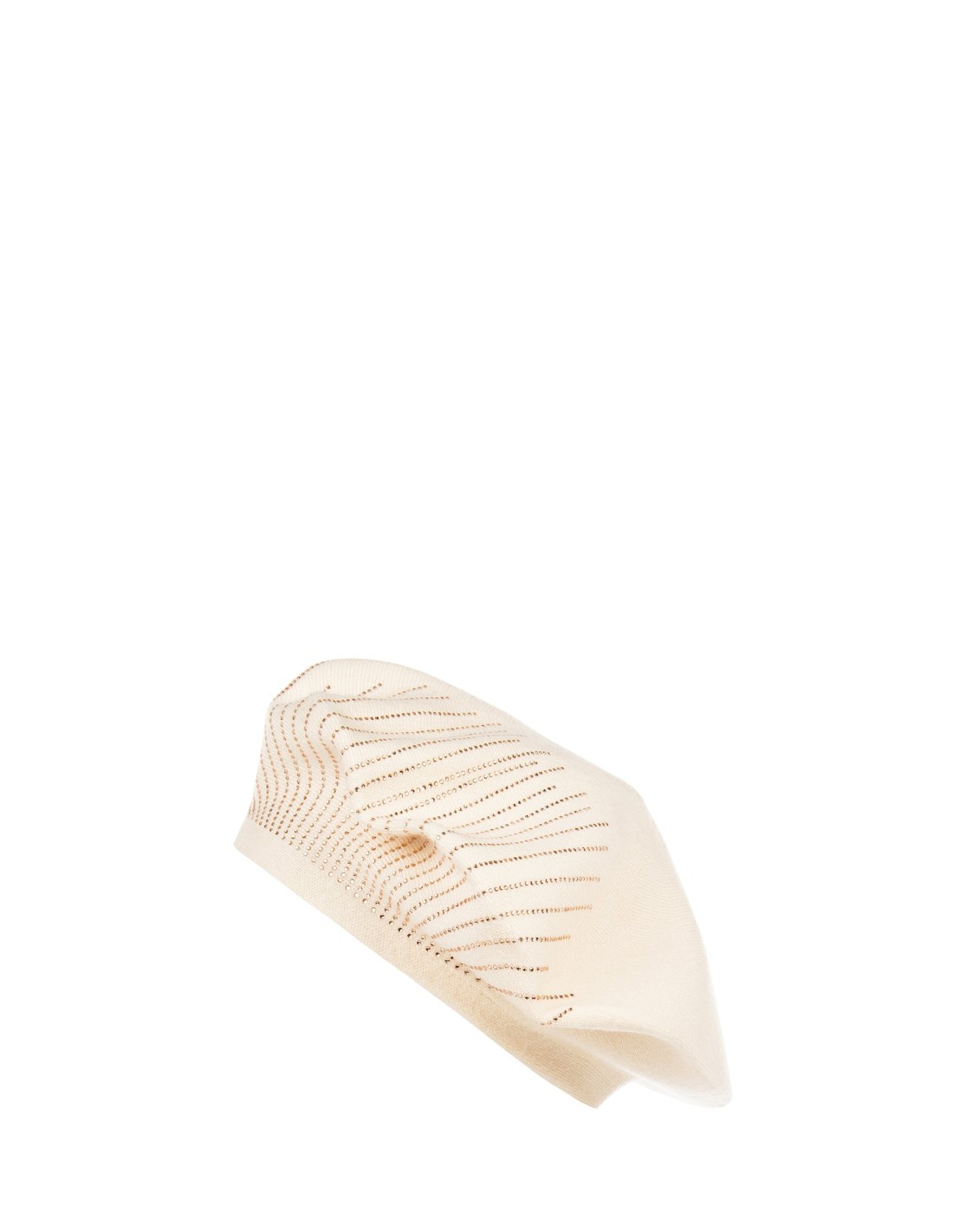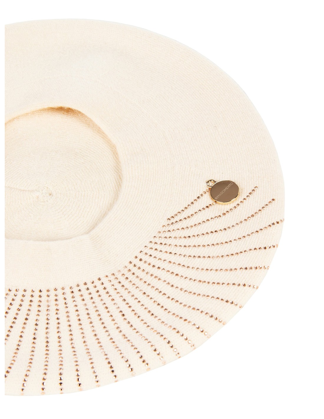 Basco em malha com uma prova macia e confortável, ideal para emoldurar o rosto com natural elegância. A textura suave é destacada por aplicações luminosas em formato radial e uma medalha com logo. Perfeito para elevar looks do dia a dia, city chic ou um aperitivo noturno.