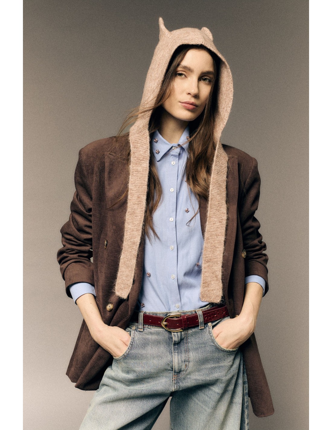 Capuz com cordões de fecho em malha texturizada de mistura de lã.