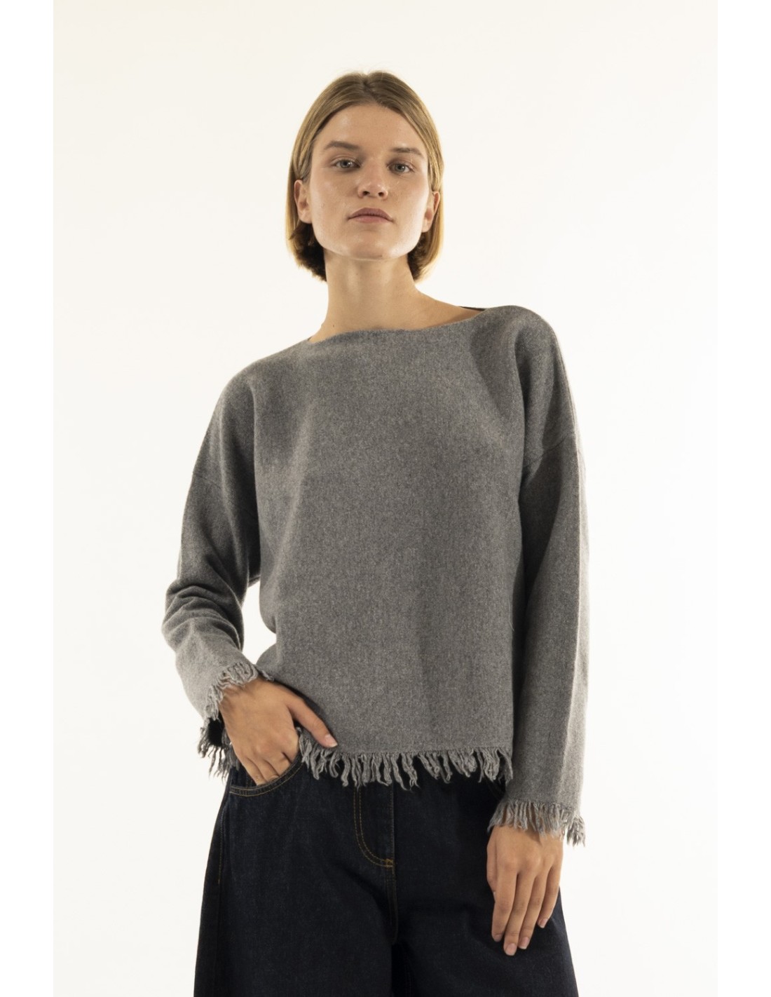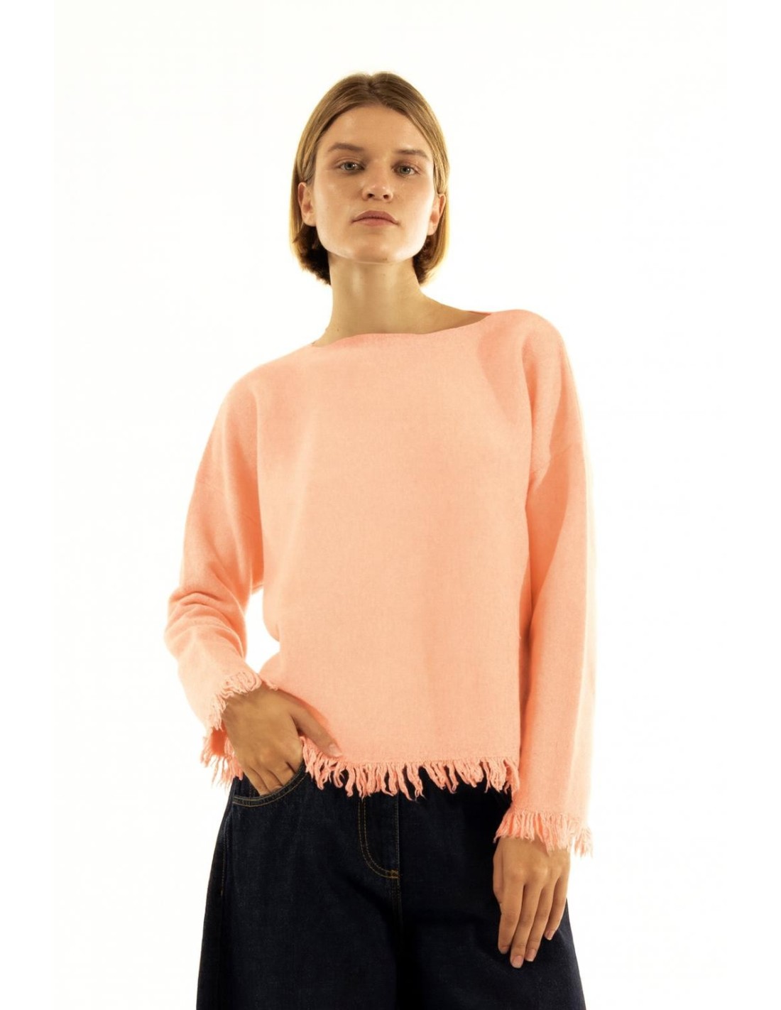 Camisola Kontatto com corte solto e ligeiramente boxy que valoriza a silhueta sem a apertar. Malha macia com efeito escovado para um conforto caloroso. Decote barco e franjas na base e nos punhos que acrescentam movimento. Ideal para o escritório com calças de alfaiataria ou para o dia a dia com denim.