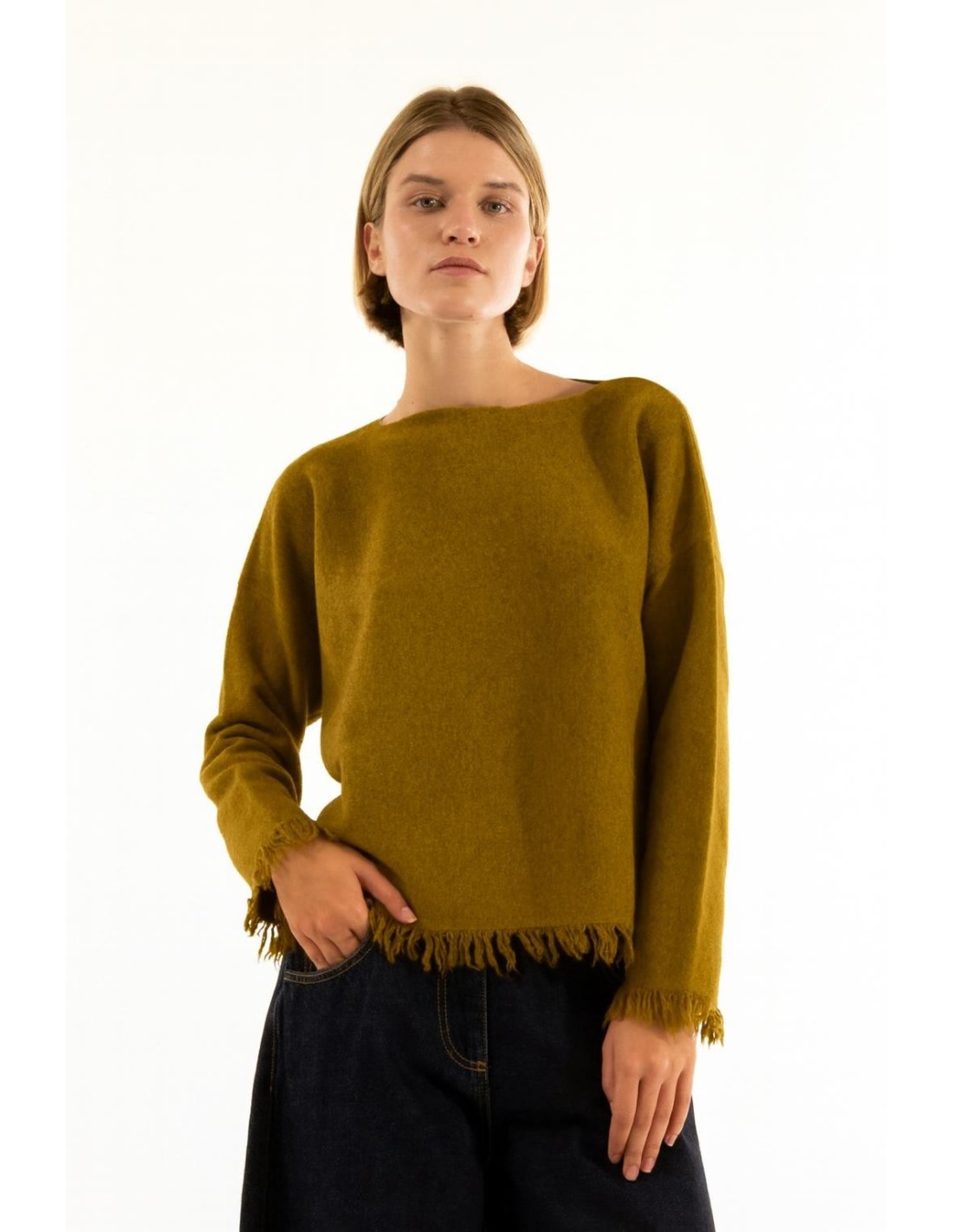 Camisola Kontatto com corte solto e ligeiramente boxy que valoriza a silhueta sem a apertar. Malha macia com efeito escovado para um conforto caloroso. Decote barco e franjas na base e nos punhos que acrescentam movimento. Ideal para o escritório com calças de alfaiataria ou para o dia a dia com denim.