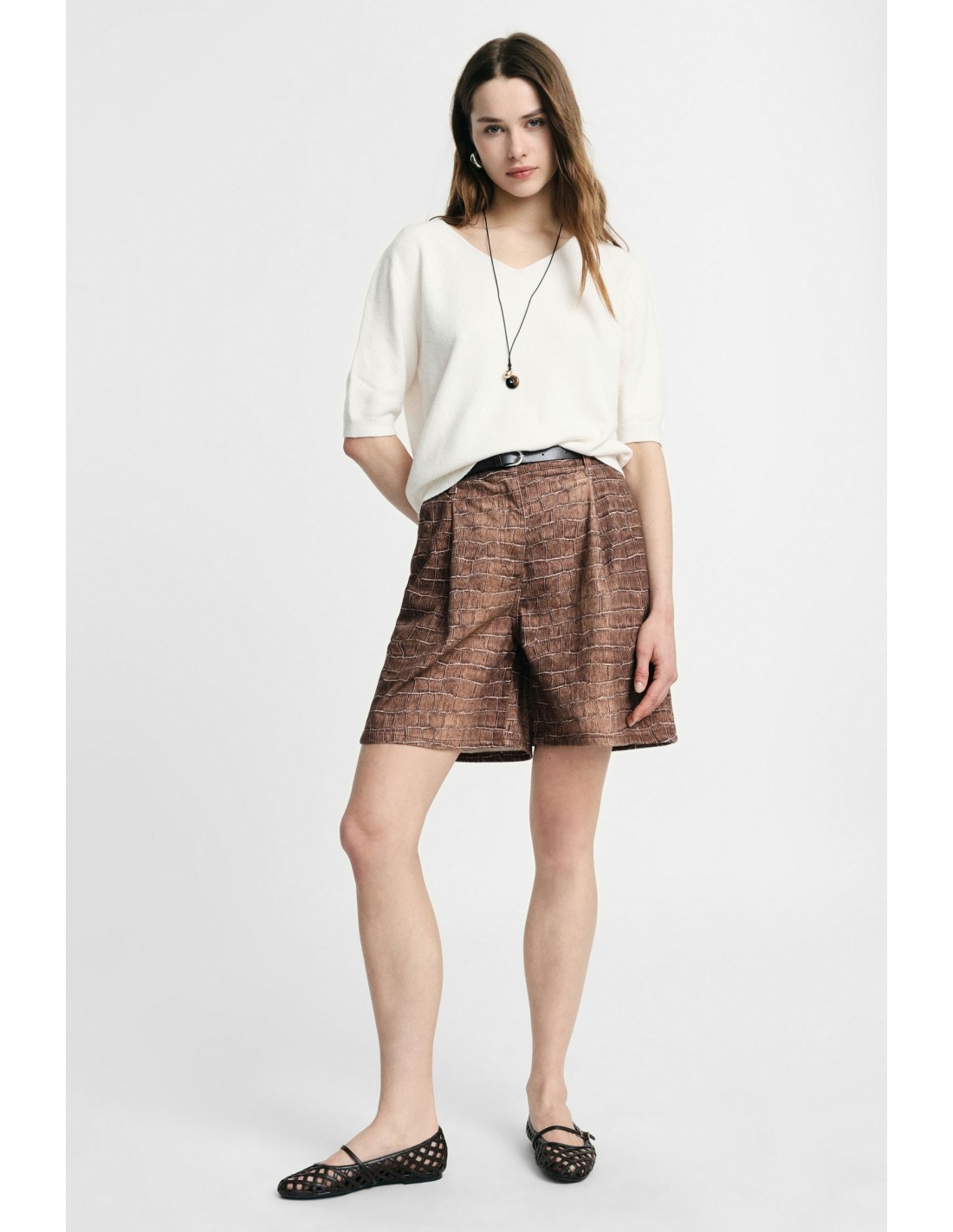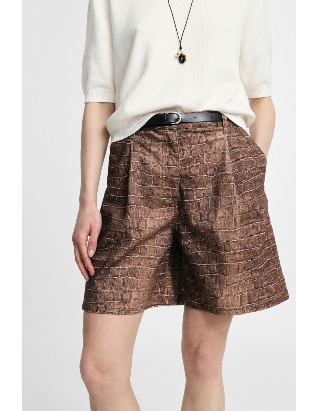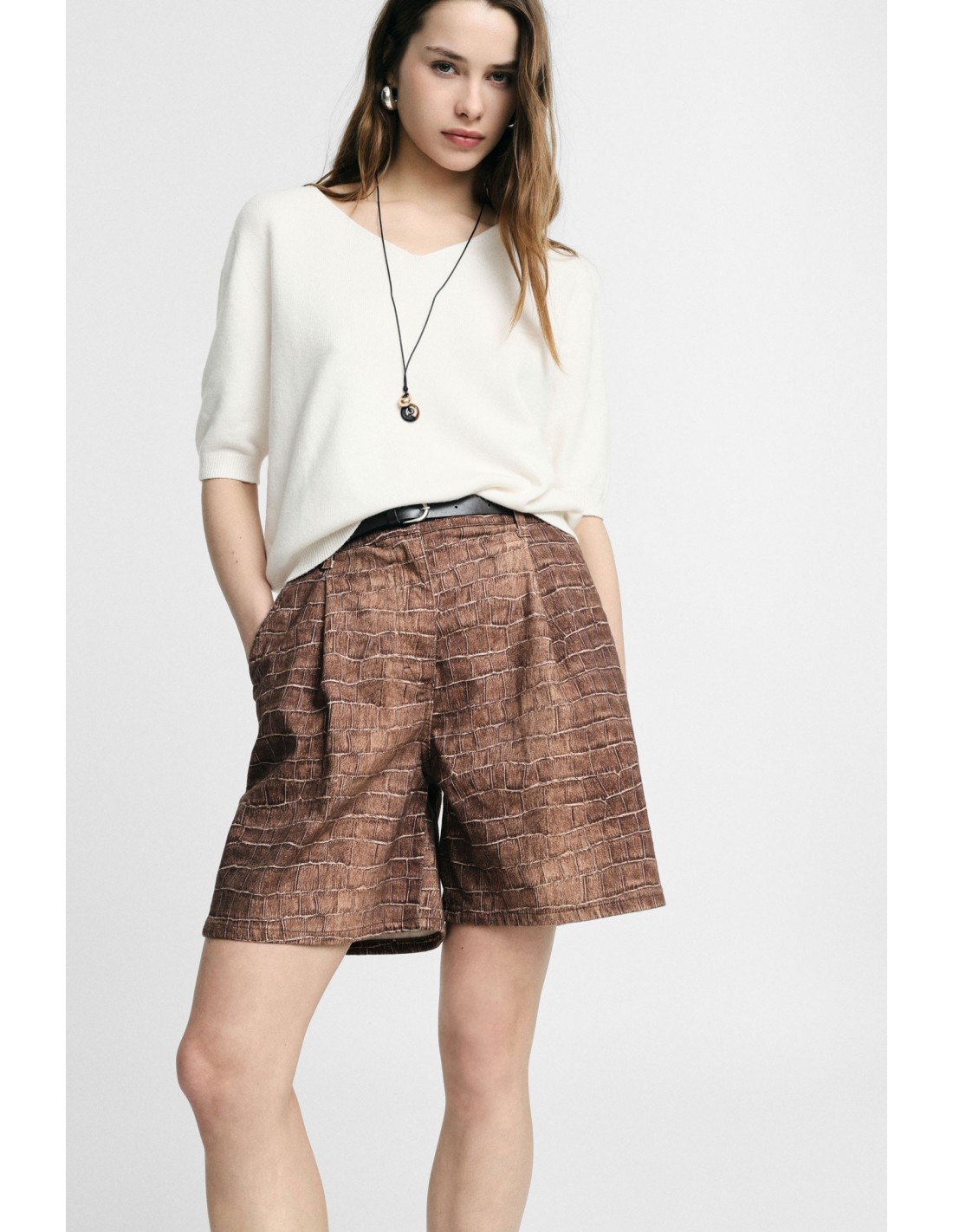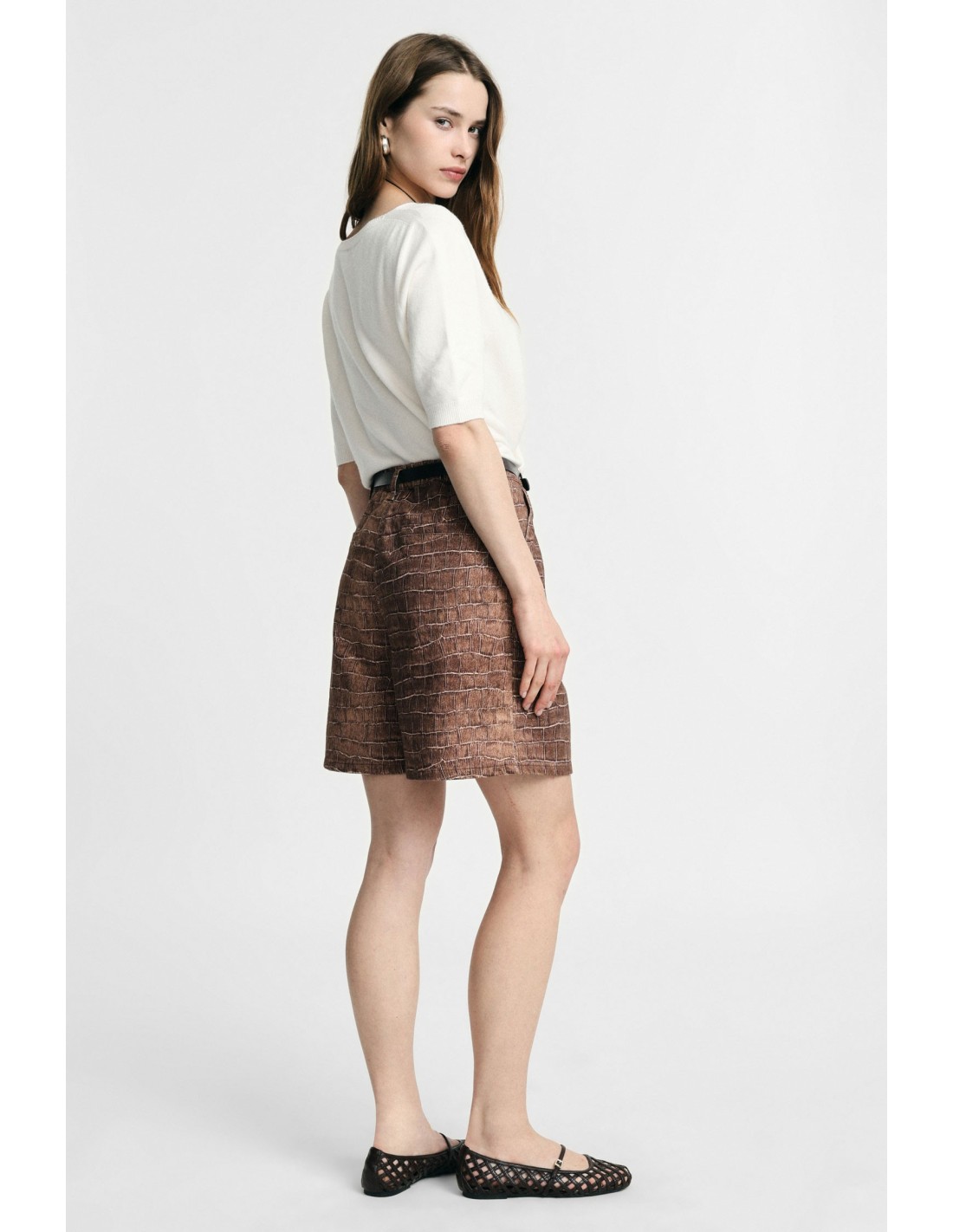 Esta bermuda de corte descontraído com cintura integrada e estampa efeito crocodilo dá um toque marcante a qualquer look urbano. Bolsos laterais práticos e comprimento acima do joelho tornam este modelo versátil para a cidade ou para momentos off-duty. Experimenta combinações fora do comum e deixa espaço para a tua energia metropolitana.